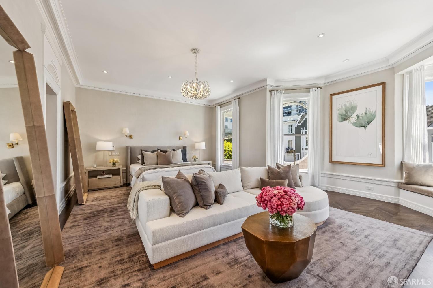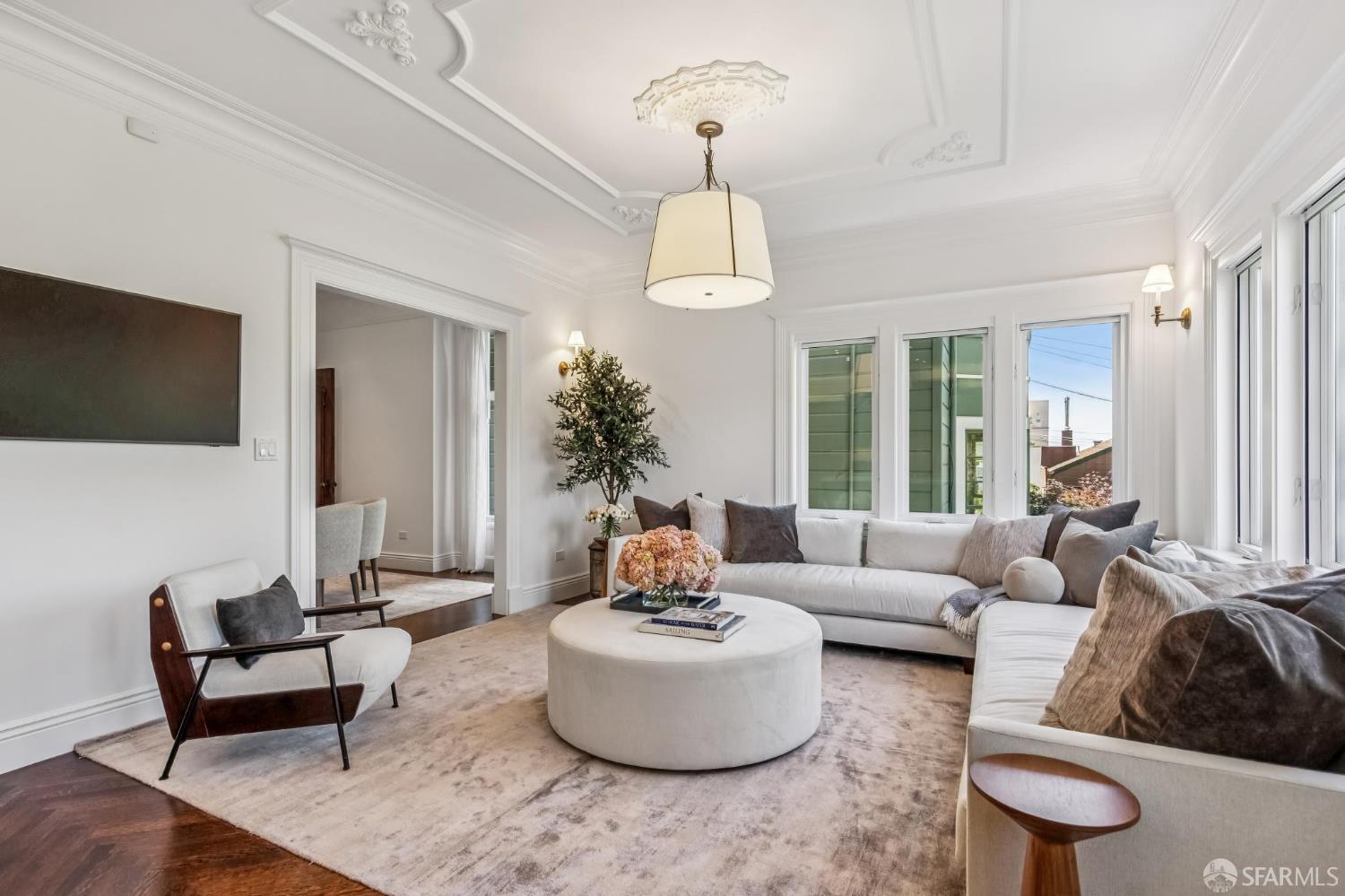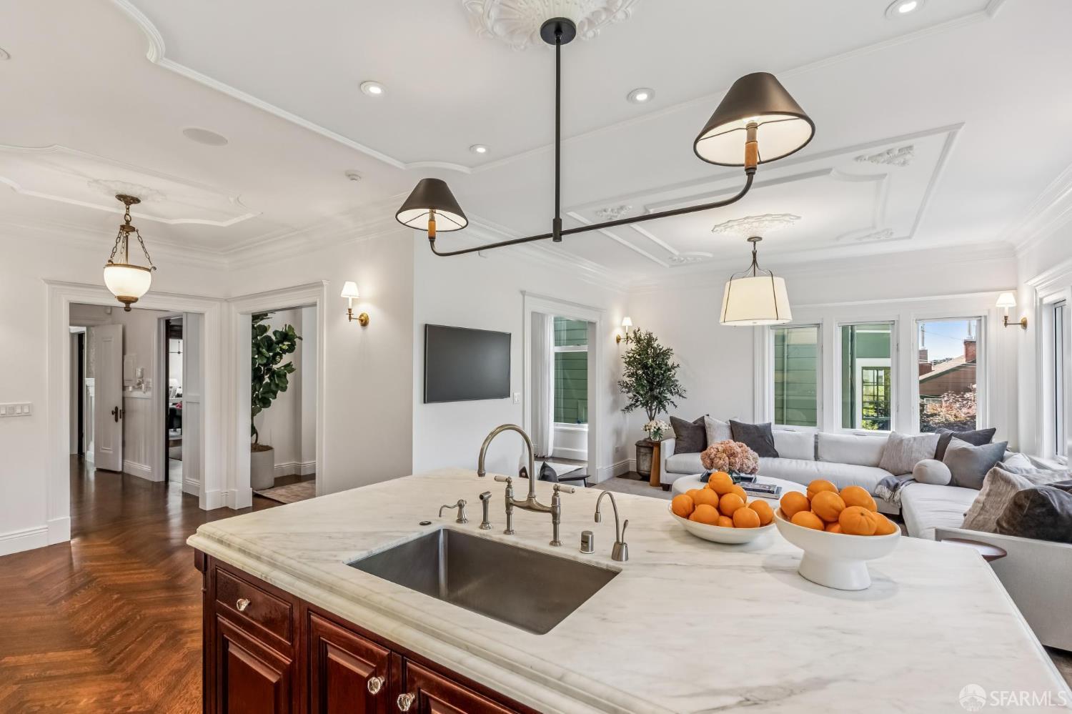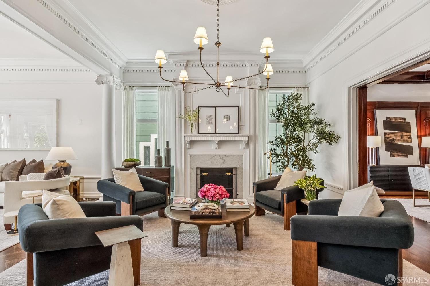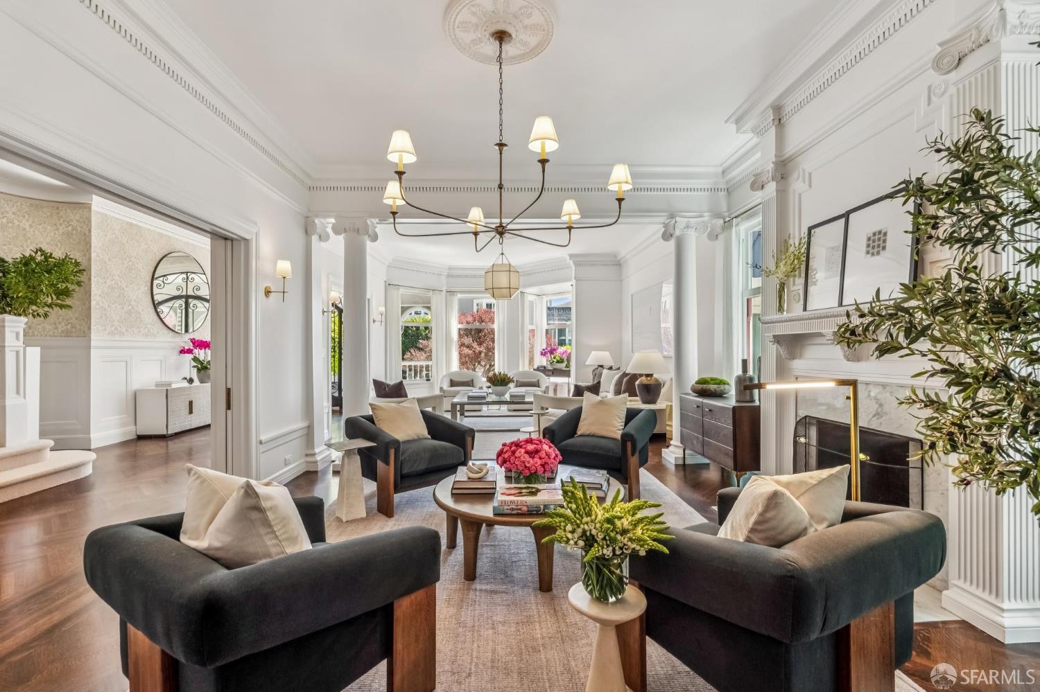 Set in the heart of Pacific Heights, this extraordinary fully detached Queen Anne Victorian offers a rare blend of historic grandeur, modern livability, and iconic San Francisco outlooks. Encompassing six bedrooms, five and a half baths, and positioned on an unusually expansive 34 by 127 lot, this exceptional residence is a true legacy property, rich in character, meticulously maintained, and thoughtfully updated for contemporary living.Built in 1891 by Newsom and Newsom, their vision is displayed today with a home filled with natural light on all sides. Its whimsical fade features a turret with porthole windows, a keyhole arch, and a fabulous ornate glass and iron entry door.Inside, a grand foyer opens to a rare triple parlor layout with formal living, sitting, and dining rooms, showcasing high ceilings, intricate moldings, and marble fireplaces. The renovated kitchen features Calacatta d’Oro marble, premium appliances, and a large island, flowing seamlessly into a breakfast area and family room with direct access to a landscaped garden. A powder room completes the level. The home perfectly balances San Francisco Victorian charm with modern the conveniences and floorplan of today. Upstairs, the full-width primary suite offers a turreted sitting area with city views, a massive dressing room+closet, and a bathroom with a stall shower and clawfoot soaking tub. The 3 additional bedrooms on this level are bright and spacious with the northern bedrooms offering views of theGolden Gate Bridge. The topfloor, which is a legal 2nd unit, includes a large family room with a walkout view deck, huge bedroom suite with bathroom, a 2nd bedroom used as an office, a full bath in the hall, and a second kitchen/ laundry room.The home’s lower level is the perfect place for family, adult or children hangouts. The Media/lounge area is great for social gatherings of all ages. This level also includes a bathroom and tons of storage. Interior access from the garage and a landscaped garden complete this grand residence. When you combine this wonderful home with it’s incredible location, steps to Lafayette Park, North Side schools and a short walk to Fillmore St and all its shops and restaurants you truly have a one of a kind home.