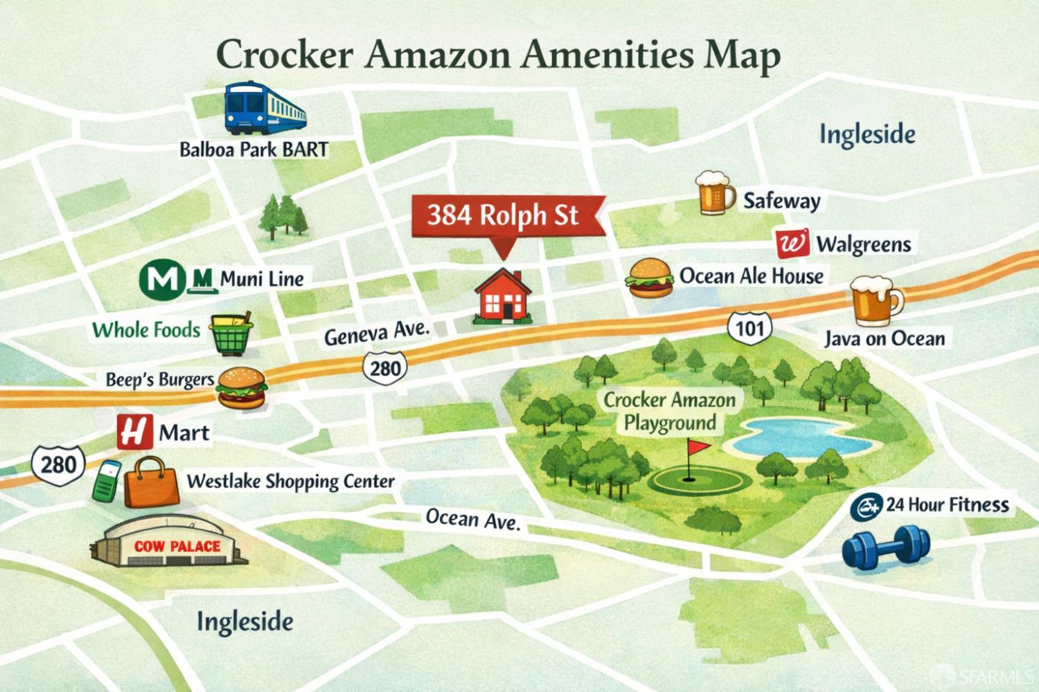 Beautifully renovated 3BD/3BA home blending classic charm with modern living. Bright open-concept layout featuring high ceilings, wood flooring, recessed lighting, and a spacious kitchen with quartz countertops, island, and stainless steel appliances. Flexible lower level ideal for in-law, office, or family room. Enjoy a private deck and rare flat backyardperfect for entertaining or gardening. Conveniently located near Geneva Ave with easy access to Hwy 101/280, Balboa Park BART, Muni Metro, and Ocean Ave amenities including Whole Foods Market, popular dining, Beep’s Burgers, and Java on Ocean. Close to parks, recreation, 24 Hour Fitness, and everyday conveniences. A perfect combination of space, comfort, and connectivity in a growing neighborhood.