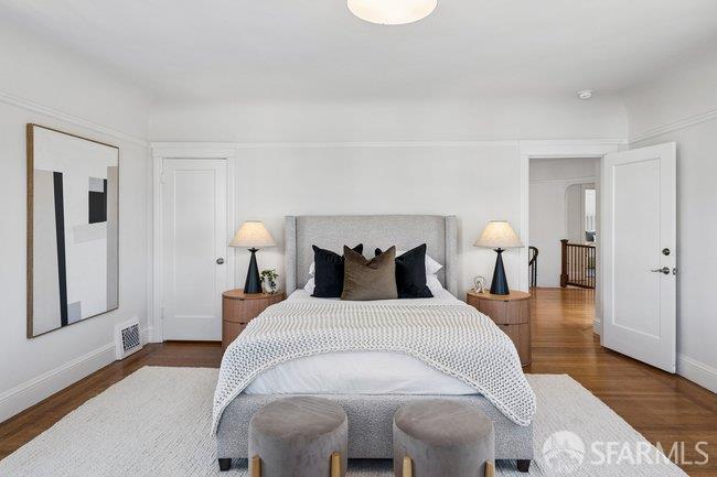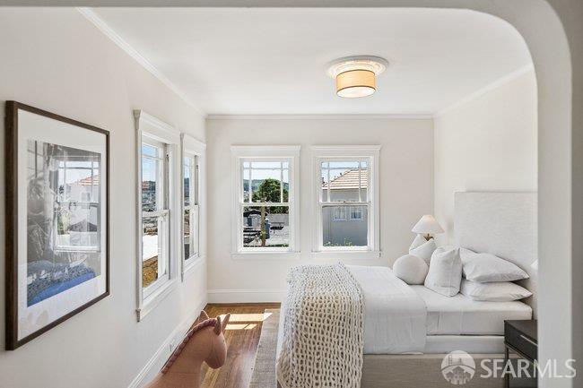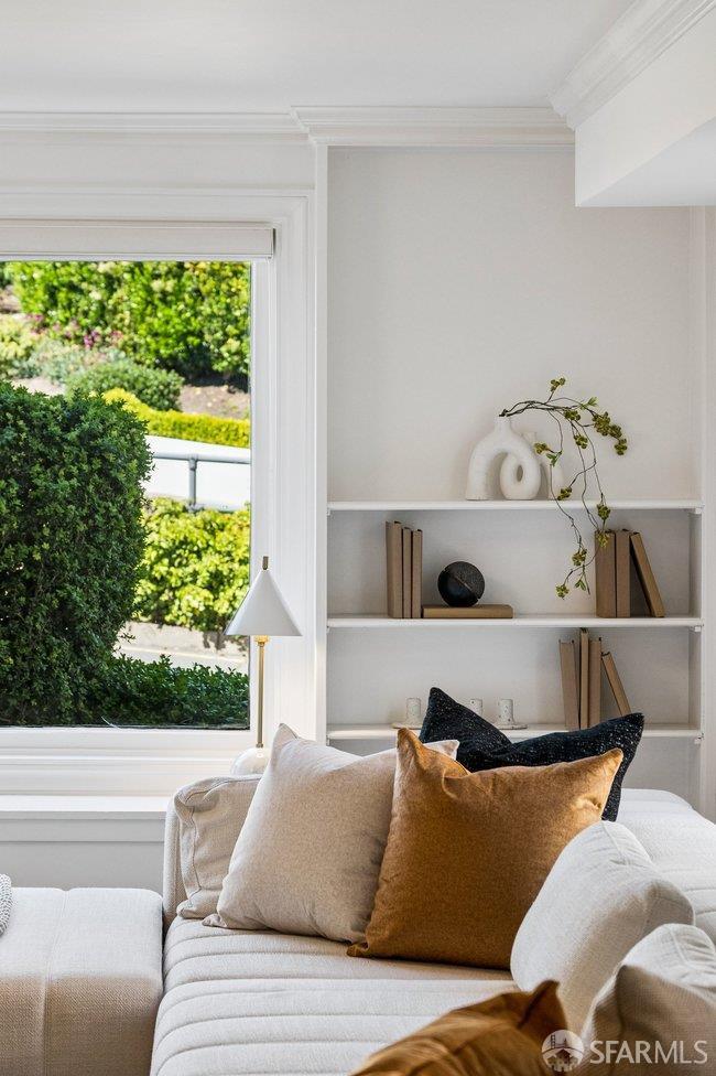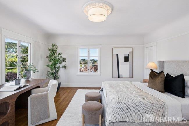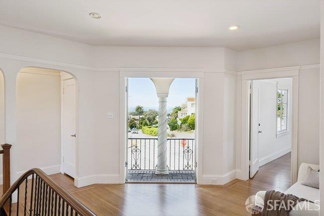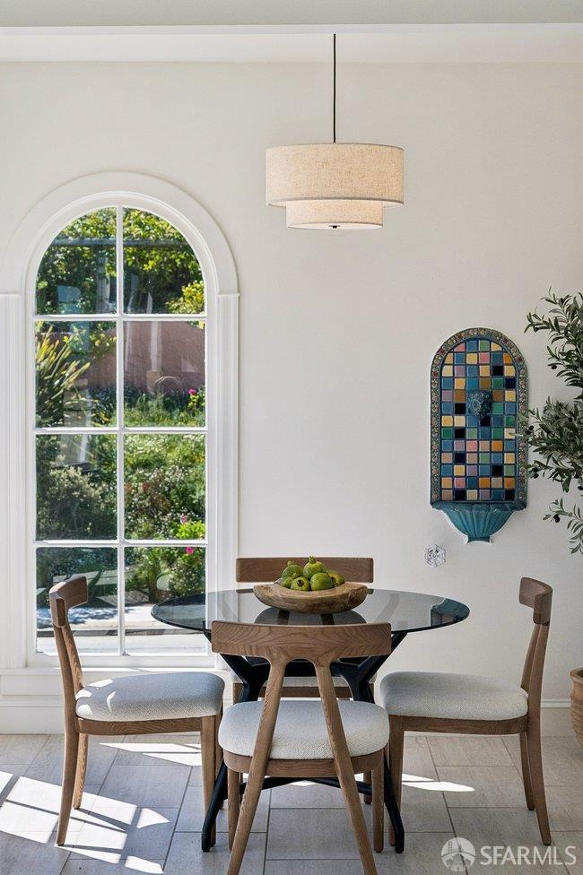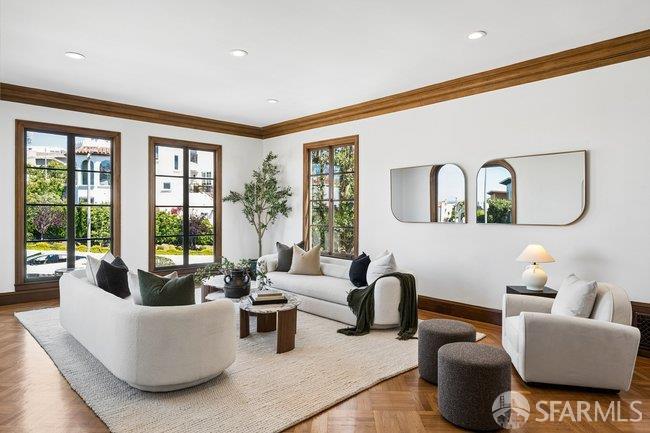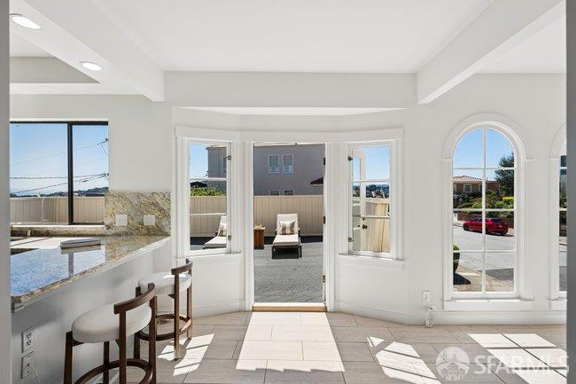 At the crest of Monterey Boulevard, where the city opens to sweeping southwestern horizons, 1185 Monterey Boulevard presents a poised balance of classic architecture and quiet modern refinement. Set behind an elegant facade, the home unfolds with an understated confidence; rooms of generous proportion, softened by natural light that moves easily from morning to late afternoon. Period details, subtle moldings, warm wood tones, and carefully preserved finishes anchor the interiors, while thoughtful updates lend a sense of present-day livability. The main level is anchored by the sunken living room, stretching over 27 feet in length with large windows on three sides, a view to the ocean, and a large fireplace. The elegant dining room is perfect for entertaining, easily accommodating a table for ten. The eat-in kitchen features a dedicated breakfast area, extensive counters and cabinetry and a walkout to the sun-drenched patio. On this level is the fifth bedroom and a full bath. Up the curved staircase is a large landing and balcony with ocean views. Four of the bedrooms and two baths are on this floor, including a primary suite with dressing area and en-suite bath. Bedrooms are well-scaled with 360 degree outlooks that frame neighborhood greenery, ocean and bay views. The garden level features additional space that the owners used as a family room. The large four car garage can be accessed through two different staircases and offers plentiful room for cars and storage. Light-filled south facing backyard provides a quiet counterpoint to the city beyond, with space for gardening, dining, or play. Close to stores and restaurants of West Portal and Stonestown, including Whole Foods, Sports Basement and Elena’s.