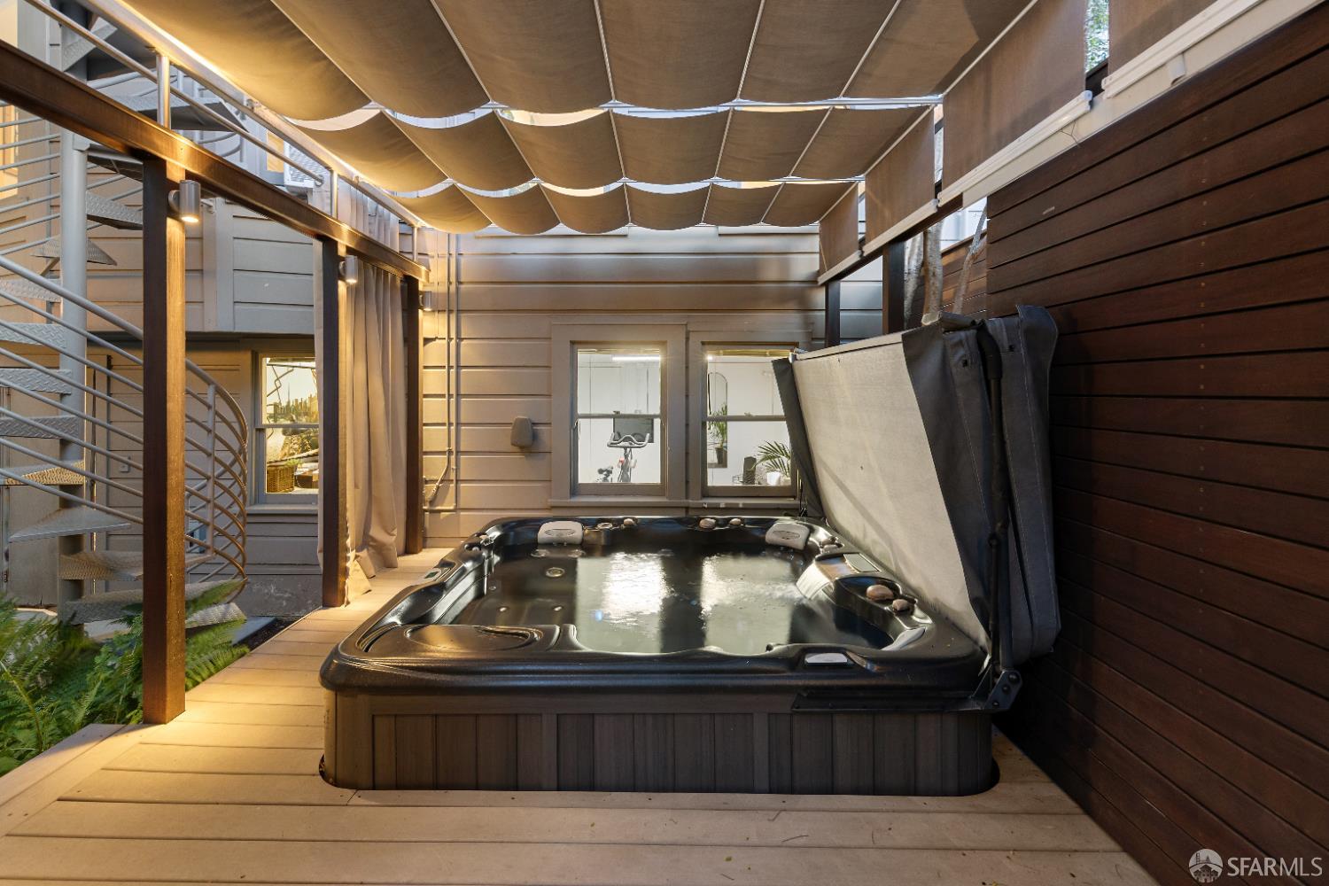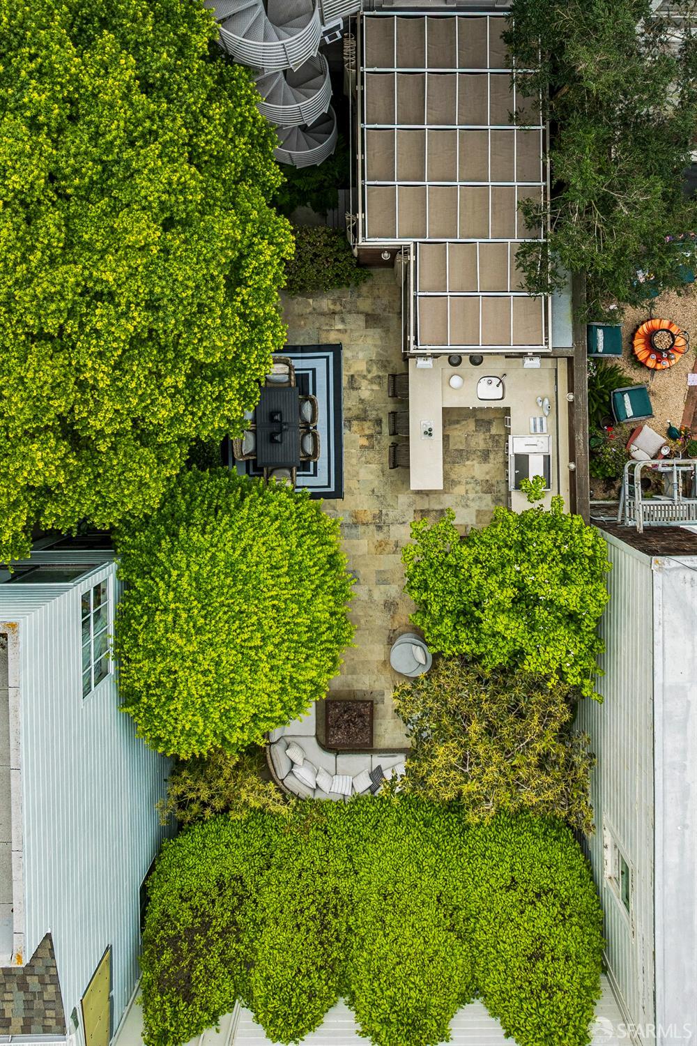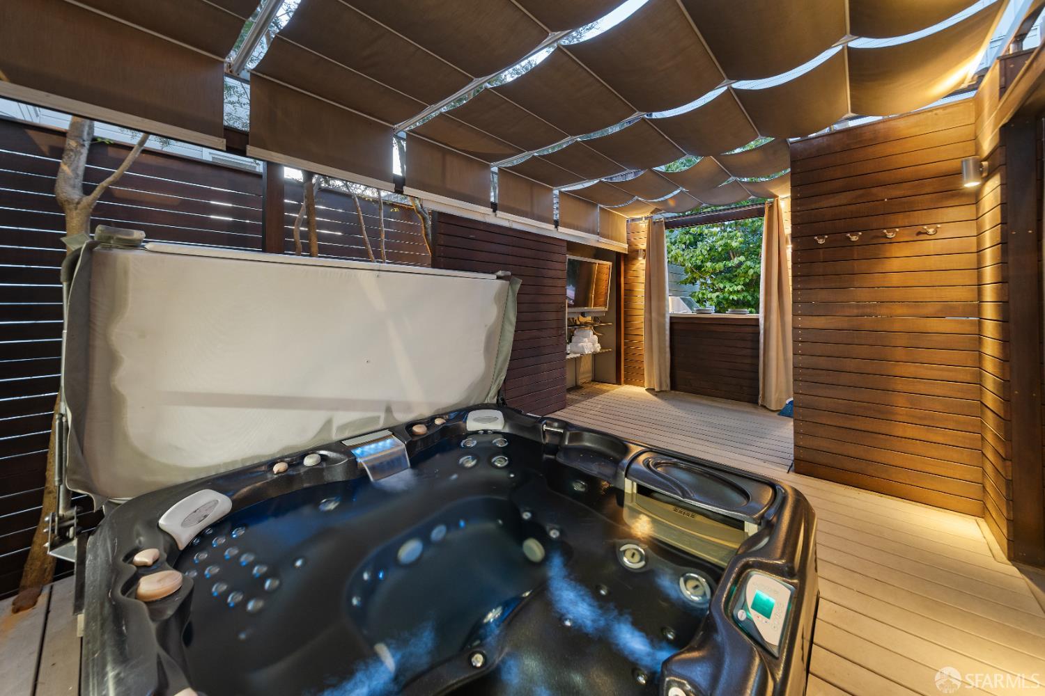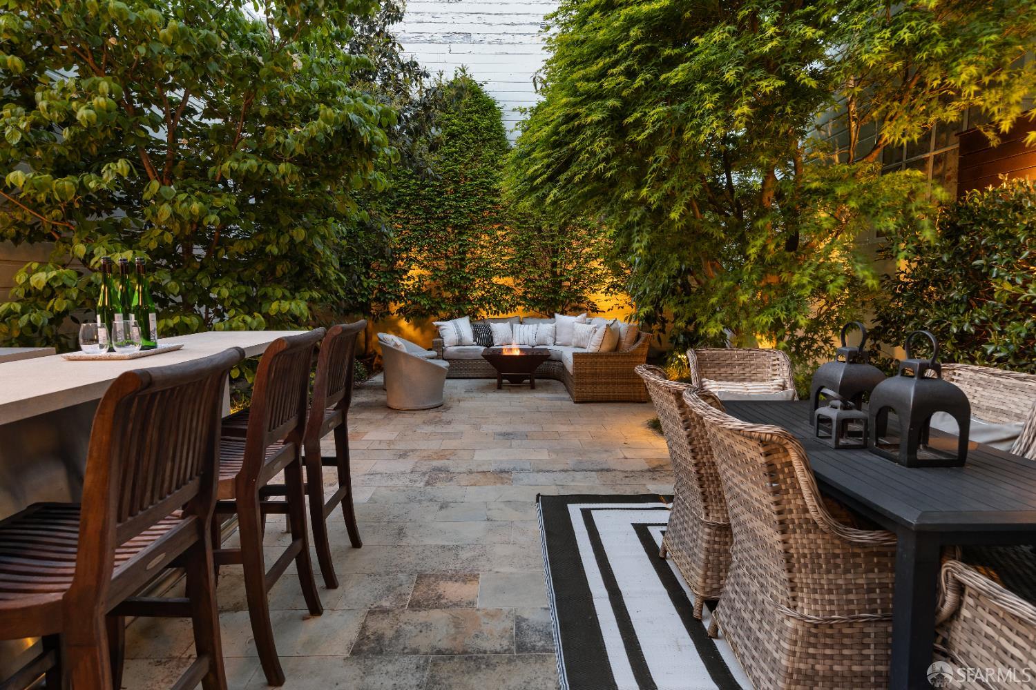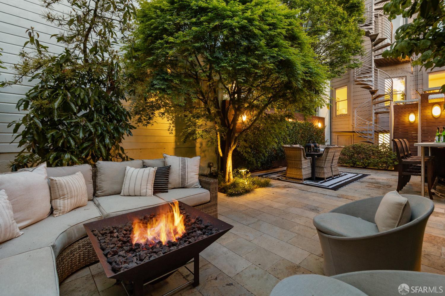 Designed for authentic California living, this 2-bedroom, 2-bathroom condominium with a sizable outdoor entertaining area thoughtfully balances classic architectural detail with modern upgrades in a well-kept, two-residence, 1906 Edwardian. Greeted by a gracious entry hall which opens to the main living spaces, where 9.5′ ceilings, wainscoting, hardwood floors, and a gas fireplace lend warmth and character to the living room. Large south-facing bay windows bring in abundant natural light, while French-style prism glass pocket doors open to an expansive formal dining room with custom built-ins. The kitchen is both functional and well-finished, appointed with a Viking gas stove, quartz countertops, and a Sub-Zero refrigerator, adjacent to a laundry area equipped with stacked LG appliances. A powder room is located down the central hall with an adjacent split bath with steam shower near the guest bedroom. The spacious primary suite enjoys patio and garden outlooks, an en-suite bath, and a walk-in closet with built-ins and a safe. On the lower level, two deeded flex rooms spanning 295 sqft offer versatility for a home office, gym, wine storage, or additional utility space. Deeded for this condo’s exclusive use, the large garden encompasses 1,300 sqft – well designed for both daily use and entertaining. An outdoor kitchen outfitted with Viking BBQ, refrigerator, and sink anchors the space, while generous counter space allows for easy gathering and meal preparation. Nearby entertainment areas create room for casual dining and conversation. An intimate pavilion reveals a hot tub, tucked beneath retractable awnings with curtains that can enclose the space for added privacy. A large recessed television is ideal for game-day gatherings or quieter movie nights outdoors, complemented by an integrated outdoor audio system. The gas fire pit surrounded by a well-tended garden and mature trees, integrated irrigation and subtle lighting, create a warm, inviting retreat. Additional conveniences include recessed lighting throughout, surround sound in the entertaining areas, Nest thermostat, video enabled doorbell, two-car tandem garage parking, Tesla EV charging station, and substantial storage complete this appealing Russian Hill home.