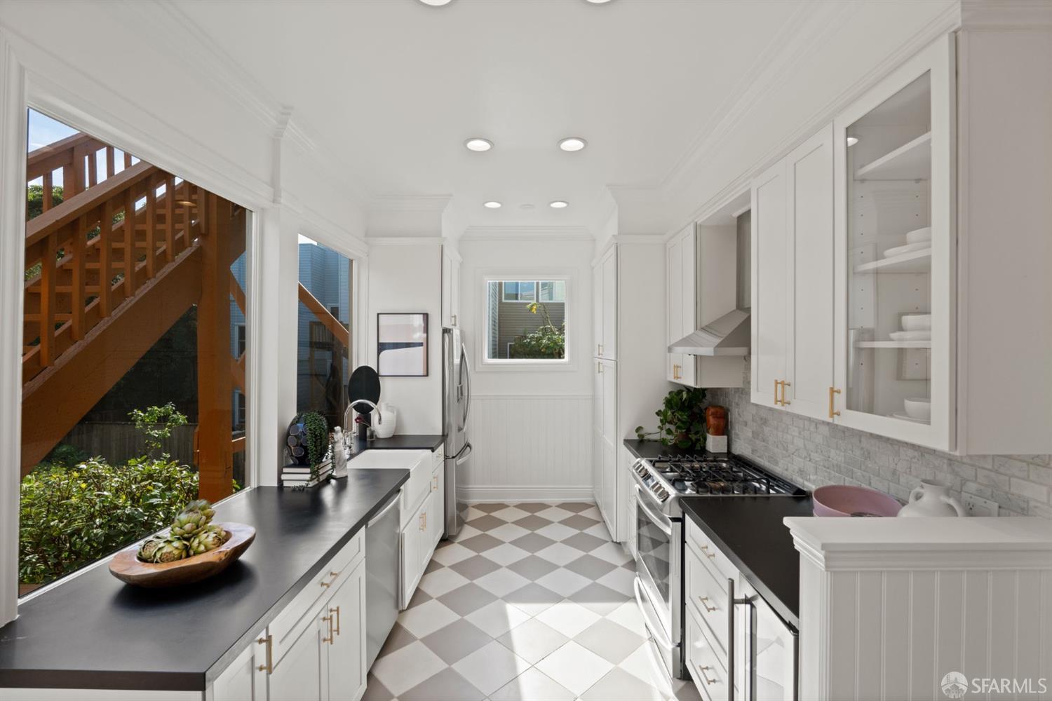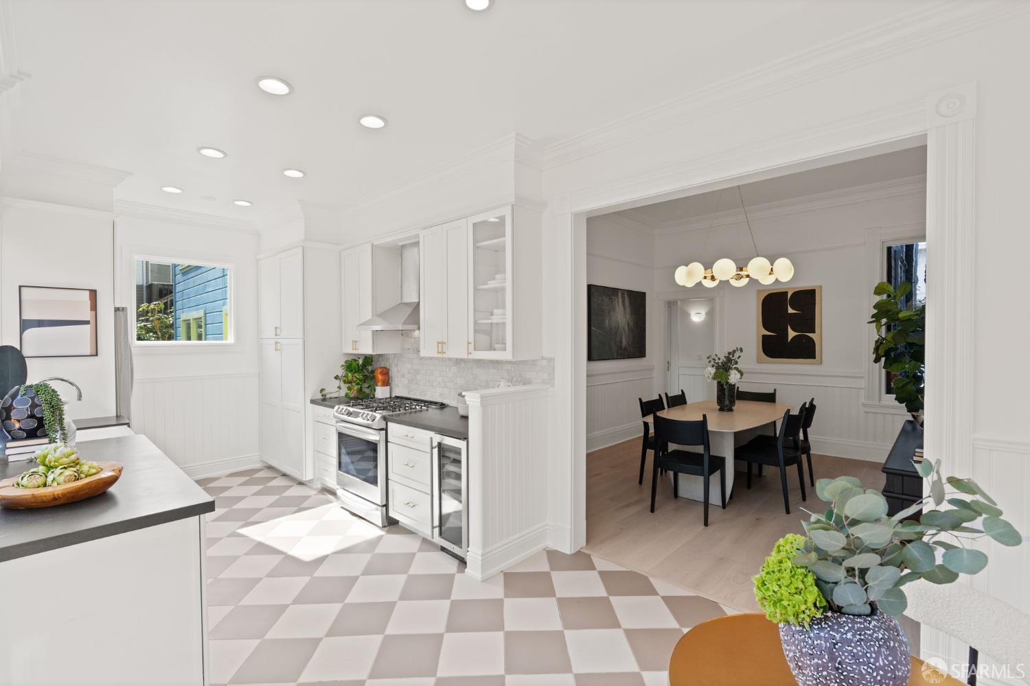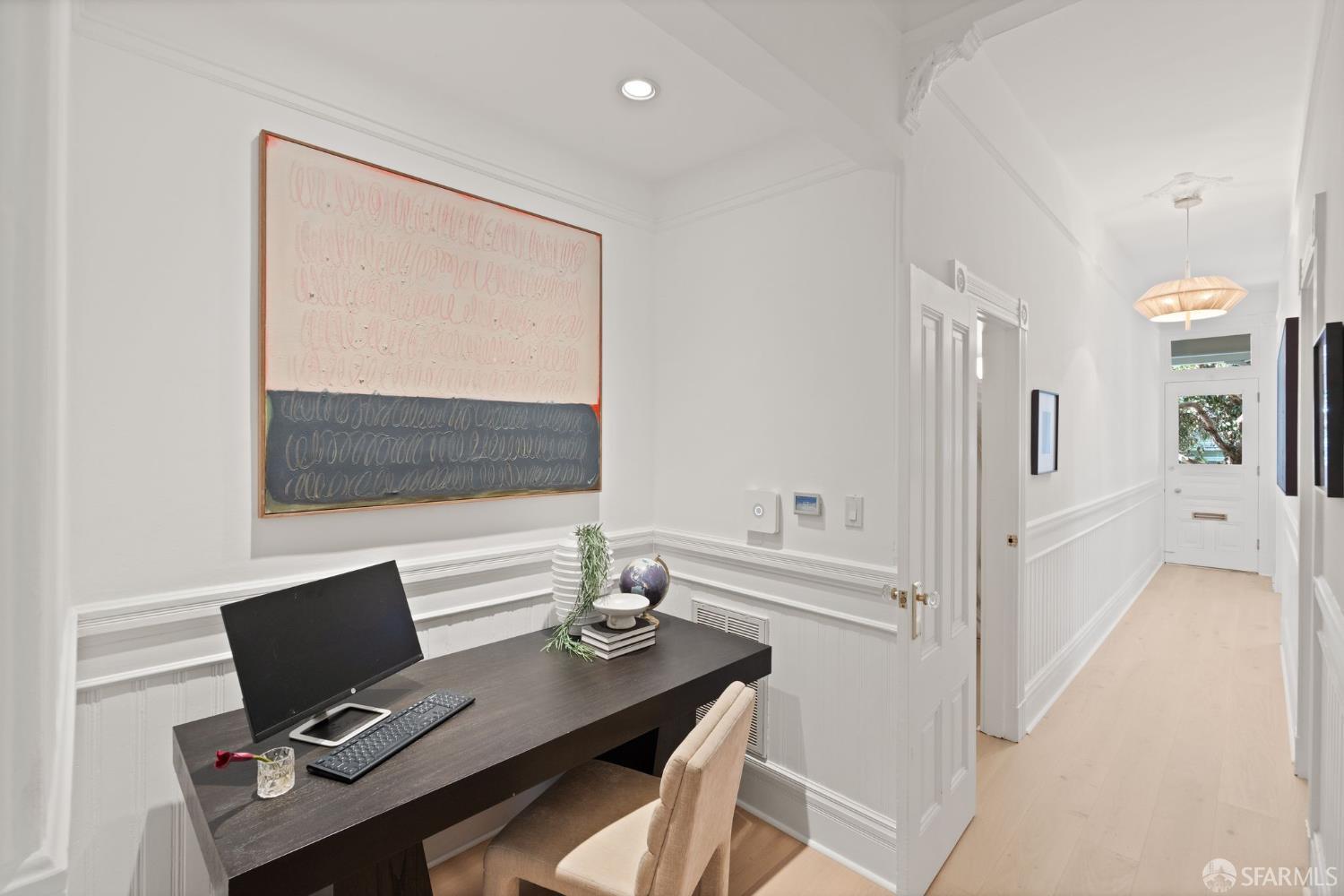 This beautifully detailed NOPA condominium is a rare blend of classic Victorian beauty, rich period craftsmanship, thoughtful updates, and one of SF’s most desirable locations.Beautiful new wood floors throughout. Intricate plaster moldings, high ceilings, elegant wainscoting. Graciously scaled rooms create an inviting flow throughout the residence. The spacious, flexible floor plan includes two generous bedrooms, a stately living room, a versatile bonus space for a home office and a formal dining room ideal for entertaining. The thoughtfully updated marble bathroom blends classic style with modern comfort. The bright, spacious eat-in kitchen is a chef’s dream. A wall of windows floods the space with natural light and opens directly onto a private deck overlooking the lush garden below. Step outside to enjoy morning coffee or evening gatherings. The exceptionally deep lot creates a surprisingly expansive outdoor retreat-an uncommon find in the city. Additional amenities include parking and storage in the garage. Ideally located in the heart of NOPA, this home places you just blocks from neighborhood favorites along Divisadero Street, everyday shopping at Bi-Rite and Whole Foods, and the green expanse of the Panhandle for walking, biking, or relaxing outdoors. With nearby access to public transit, tech shuttles, freeways, and close proximity to UCSF and USF, the location offers both convenience and vibrant city living.A wonderful opportunity to own a home that pairs historic San Francisco charm with an exceptional NOPA lifestyle and neighborhood setting.