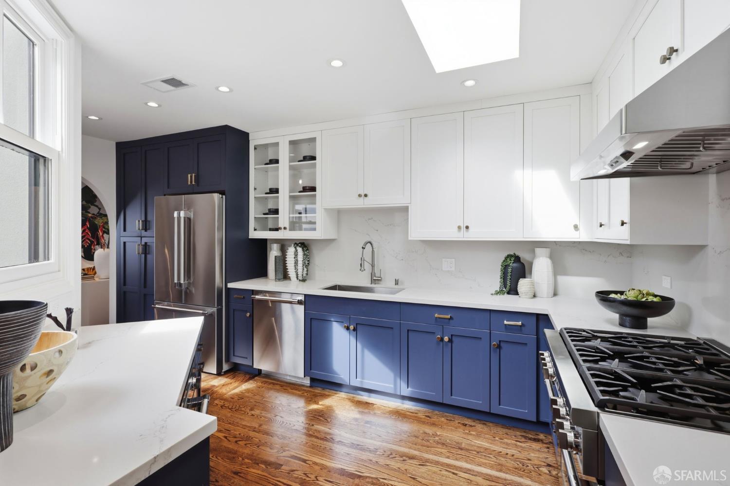 Sensational 4-bedroom, 3-bathroom home in prime Inner Sunset location. Extensively remodeled in 2021-2022, this impeccably maintained residence retains its charm and character with original hardwood floors and period doors, while offering every modern upgrade: new electrical, new windows, new insulation, new drywall, updated plumbing, roof, new stucco, remodeled kitchen and baths, plus a developed lower level. Filled with natural light, the main level features a chef’s kitchen with premium Thermador appliances, a formal dining room, and a grand living room with vaulted ceilings and a wood-burning fireplace. Two spacious bedrooms, two full baths, and a center patio – perfect for morning coffee or evening wine – complete this level. Downstairs, the expanded lower level offers a comfortable media room or flex space, two additional bedrooms, a full bath, laundry, storage, and a one-car garage. The beautifully terraced backyard is ideal for grilling, gardening, and relaxing, featuring Japanese maple, Meyer lemon, fig, and avocado trees. Ideally situated at the crossroads of the Inner Sunset and Golden Gate Heights, this home offers the best of city living and the outdoors. Just around the corner, explore the extraordinary Moraga Steps and Grand View Park for sweeping views of the city and spectacular sunsets. Stroll to 9th & Irving or Noriega Street for dining and shopping, and enjoy nearby Golden Gate Park and Ocean Beach. Commuting is effortless with the N-Judah just blocks away and easy access to 19th Avenue. Close to top-rated schools. A truly special home that seamlessly blends historic San Francisco charm with modern comfort.