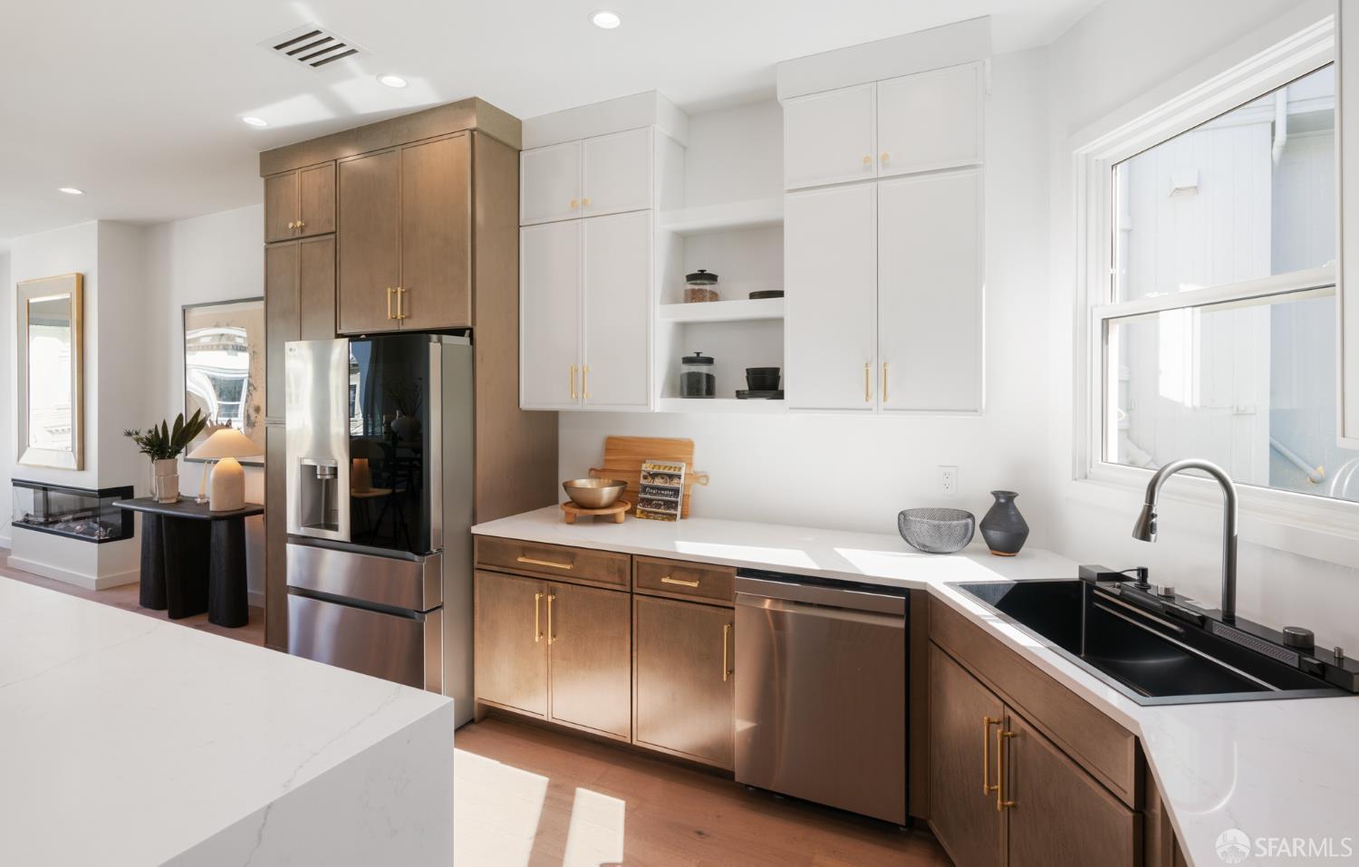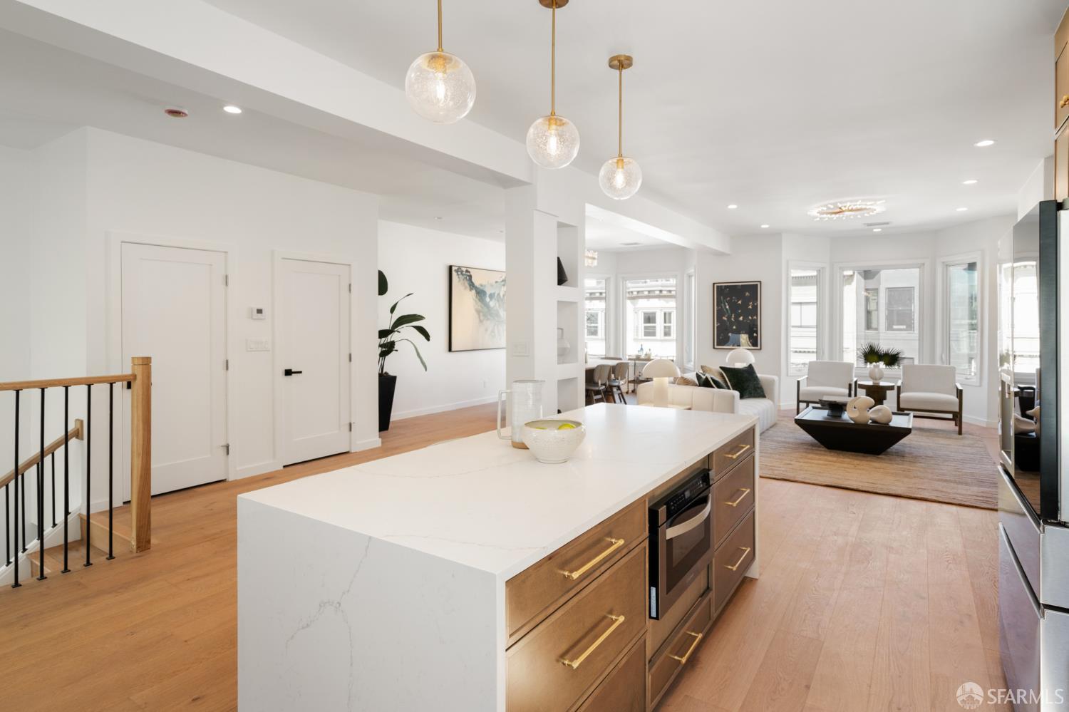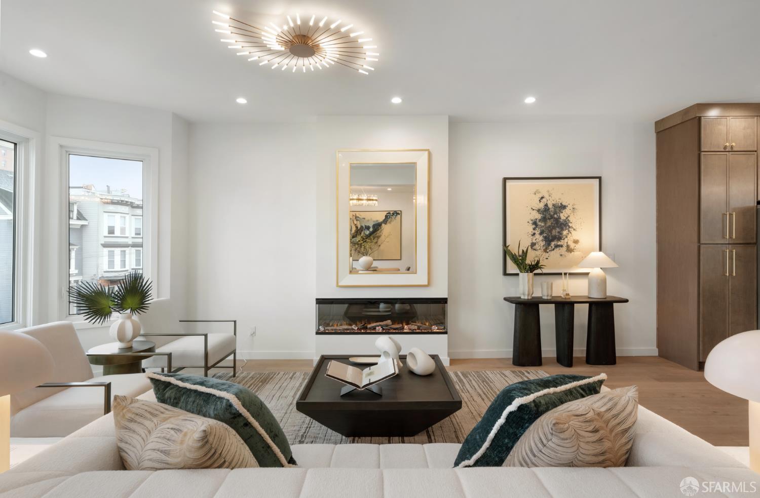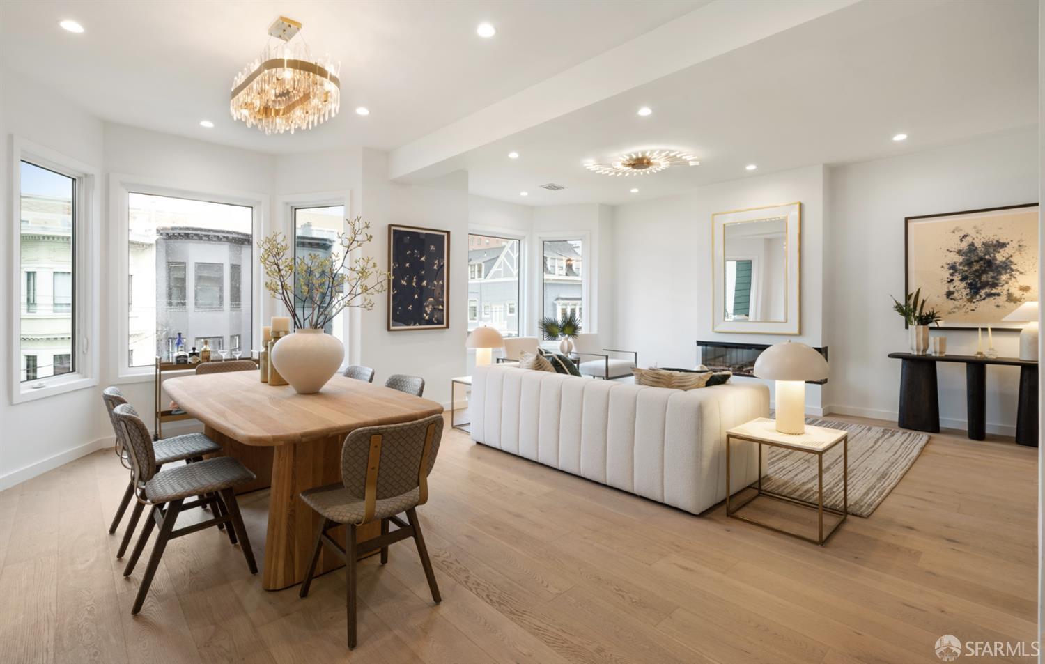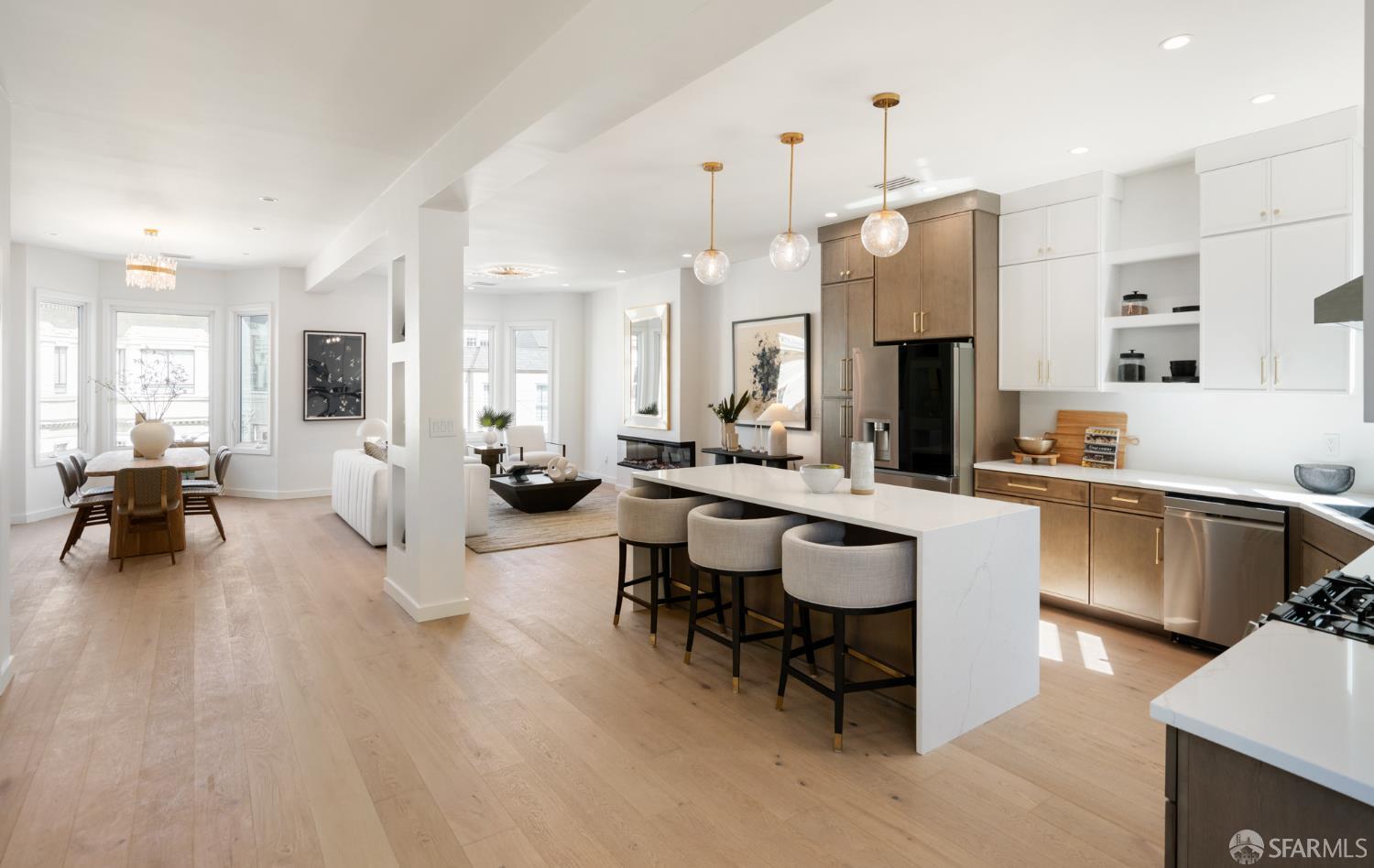 Sophisticated and bright top-floor, luxe living in a prime location reworked with thoughtfully designed floorplan, and windows on all four sides, ready to shine following it’s just-finished extensive remodeling. Voluminous open-concept living/dining with soaring ceilings just under ten feet, and large operable bay windows provide abundant natural light, city outlooks, often rendering the new modern ceiling lights unnecessary. Sleek enclosed 60” fireplace giving warmth on foggy days and modern focal point. Clean, contemporary flooring throughout. Spacious dining area presents ideal entertainment space for large gatherings. Thoughtful gourmet kitchen anchored by large eat-in island wrapped in beautiful quartz with storage and built-in microwave drawer. Warm, tall cabinets, and custom pullouts enable a plethora of storage options. Warm accents, stainless appliances, and commercial grade 33” oversized stainless-steel workstation sink add to the special conveniences. Hallway with operable windows separates entertaining and private spaces. Primary suite at rear of home offers personal retreat. Large bay windows with Golden Gate Bridge peek-a-boo views fill the room with natural light. Room for a king bed, and walk-in/walk-through closet. Ensuite extends luxury spa-like sanctuary with modern touches, and stylish fixtures. Separate deep soaking tub from stall shower with rain shower and hand-held wand. Smart faucet with temp display, LED lit mirror, and elongated bidet toilet. This striking bathroom with warm color palette brings the primary suite full circle. Second bedroom with large bay windows also with Golden Gate Bridge peek-a-boo views, and abundant natural light. Second modern bathroom delivers well-designed environment with soaking tub and rain shower and separate hand-held wand, LED lit mirror, smart faucet with temp display, and elongated bidet toilet. Third bedroom presents modern lighting, multiple windows, and options for plethora of uses from home office to home gym. Laundry closet with new large capacity stacking machines, room for supplies, and window with blue-sky outlooks. Basement storage. Completely remodeled, bright top-floor with windows on all four sides, soaring ceilings, voluminous entertaining areas, modern conveniences, contemporary touches, fantastic location, neighborhood amenities, leased parking nearby-ideal San Francisco with quintessential SF architecture, combined with modern updating, and classic desirable location.