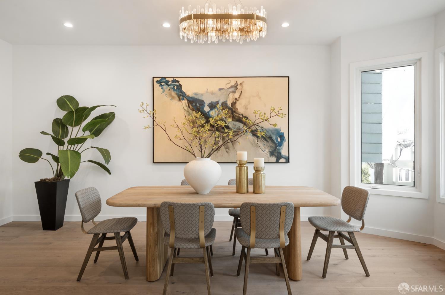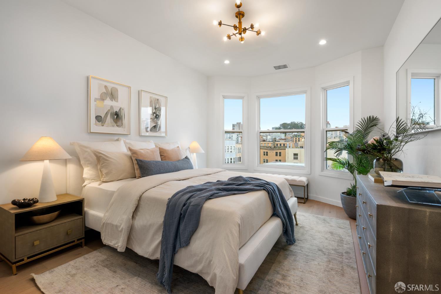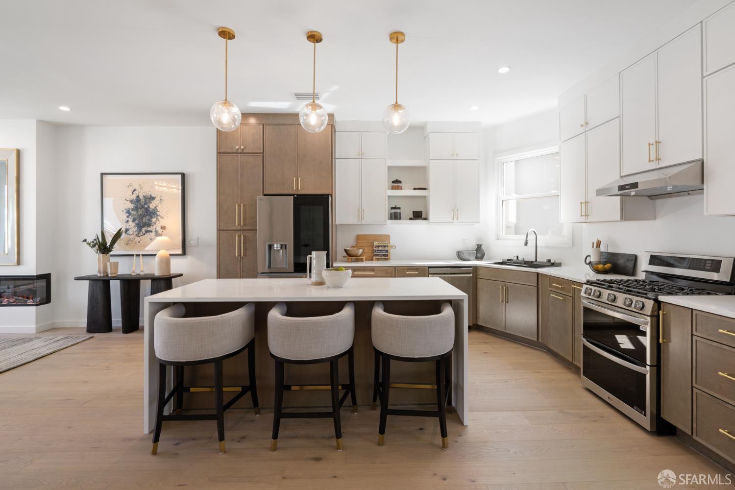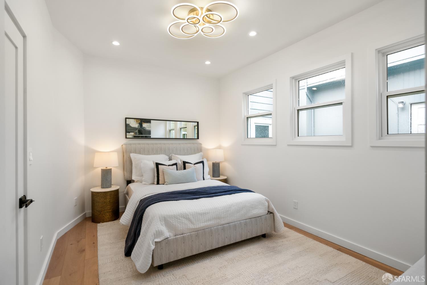 Sophisticated and bright top-floor, luxe living in a prime location reworked with thoughtfully designed floorplan, and windows on all four sides, ready to shine following it’s just-finished extensive remodeling. Voluminous open-concept living/dining with soaring ceilings just under ten feet, and large operable bay windows provide abundant natural light, city outlooks, often rendering the new modern ceiling lights unnecessary. Sleek enclosed 60” fireplace giving warmth on foggy days and modern focal point. Clean, contemporary flooring throughout. Spacious dining area presents ideal entertainment space for large gatherings. Thoughtful gourmet kitchen anchored by large eat-in island wrapped in beautiful quartz with storage and built-in microwave drawer. Warm, tall cabinets, and custom pullouts enable a plethora of storage options. Warm accents, stainless appliances, and commercial grade 33” oversized stainless-steel workstation sink add to the special conveniences. Hallway with operable windows separates entertaining and private spaces. Primary suite at rear of home offers personal retreat. Large bay windows with Golden Gate Bridge peek-a-boo views fill the room with natural light. Room for a king bed, and walk-in/walk-through closet. Ensuite extends luxury spa-like sanctuary with modern touches, and stylish fixtures. Separate deep soaking tub from stall shower with rain shower and hand-held wand. Smart faucet with temp display, LED lit mirror, and elongated bidet toilet. This striking bathroom with warm color palette brings the primary suite full circle. Second bedroom with large bay windows also with Golden Gate Bridge peek-a-boo views, and abundant natural light. Second modern bathroom delivers well-designed environment with soaking tub and rain shower and separate hand-held wand, LED lit mirror, smart faucet with temp display, and elongated bidet toilet. Third bedroom presents modern lighting, multiple windows, and options for plethora of uses from home office to home gym. Laundry closet with new large capacity stacking machines, room for supplies, and window with blue-sky outlooks. Basement storage. Completely remodeled, bright top-floor with windows on all four sides, soaring ceilings, voluminous entertaining areas, modern conveniences, contemporary touches, fantastic location, neighborhood amenities, leased parking nearby-ideal San Francisco with quintessential SF architecture, combined with modern updating, and classic desirable location.