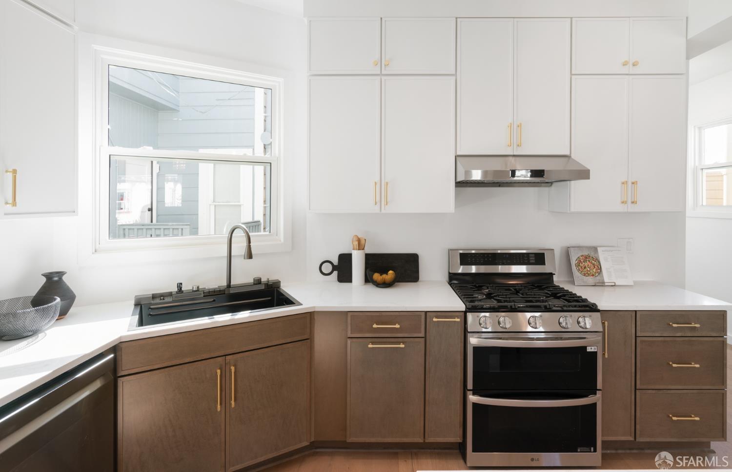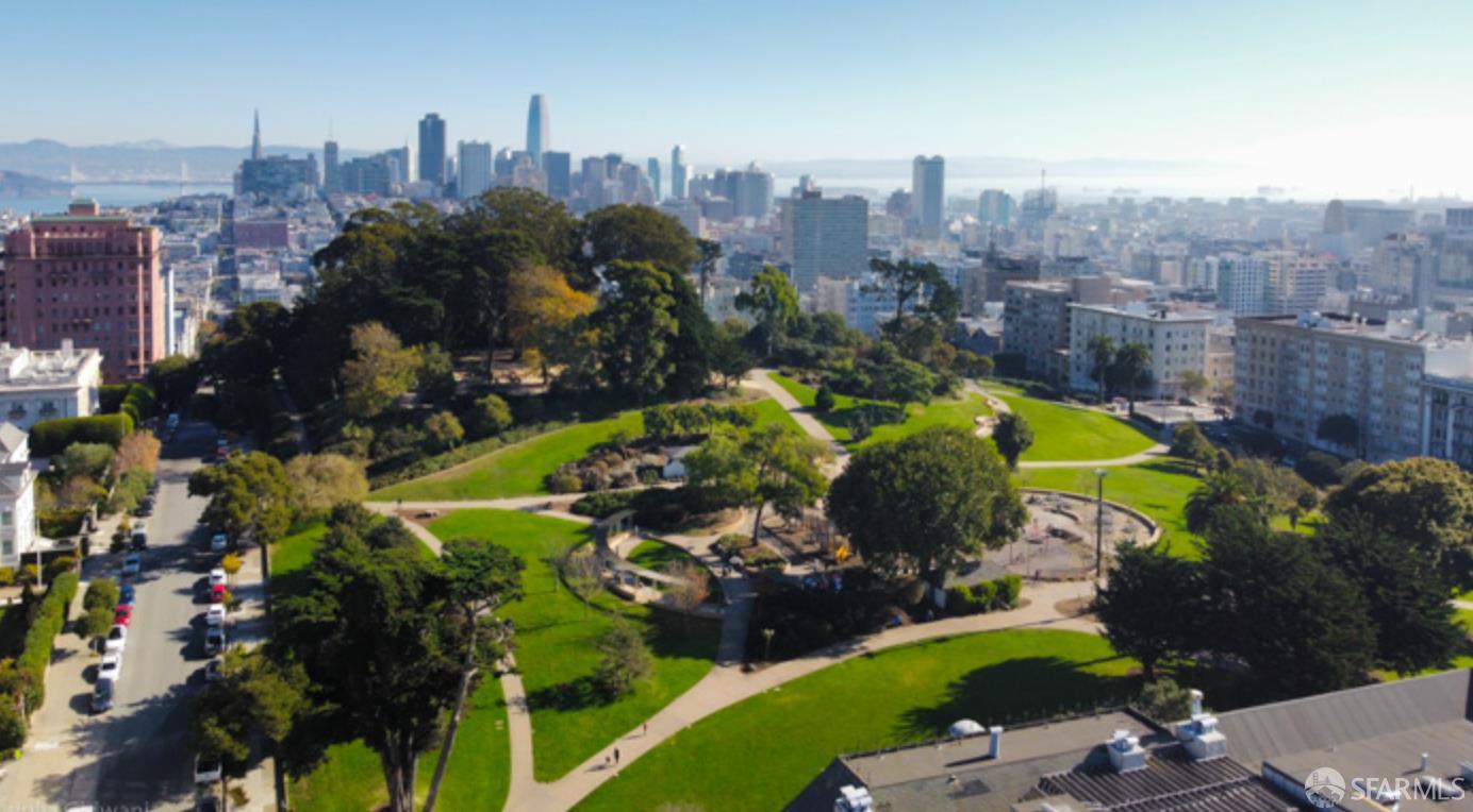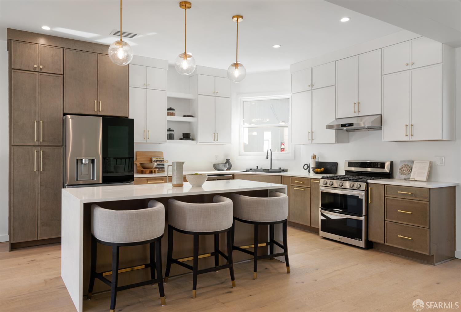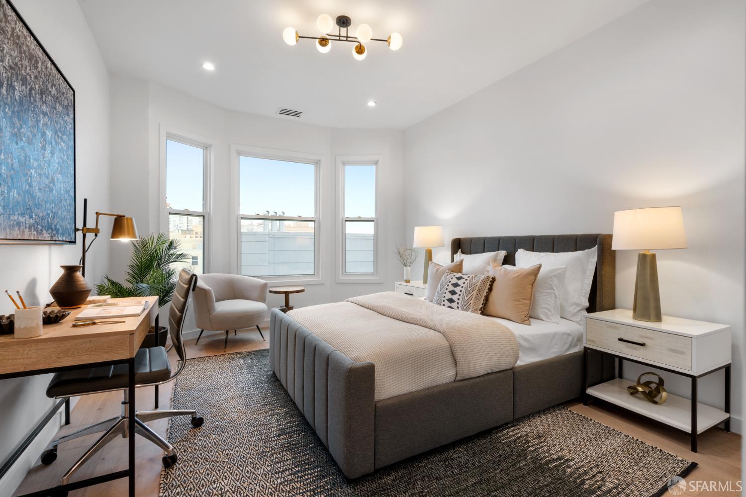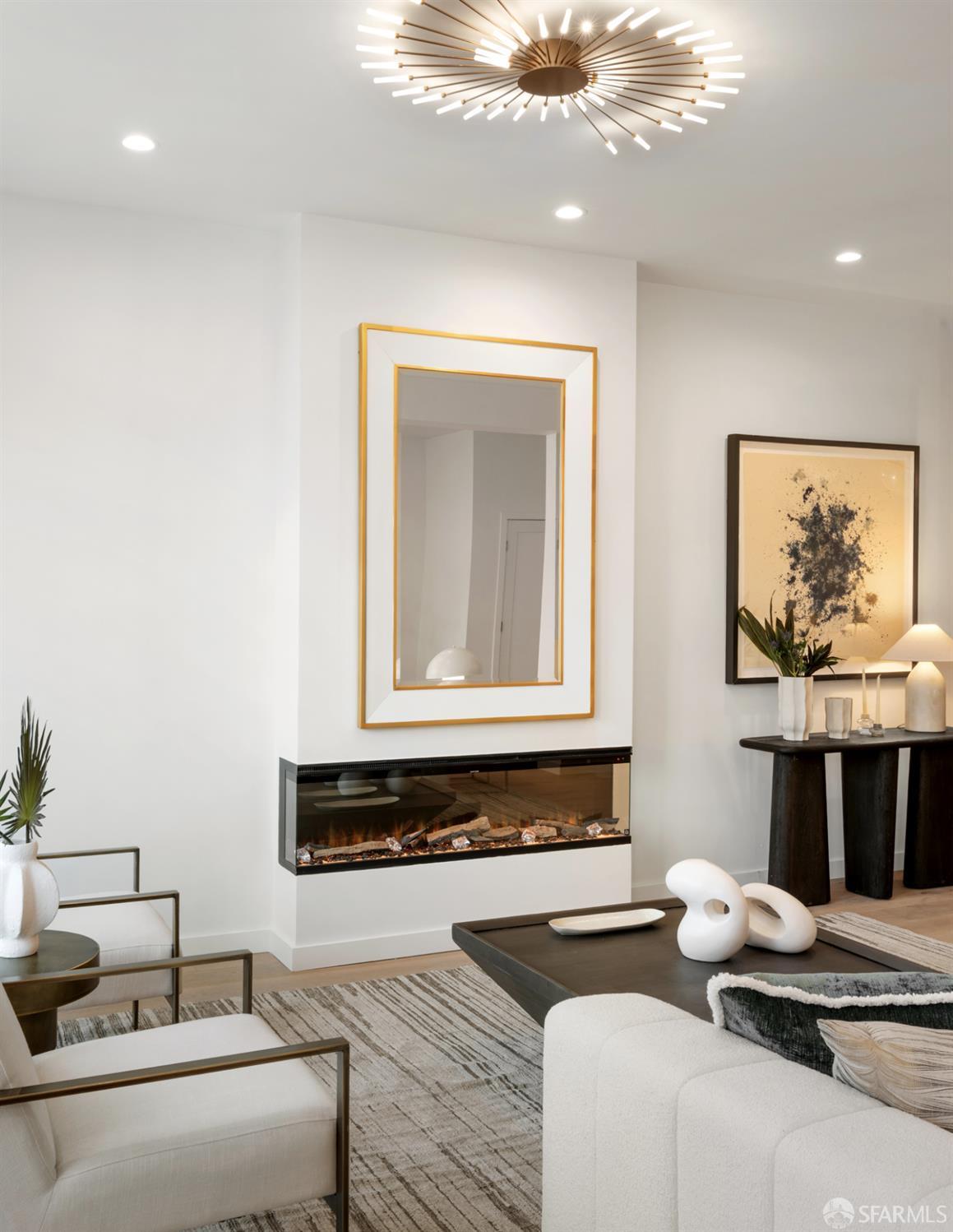 Sophisticated and bright top-floor, luxe living in a prime location reworked with thoughtfully designed floorplan, and windows on all four sides, ready to shine following it’s just-finished extensive remodeling. Voluminous open-concept living/dining with soaring ceilings just under ten feet, and large operable bay windows provide abundant natural light, city outlooks, often rendering the new modern ceiling lights unnecessary. Sleek enclosed 60” fireplace giving warmth on foggy days and modern focal point. Clean, contemporary flooring throughout. Spacious dining area presents ideal entertainment space for large gatherings. Thoughtful gourmet kitchen anchored by large eat-in island wrapped in beautiful quartz with storage and built-in microwave drawer. Warm, tall cabinets, and custom pullouts enable a plethora of storage options. Warm accents, stainless appliances, and commercial grade 33” oversized stainless-steel workstation sink add to the special conveniences. Hallway with operable windows separates entertaining and private spaces. Primary suite at rear of home offers personal retreat. Large bay windows with Golden Gate Bridge peek-a-boo views fill the room with natural light. Room for a king bed, and walk-in/walk-through closet. Ensuite extends luxury spa-like sanctuary with modern touches, and stylish fixtures. Separate deep soaking tub from stall shower with rain shower and hand-held wand. Smart faucet with temp display, LED lit mirror, and elongated bidet toilet. This striking bathroom with warm color palette brings the primary suite full circle. Second bedroom with large bay windows also with Golden Gate Bridge peek-a-boo views, and abundant natural light. Second modern bathroom delivers well-designed environment with soaking tub and rain shower and separate hand-held wand, LED lit mirror, smart faucet with temp display, and elongated bidet toilet. Third bedroom presents modern lighting, multiple windows, and options for plethora of uses from home office to home gym. Laundry closet with new large capacity stacking machines, room for supplies, and window with blue-sky outlooks. Basement storage. Completely remodeled, bright top-floor with windows on all four sides, soaring ceilings, voluminous entertaining areas, modern conveniences, contemporary touches, fantastic location, neighborhood amenities, leased parking nearby-ideal San Francisco with quintessential SF architecture, combined with modern updating, and classic desirable location.