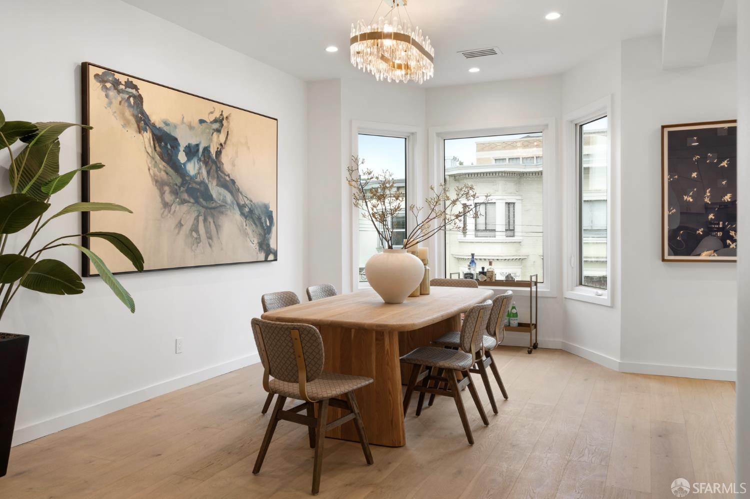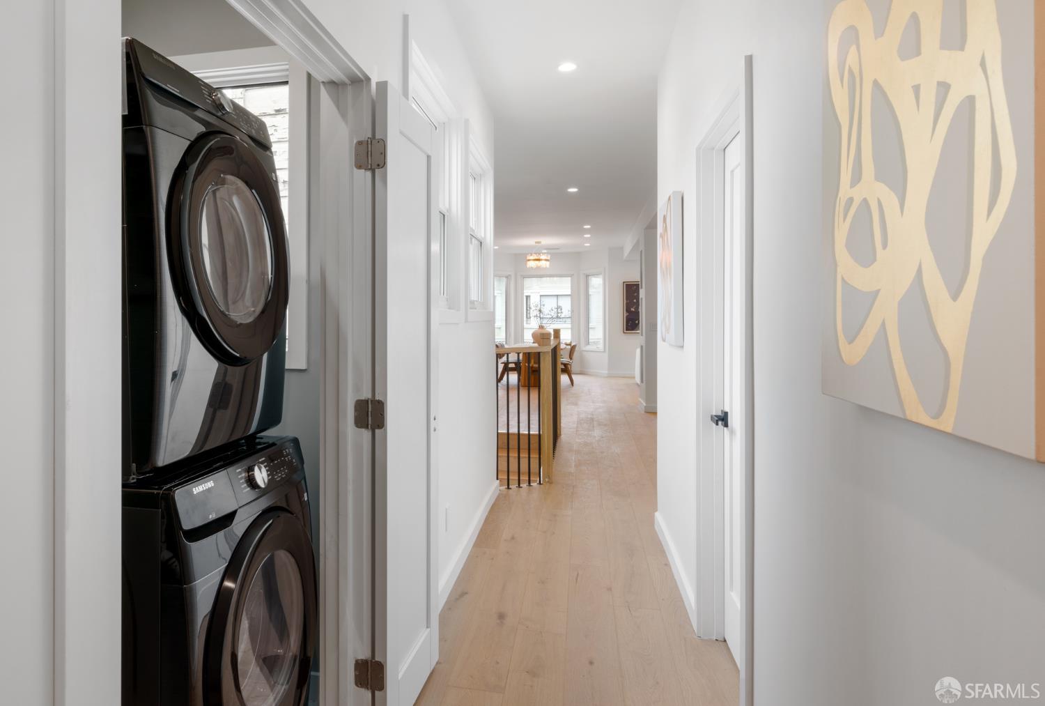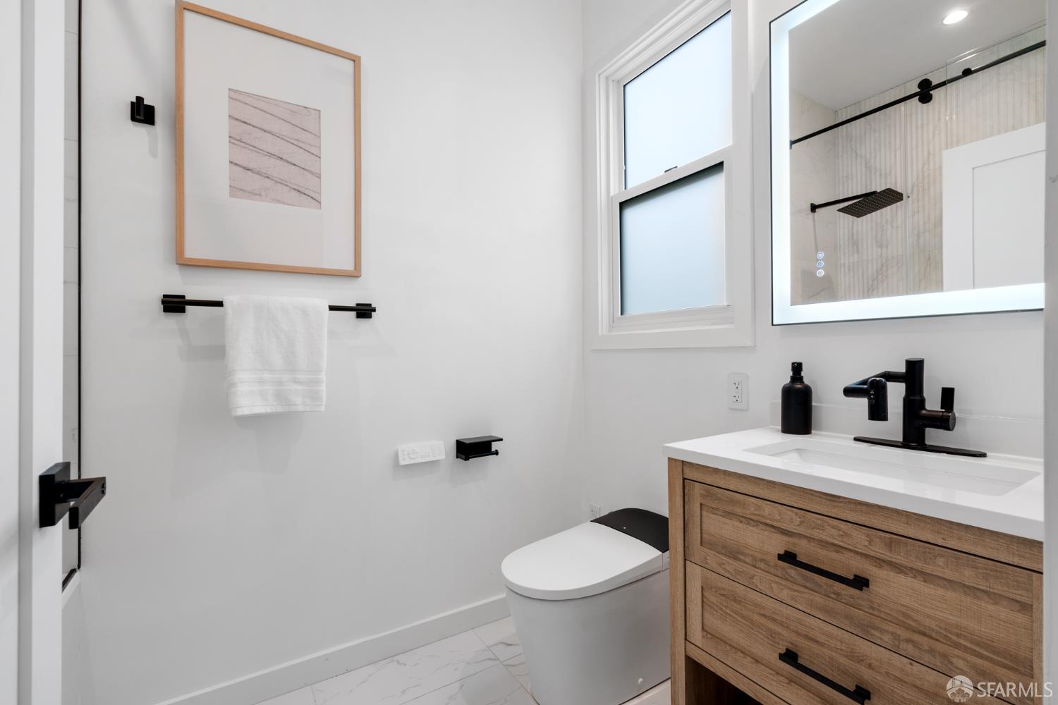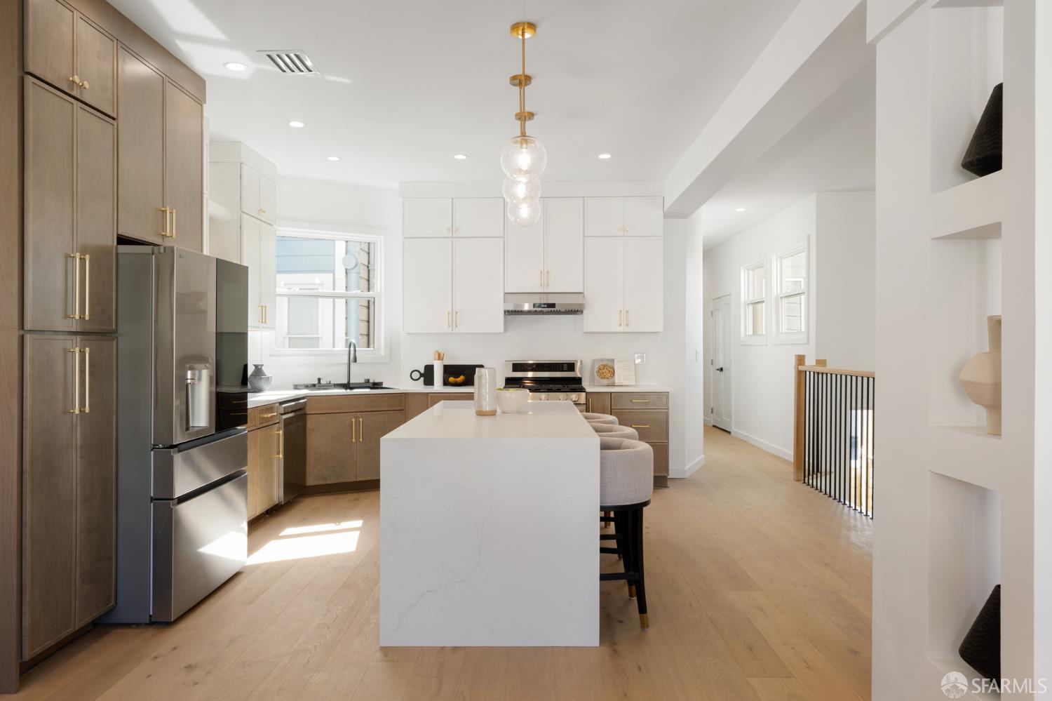 Sophisticated and bright top-floor, luxe living in a prime location reworked with thoughtfully designed floorplan, and windows on all four sides, ready to shine following it’s just-finished extensive remodeling. Voluminous open-concept living/dining with soaring ceilings just under ten feet, and large operable bay windows provide abundant natural light, city outlooks, often rendering the new modern ceiling lights unnecessary. Sleek enclosed 60” fireplace giving warmth on foggy days and modern focal point. Clean, contemporary flooring throughout. Spacious dining area presents ideal entertainment space for large gatherings. Thoughtful gourmet kitchen anchored by large eat-in island wrapped in beautiful quartz with storage and built-in microwave drawer. Warm, tall cabinets, and custom pullouts enable a plethora of storage options. Warm accents, stainless appliances, and commercial grade 33” oversized stainless-steel workstation sink add to the special conveniences. Hallway with operable windows separates entertaining and private spaces. Primary suite at rear of home offers personal retreat. Large bay windows with Golden Gate Bridge peek-a-boo views fill the room with natural light. Room for a king bed, and walk-in/walk-through closet. Ensuite extends luxury spa-like sanctuary with modern touches, and stylish fixtures. Separate deep soaking tub from stall shower with rain shower and hand-held wand. Smart faucet with temp display, LED lit mirror, and elongated bidet toilet. This striking bathroom with warm color palette brings the primary suite full circle. Second bedroom with large bay windows also with Golden Gate Bridge peek-a-boo views, and abundant natural light. Second modern bathroom delivers well-designed environment with soaking tub and rain shower and separate hand-held wand, LED lit mirror, smart faucet with temp display, and elongated bidet toilet. Third bedroom presents modern lighting, multiple windows, and options for plethora of uses from home office to home gym. Laundry closet with new large capacity stacking machines, room for supplies, and window with blue-sky outlooks. Basement storage. Completely remodeled, bright top-floor with windows on all four sides, soaring ceilings, voluminous entertaining areas, modern conveniences, contemporary touches, fantastic location, neighborhood amenities, leased parking nearby-ideal San Francisco with quintessential SF architecture, combined with modern updating, and classic desirable location.