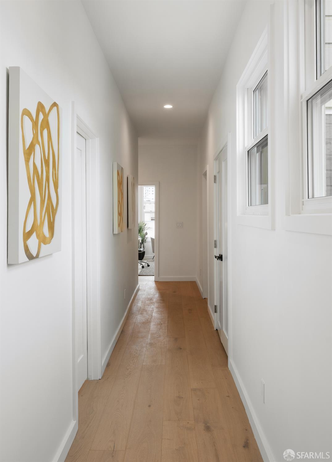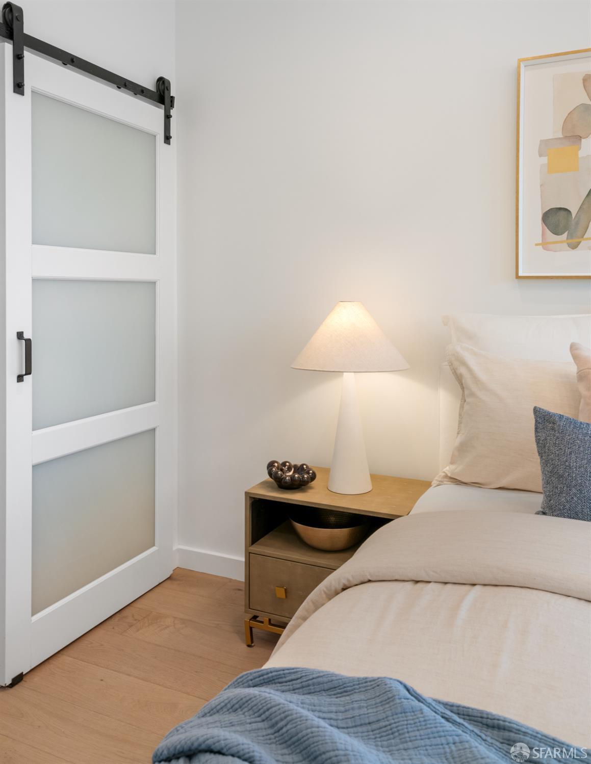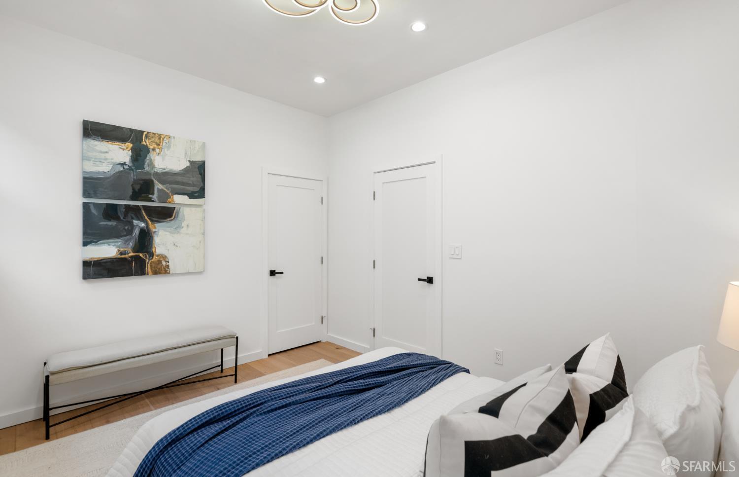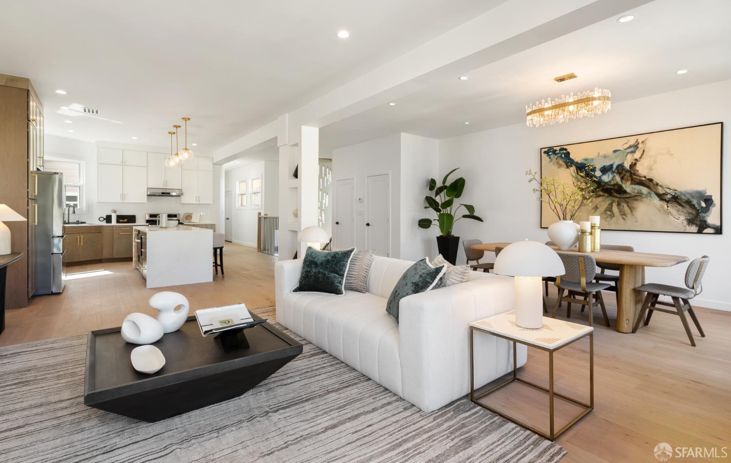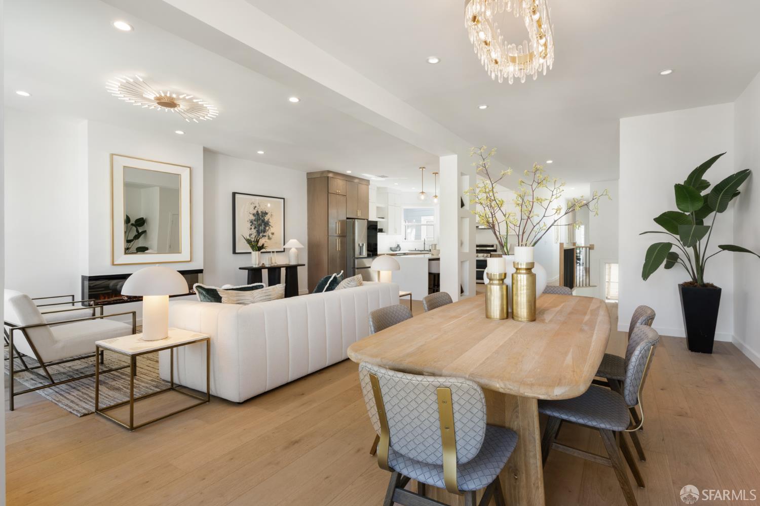 Sophisticated and bright top-floor, luxe living in a prime location reworked with thoughtfully designed floorplan, and windows on all four sides, ready to shine following it’s just-finished extensive remodeling. Voluminous open-concept living/dining with soaring ceilings just under ten feet, and large operable bay windows provide abundant natural light, city outlooks, often rendering the new modern ceiling lights unnecessary. Sleek enclosed 60” fireplace giving warmth on foggy days and modern focal point. Clean, contemporary flooring throughout. Spacious dining area presents ideal entertainment space for large gatherings. Thoughtful gourmet kitchen anchored by large eat-in island wrapped in beautiful quartz with storage and built-in microwave drawer. Warm, tall cabinets, and custom pullouts enable a plethora of storage options. Warm accents, stainless appliances, and commercial grade 33” oversized stainless-steel workstation sink add to the special conveniences. Hallway with operable windows separates entertaining and private spaces. Primary suite at rear of home offers personal retreat. Large bay windows with Golden Gate Bridge peek-a-boo views fill the room with natural light. Room for a king bed, and walk-in/walk-through closet. Ensuite extends luxury spa-like sanctuary with modern touches, and stylish fixtures. Separate deep soaking tub from stall shower with rain shower and hand-held wand. Smart faucet with temp display, LED lit mirror, and elongated bidet toilet. This striking bathroom with warm color palette brings the primary suite full circle. Second bedroom with large bay windows also with Golden Gate Bridge peek-a-boo views, and abundant natural light. Second modern bathroom delivers well-designed environment with soaking tub and rain shower and separate hand-held wand, LED lit mirror, smart faucet with temp display, and elongated bidet toilet. Third bedroom presents modern lighting, multiple windows, and options for plethora of uses from home office to home gym. Laundry closet with new large capacity stacking machines, room for supplies, and window with blue-sky outlooks. Basement storage. Completely remodeled, bright top-floor with windows on all four sides, soaring ceilings, voluminous entertaining areas, modern conveniences, contemporary touches, fantastic location, neighborhood amenities, leased parking nearby-ideal San Francisco with quintessential SF architecture, combined with modern updating, and classic desirable location.