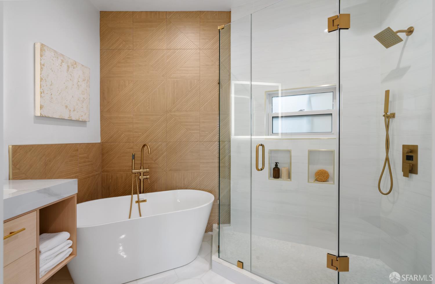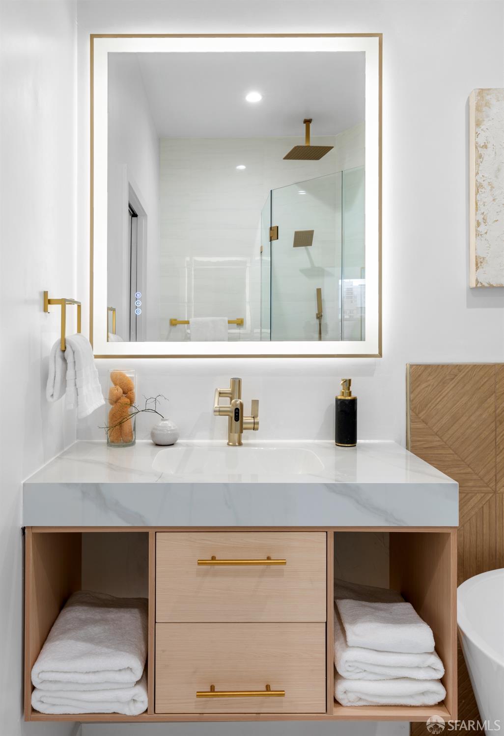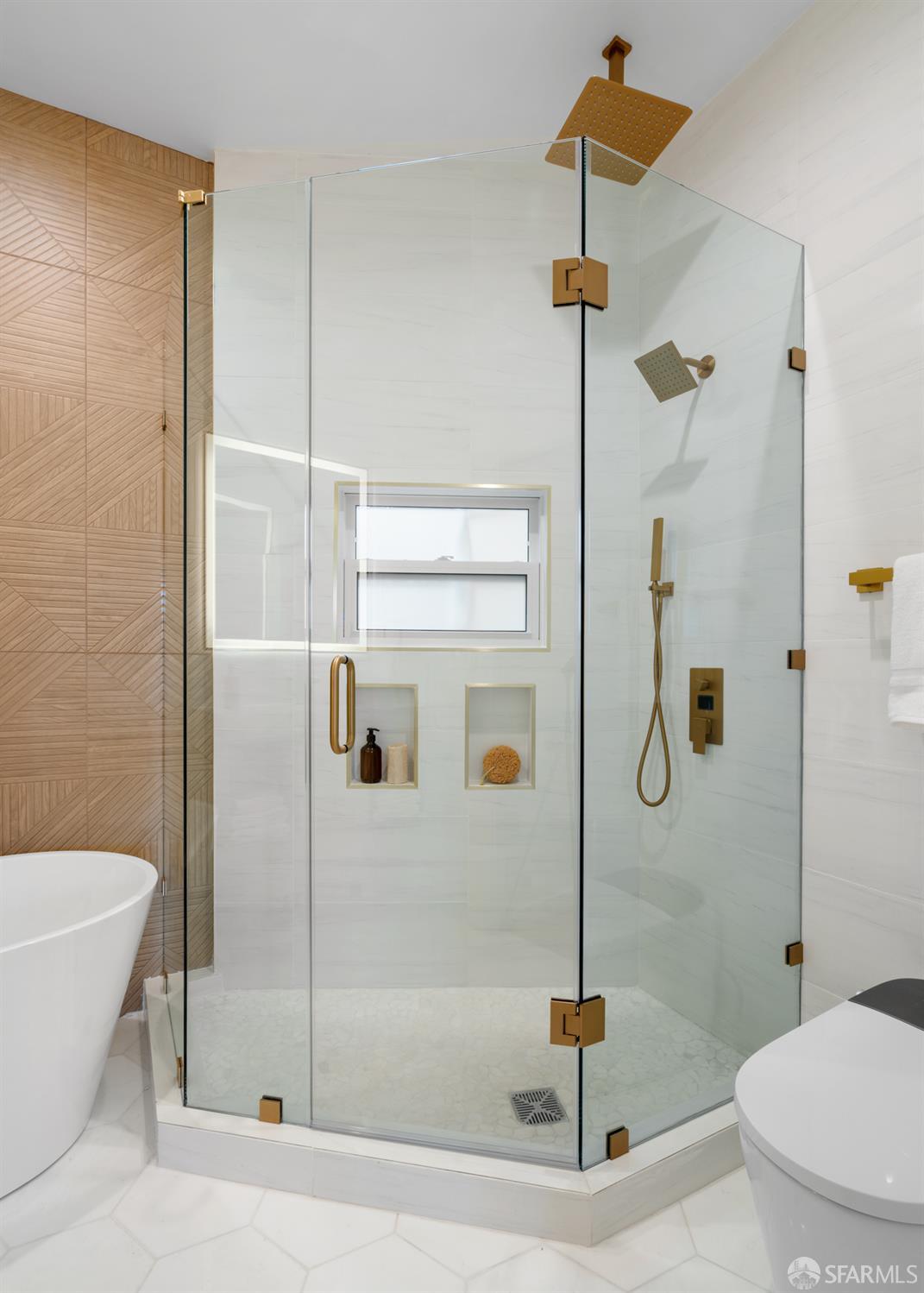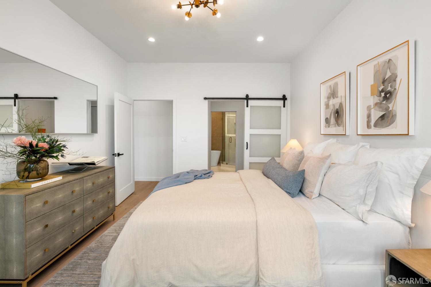 Sophisticated and bright top-floor, luxe living in a prime location reworked with thoughtfully designed floorplan, and windows on all four sides, ready to shine following it’s just-finished extensive remodeling. Voluminous open-concept living/dining with soaring ceilings just under ten feet, and large operable bay windows provide abundant natural light, city outlooks, often rendering the new modern ceiling lights unnecessary. Sleek enclosed 60” fireplace giving warmth on foggy days and modern focal point. Clean, contemporary flooring throughout. Spacious dining area presents ideal entertainment space for large gatherings. Thoughtful gourmet kitchen anchored by large eat-in island wrapped in beautiful quartz with storage and built-in microwave drawer. Warm, tall cabinets, and custom pullouts enable a plethora of storage options. Warm accents, stainless appliances, and commercial grade 33” oversized stainless-steel workstation sink add to the special conveniences. Hallway with operable windows separates entertaining and private spaces. Primary suite at rear of home offers personal retreat. Large bay windows with Golden Gate Bridge peek-a-boo views fill the room with natural light. Room for a king bed, and walk-in/walk-through closet. Ensuite extends luxury spa-like sanctuary with modern touches, and stylish fixtures. Separate deep soaking tub from stall shower with rain shower and hand-held wand. Smart faucet with temp display, LED lit mirror, and elongated bidet toilet. This striking bathroom with warm color palette brings the primary suite full circle. Second bedroom with large bay windows also with Golden Gate Bridge peek-a-boo views, and abundant natural light. Second modern bathroom delivers well-designed environment with soaking tub and rain shower and separate hand-held wand, LED lit mirror, smart faucet with temp display, and elongated bidet toilet. Third bedroom presents modern lighting, multiple windows, and options for plethora of uses from home office to home gym. Laundry closet with new large capacity stacking machines, room for supplies, and window with blue-sky outlooks. Basement storage. Completely remodeled, bright top-floor with windows on all four sides, soaring ceilings, voluminous entertaining areas, modern conveniences, contemporary touches, fantastic location, neighborhood amenities, leased parking nearby-ideal San Francisco with quintessential SF architecture, combined with modern updating, and classic desirable location.