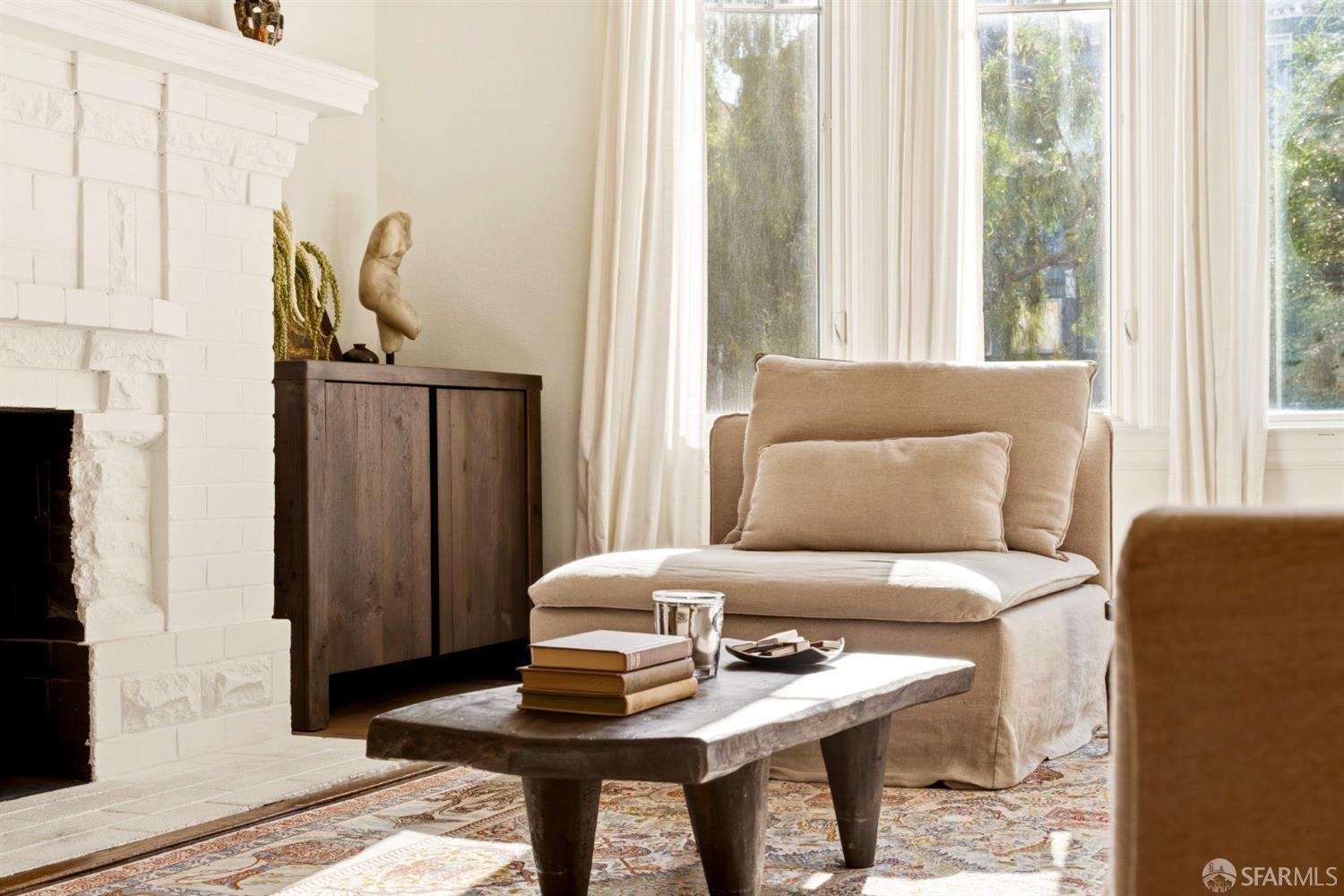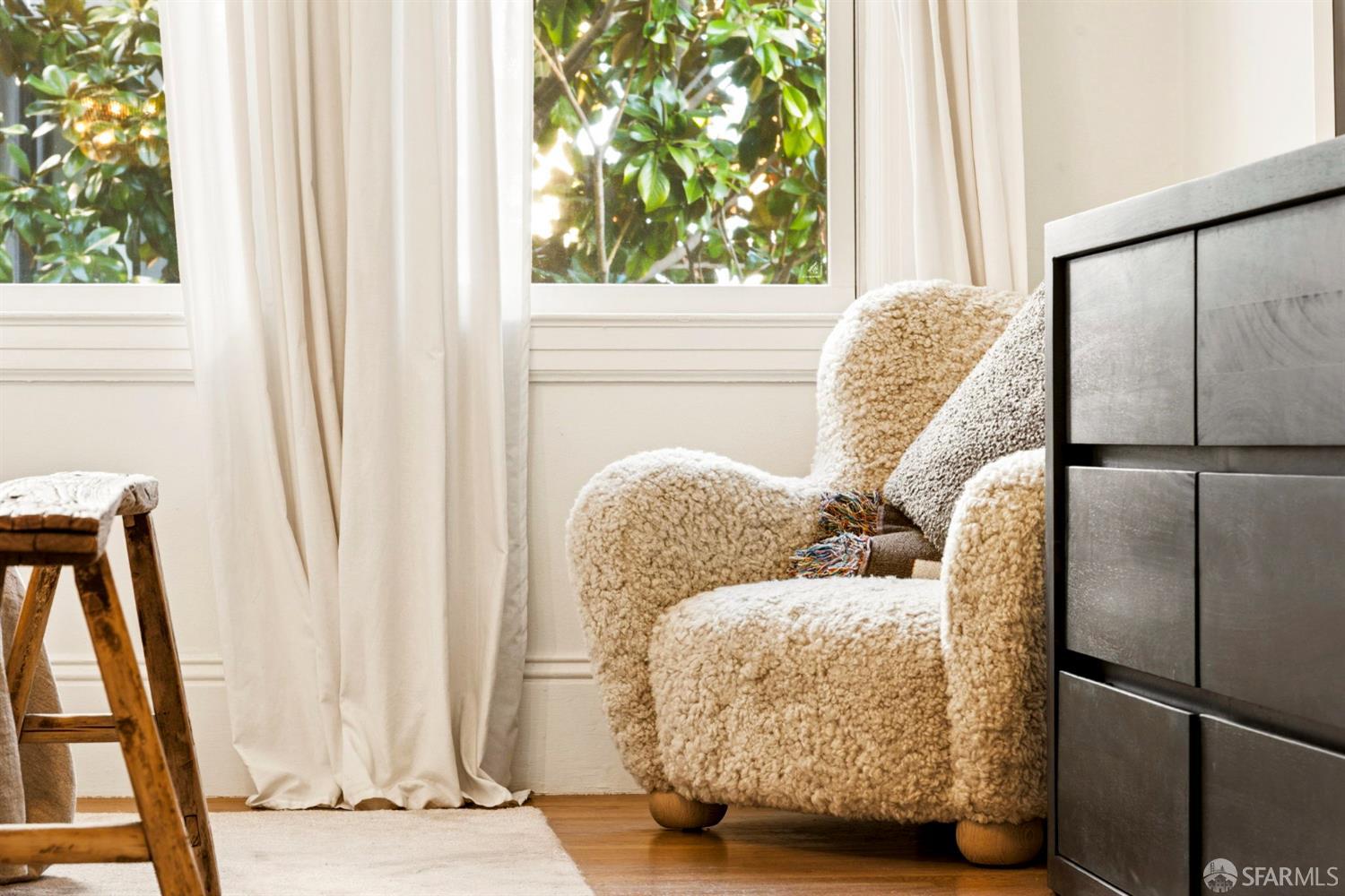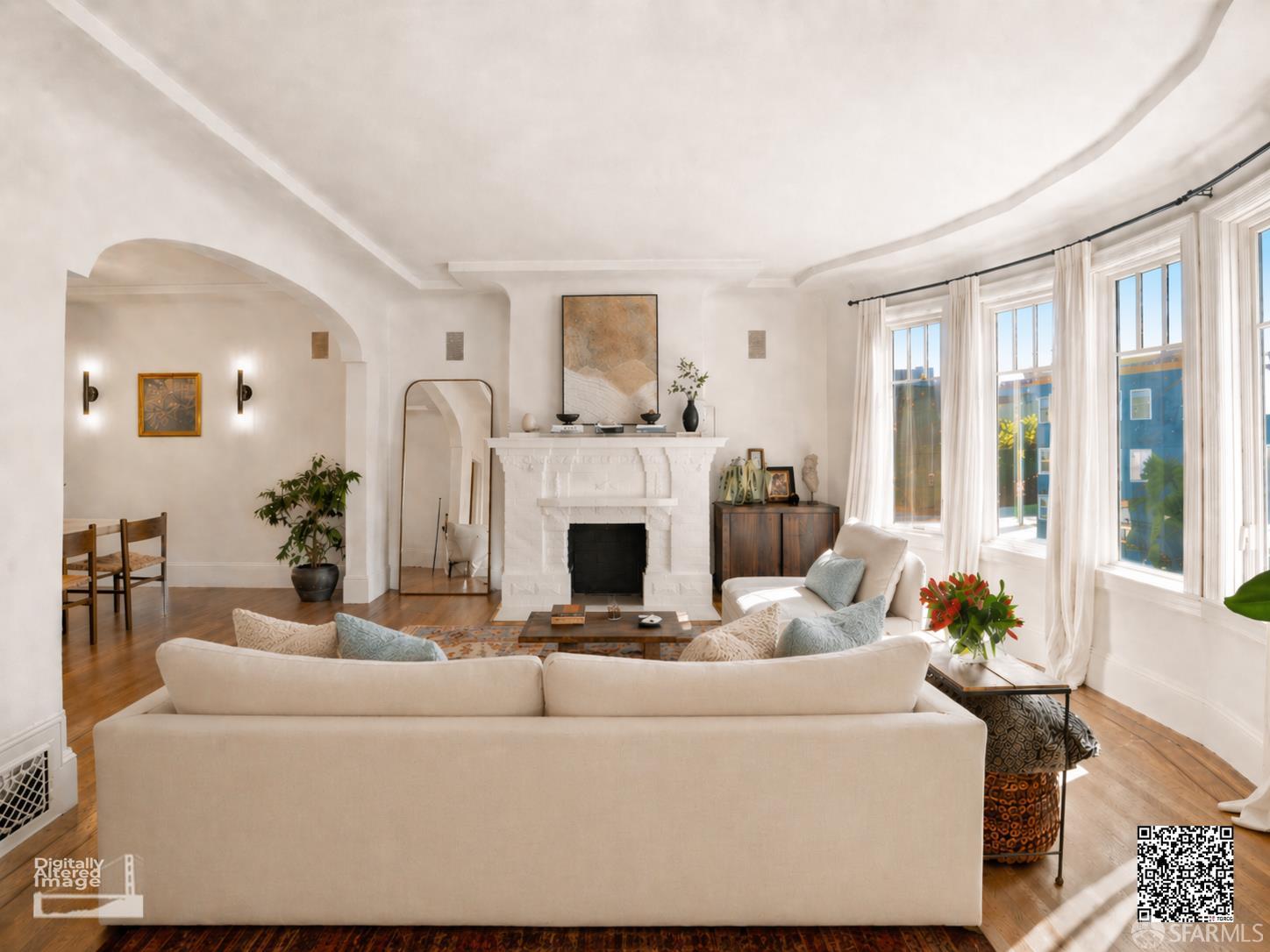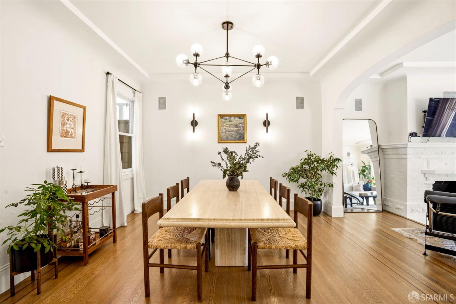 Positioned where Mid-Market gives way to the residential ease of Mission Dolores, this two-bedroom, one-bath flat rewards equally whether you’re staying in or heading out. Refinished hardwood floors and elegant millwork run throughout, complemented by designer light fixtures and double-pane windows that keep the home as quiet as it is handsome. A graceful arch frames the passage from the living room into a proper dining room, both spaces warmed by afternoon light from bay windows, anchored by a fireplace, and wired with built-in speakers. The kitchen has been thoughtfully updated with rich cabinetry, stainless steel appliances, and ample countertop space and storage. A Miele washer-dryer tucks in nearby, and a nook just off the kitchen serves neatly as a home office or a cozy spot for breakfast. Down a hallway lined with two closets sits an updated split bath. The king-sized primary bedroom offers garden views and a custom walk-in; the sunny second bedroom overlooks a tree-lined street. The home is pet- and smoke-free. A small deck steps down to a shared yard anchored by a shared bonus room with a bar suited to movie nights, workouts, or a tavern for you and your friends. Each unit in the building has its own side-by-side garage parking space. Dolores Park, the Mission’s restaurants, and Market Street transit are all within easy reach of this stylish, comfortable, classic San Francisco flat.
