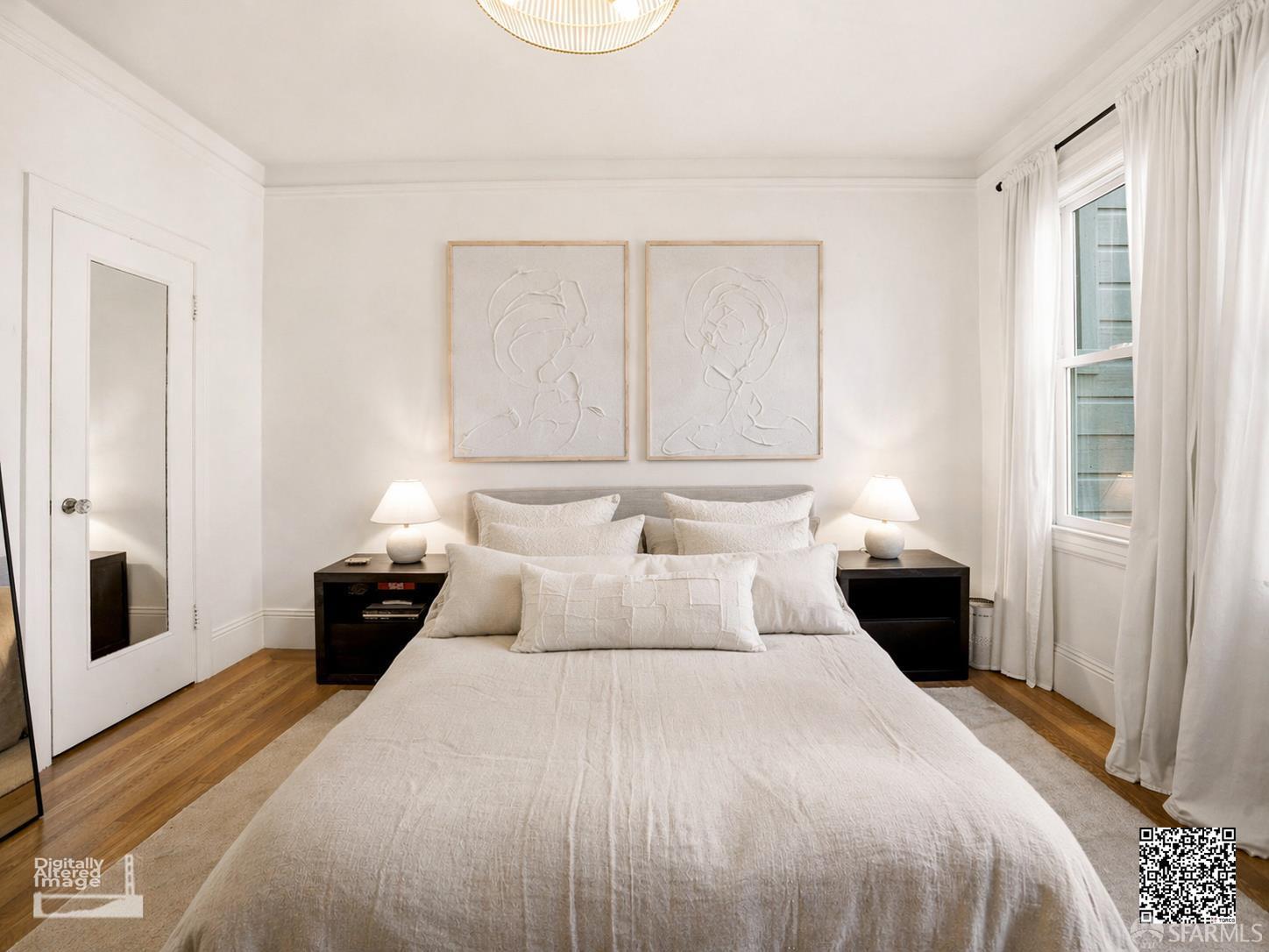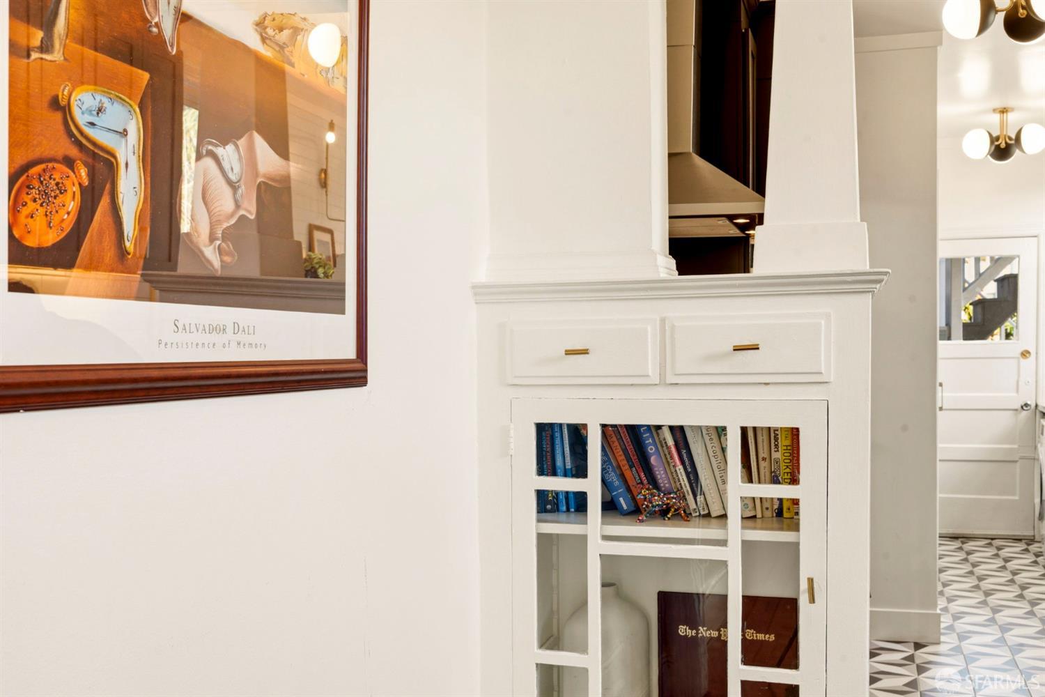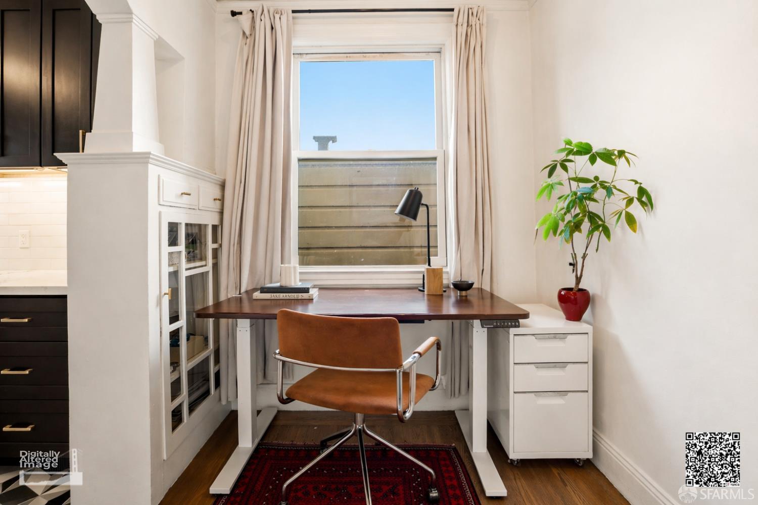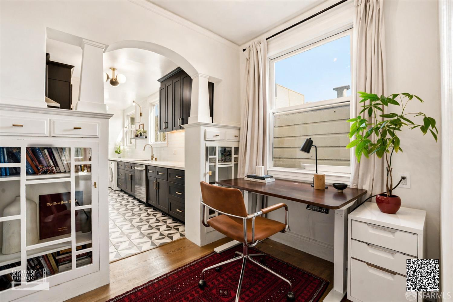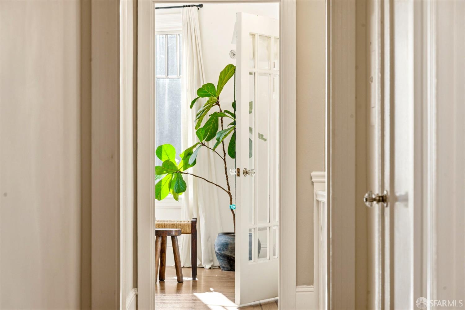 Positioned where Mid-Market gives way to the residential ease of Mission Dolores, this two-bedroom, one-bath flat rewards equally whether you’re staying in or heading out. Refinished hardwood floors and elegant millwork run throughout, complemented by designer light fixtures and double-pane windows that keep the home as quiet as it is handsome. A graceful arch frames the passage from the living room into a proper dining room, both spaces warmed by afternoon light from bay windows, anchored by a fireplace, and wired with built-in speakers. The kitchen has been thoughtfully updated with rich cabinetry, stainless steel appliances, and ample countertop space and storage. A Miele washer-dryer tucks in nearby, and a nook just off the kitchen serves neatly as a home office or a cozy spot for breakfast. Down a hallway lined with two closets sits an updated split bath. The king-sized primary bedroom offers garden views and a custom walk-in; the sunny second bedroom overlooks a tree-lined street. The home is pet- and smoke-free. A small deck steps down to a shared yard anchored by a shared bonus room with a bar suited to movie nights, workouts, or a tavern for you and your friends. Each unit in the building has its own side-by-side garage parking space. Dolores Park, the Mission’s restaurants, and Market Street transit are all within easy reach of this stylish, comfortable, classic San Francisco flat.