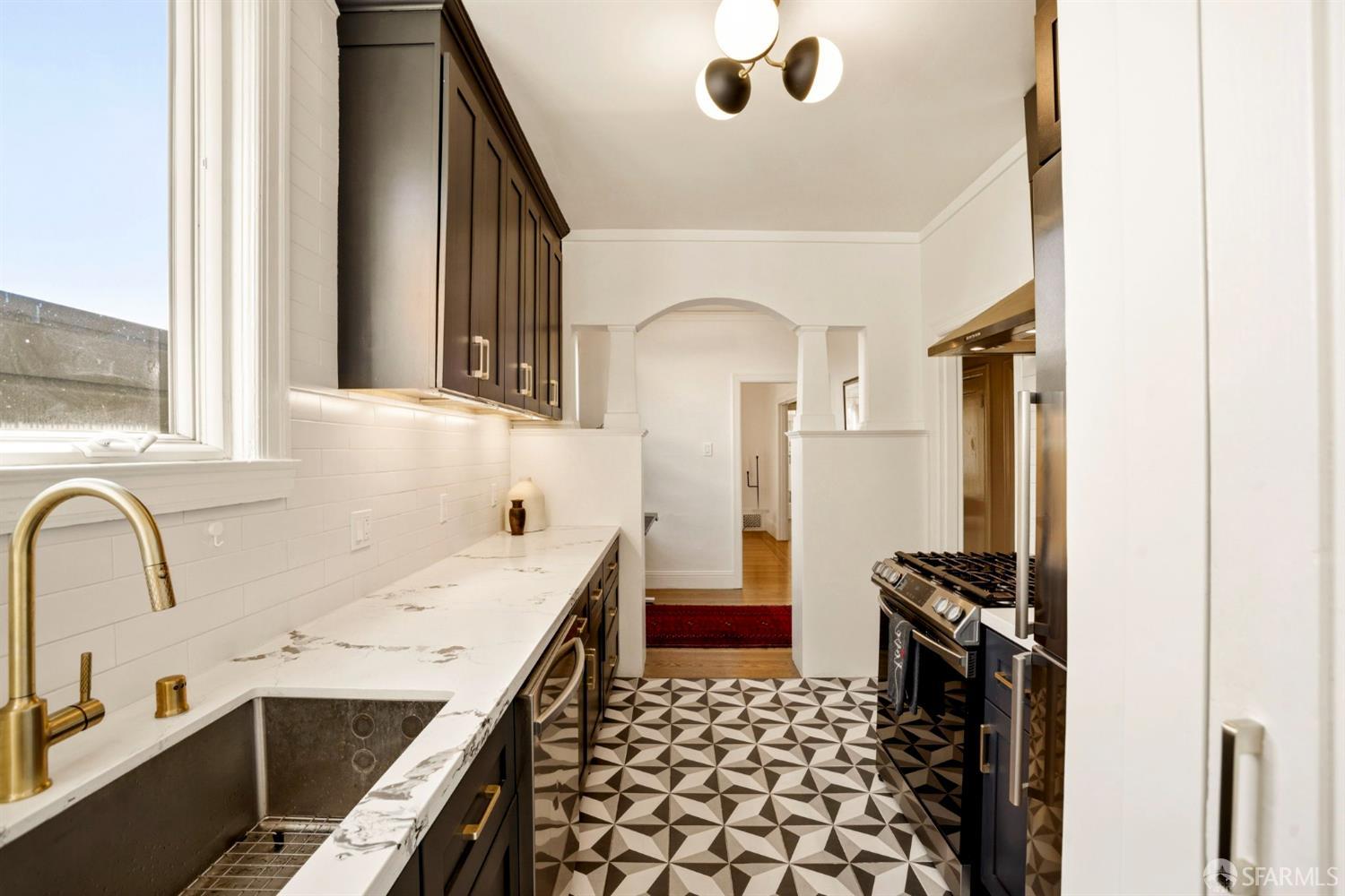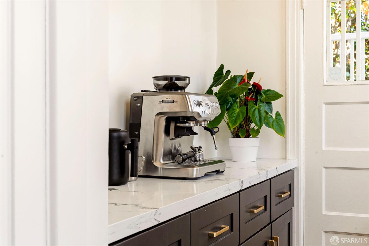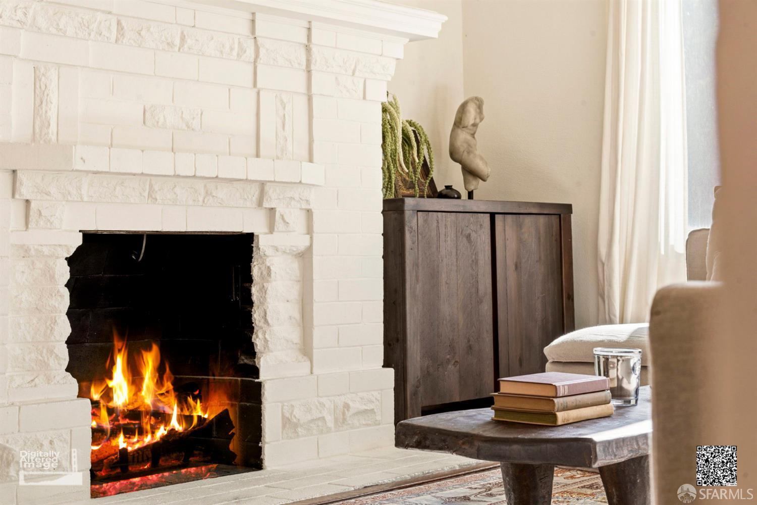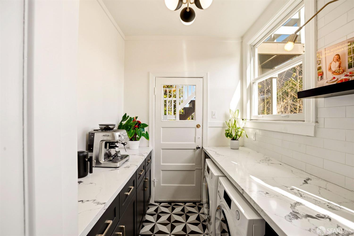 Positioned where Mid-Market gives way to the residential ease of Mission Dolores, this two-bedroom, one-bath flat rewards equally whether you’re staying in or heading out. Refinished hardwood floors and elegant millwork run throughout, complemented by designer light fixtures and double-pane windows that keep the home as quiet as it is handsome. A graceful arch frames the passage from the living room into a proper dining room, both spaces warmed by afternoon light from bay windows, anchored by a fireplace, and wired with built-in speakers. The kitchen has been thoughtfully updated with rich cabinetry, stainless steel appliances, and ample countertop space and storage. A Miele washer-dryer tucks in nearby, and a nook just off the kitchen serves neatly as a home office or a cozy spot for breakfast. Down a hallway lined with two closets sits an updated split bath. The king-sized primary bedroom offers garden views and a custom walk-in; the sunny second bedroom overlooks a tree-lined street. The home is pet- and smoke-free. A small deck steps down to a shared yard anchored by a shared bonus room with a bar suited to movie nights, workouts, or a tavern for you and your friends. Each unit in the building has its own side-by-side garage parking space. Dolores Park, the Mission’s restaurants, and Market Street transit are all within easy reach of this stylish, comfortable, classic San Francisco flat.