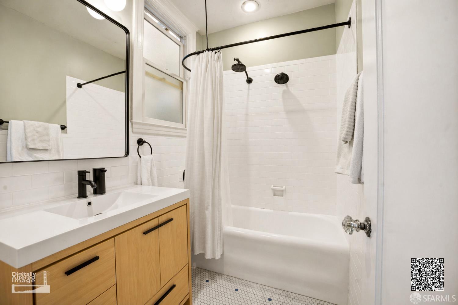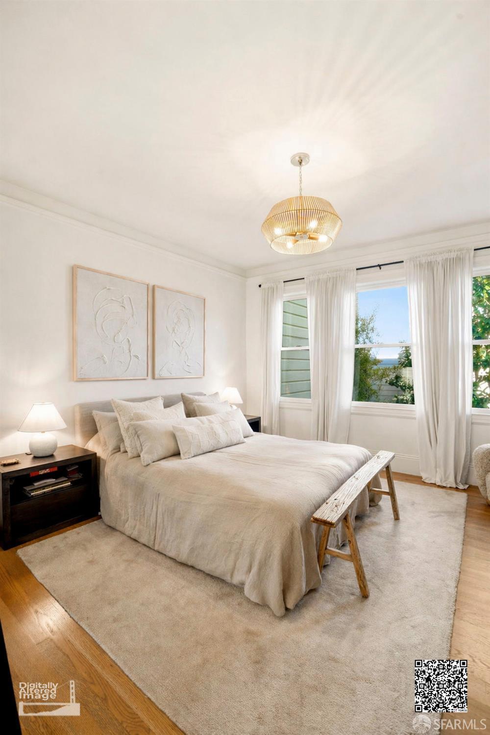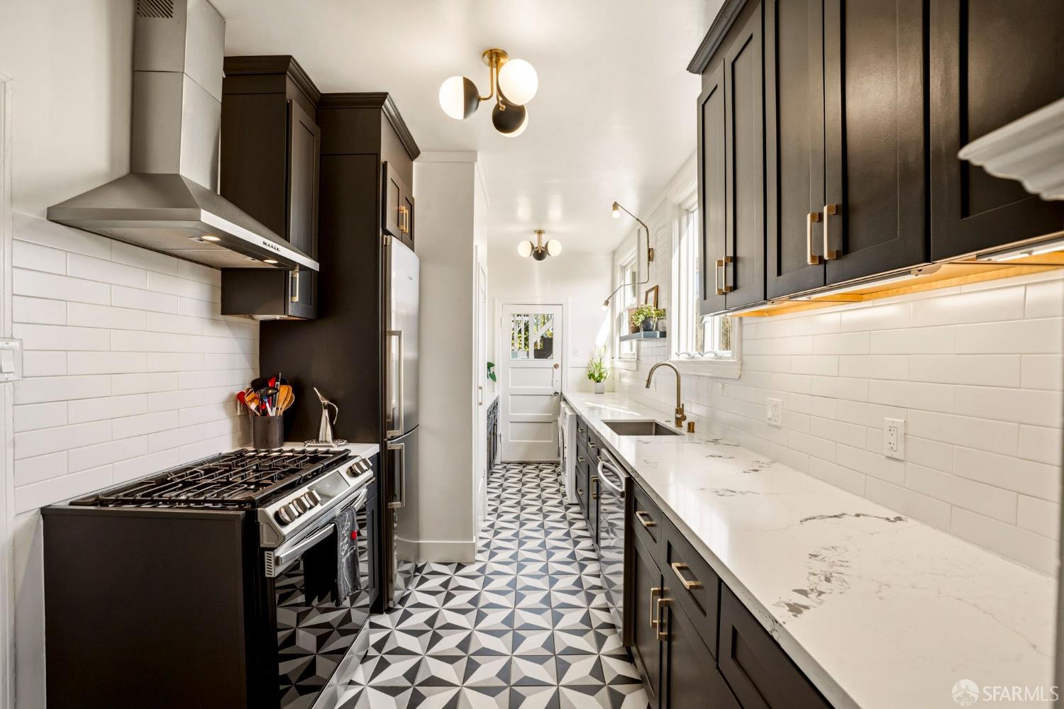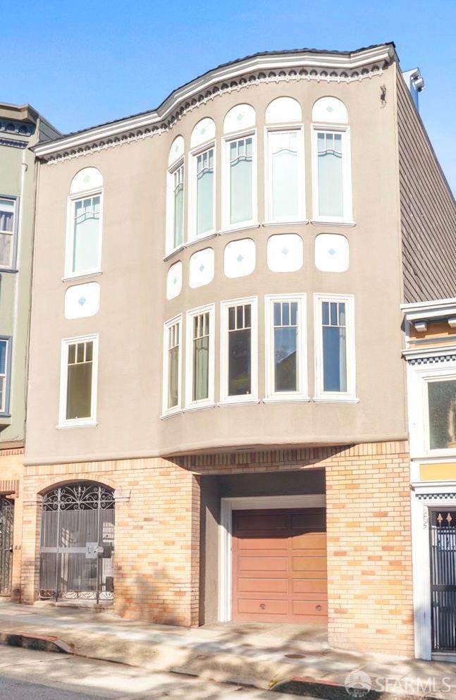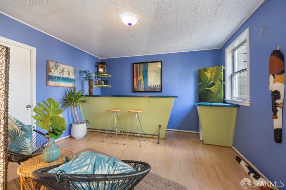 Positioned where Mid-Market gives way to the residential ease of Mission Dolores, this two-bedroom, one-bath flat rewards equally whether you’re staying in or heading out. Refinished hardwood floors and elegant millwork run throughout, complemented by designer light fixtures and double-pane windows that keep the home as quiet as it is handsome. A graceful arch frames the passage from the living room into a proper dining room, both spaces warmed by afternoon light from bay windows, anchored by a fireplace, and wired with built-in speakers. The kitchen has been thoughtfully updated with rich cabinetry, stainless steel appliances, and ample countertop space and storage. A Miele washer-dryer tucks in nearby, and a nook just off the kitchen serves neatly as a home office or a cozy spot for breakfast. Down a hallway lined with two closets sits an updated split bath. The king-sized primary bedroom offers garden views and a custom walk-in; the sunny second bedroom overlooks a tree-lined street. The home is pet- and smoke-free. A small deck steps down to a shared yard anchored by a shared bonus room with a bar suited to movie nights, workouts, or a tavern for you and your friends. Each unit in the building has its own side-by-side garage parking space. Dolores Park, the Mission’s restaurants, and Market Street transit are all within easy reach of this stylish, comfortable, classic San Francisco flat.