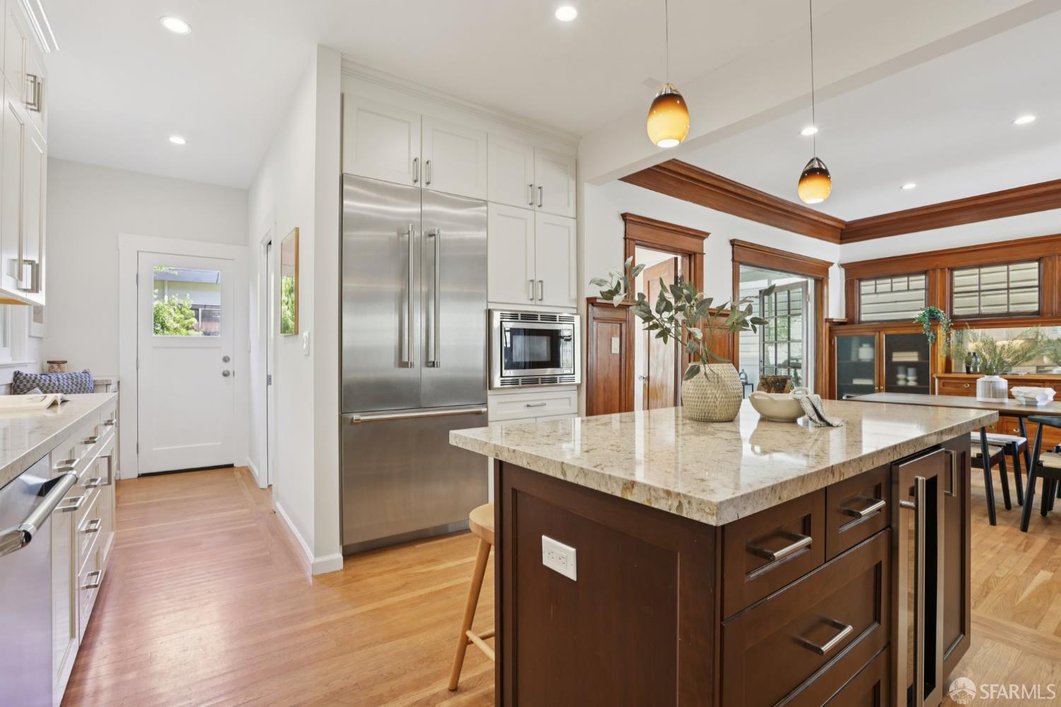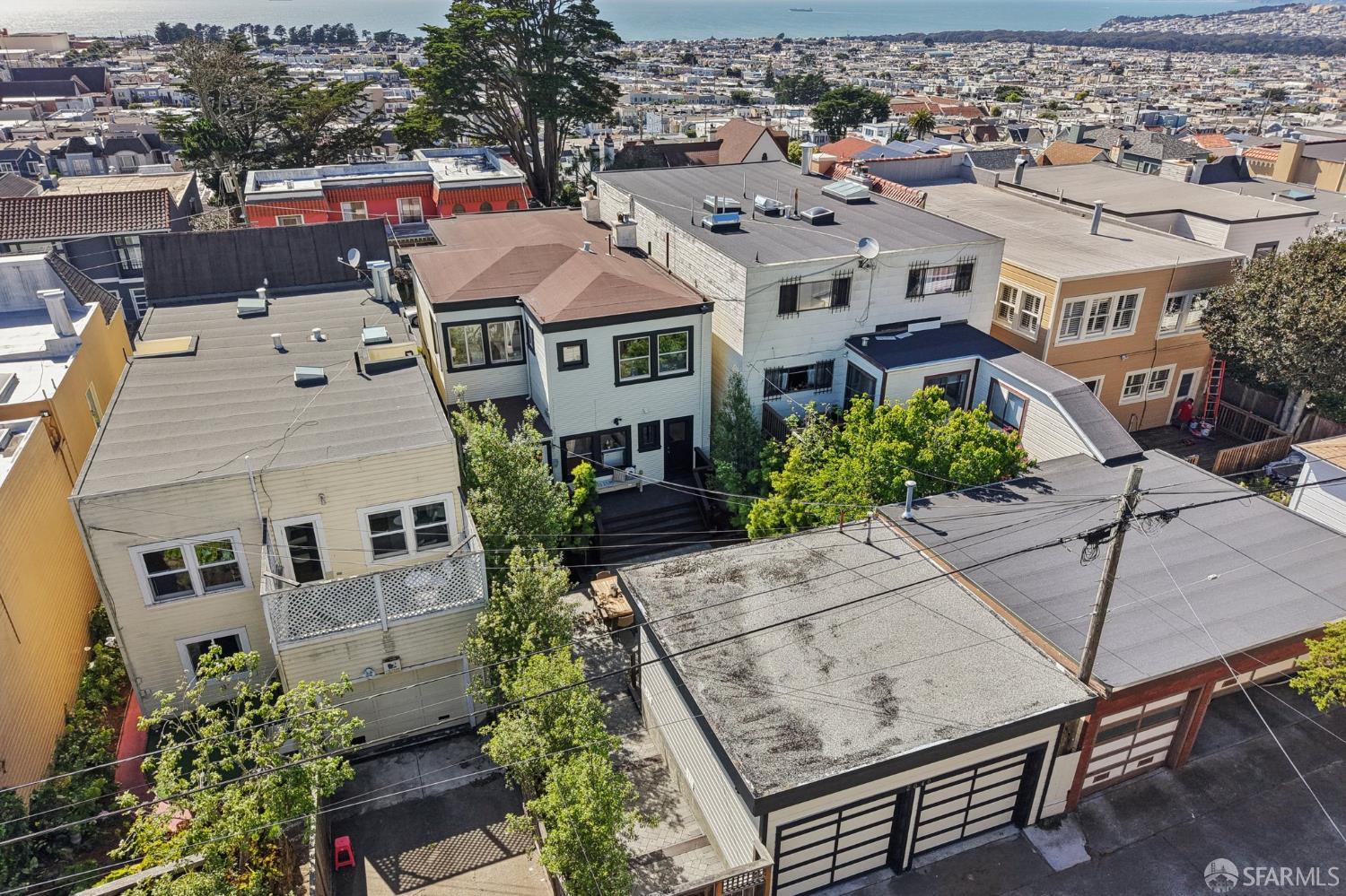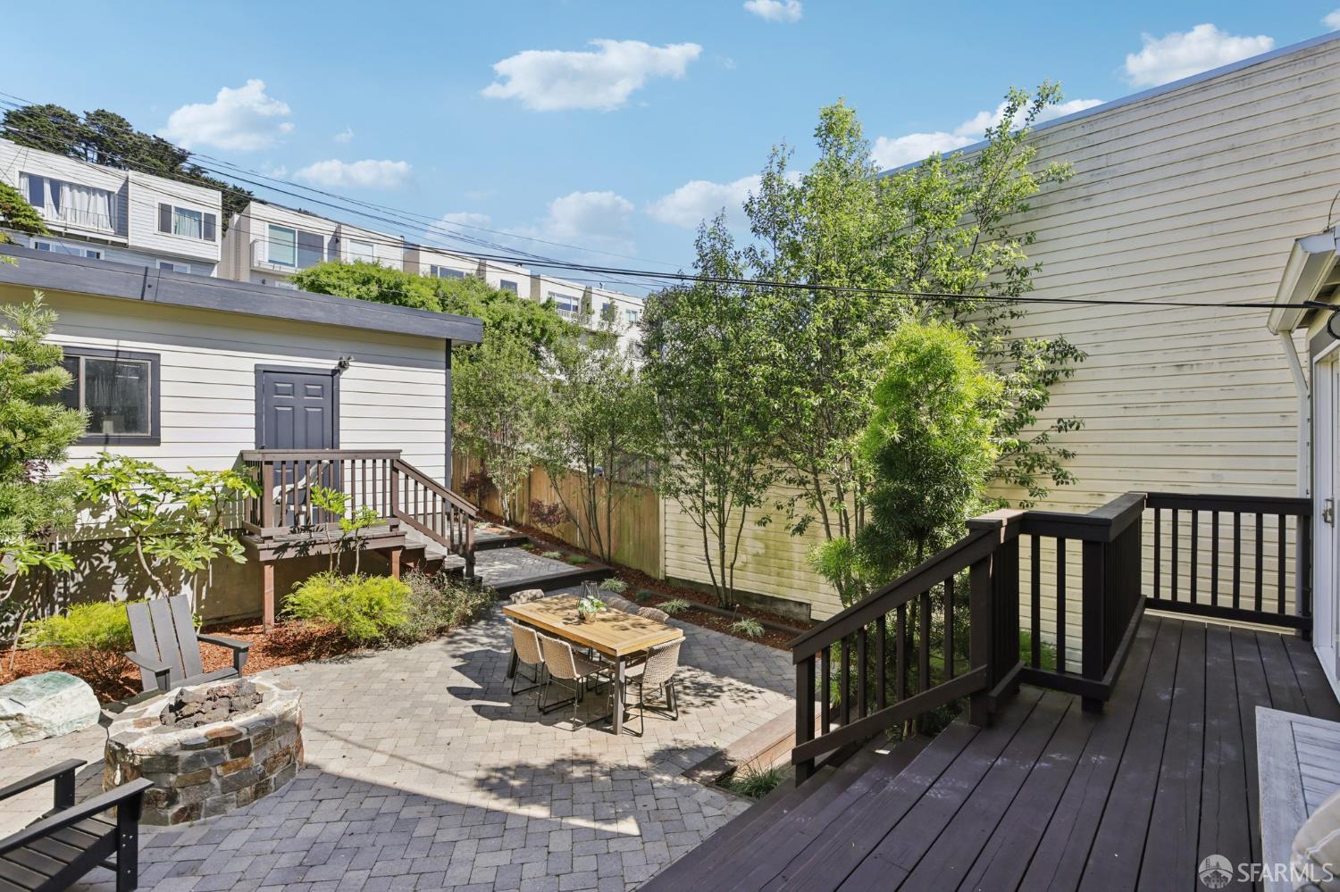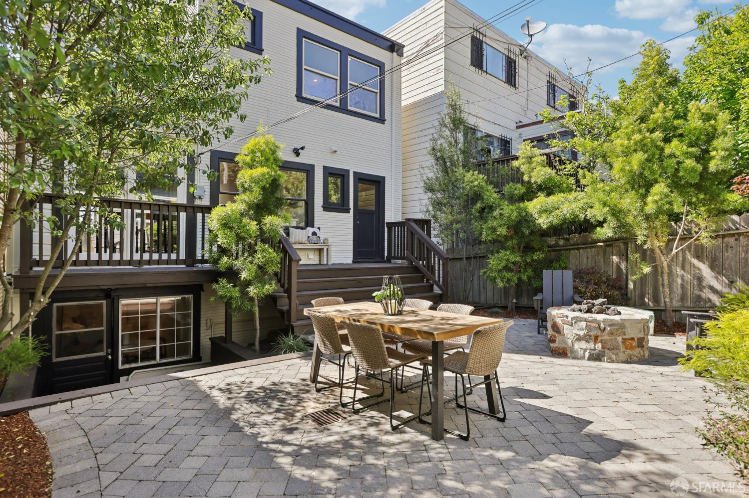 Stand alone single family home perched in Golden Gate Heights with detached two car garage, sweeping Pacific Ocean views, and three finished levels of flexible living space. This well maintained residence offers 4 bedrooms, 4.5 baths, plus 2 bonus rooms ideal for multigenerational living, guests, caretakers, or office use. Original gumwood finishes, handcrafted built ins, and period details are preserved throughout, paired with a remodeled kitchen, updated baths, and completed electrical and plumbing improvements. The top floor includes four bedrooms and two baths. The west facing front bedroom captures ocean views. The rear primary suite overlooks the garden and includes a renovated ensuite bath. The main level opens with a classic central staircase. The living room features a refinished fireplace mantel, water outlooks, and original built in cabinetry. A finished sunroom provides added space for an office, playroom, or den. The kitchen and dining areas were opened to create a modern open concept layout. This level also includes a half bath, a newly installed laundry room, and direct access to the rear deck, landscaped backyard, and firepit. The lower level, recently updated, offers a media room, wet bar, two baths, and two bonus rooms. Separate side and rear entrances, along with interior access, create strong flexibility for guests, extended family, or work from home needs. The detached rear garage faces a small alley and offers side by side parking for two cars. Additional laundry hookups are also located there. Located near West Portal, transit, shopping, and commuter routes.