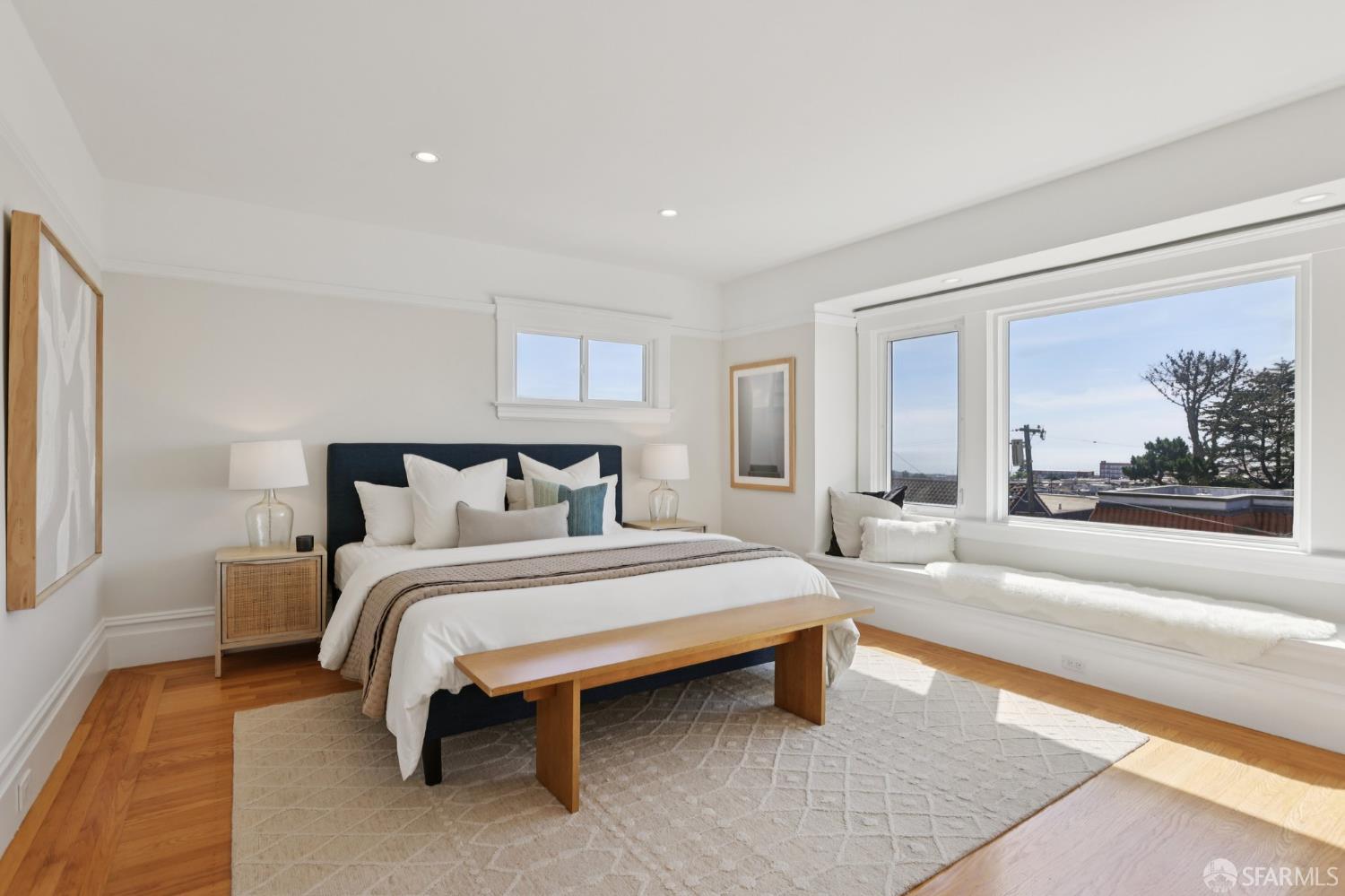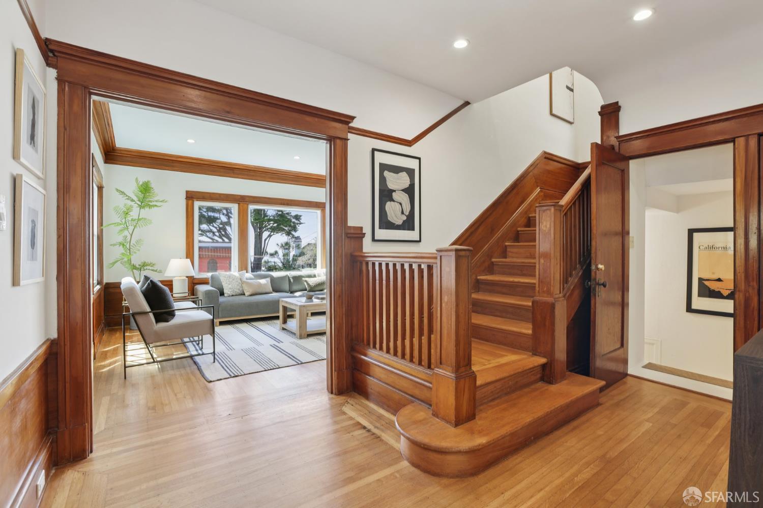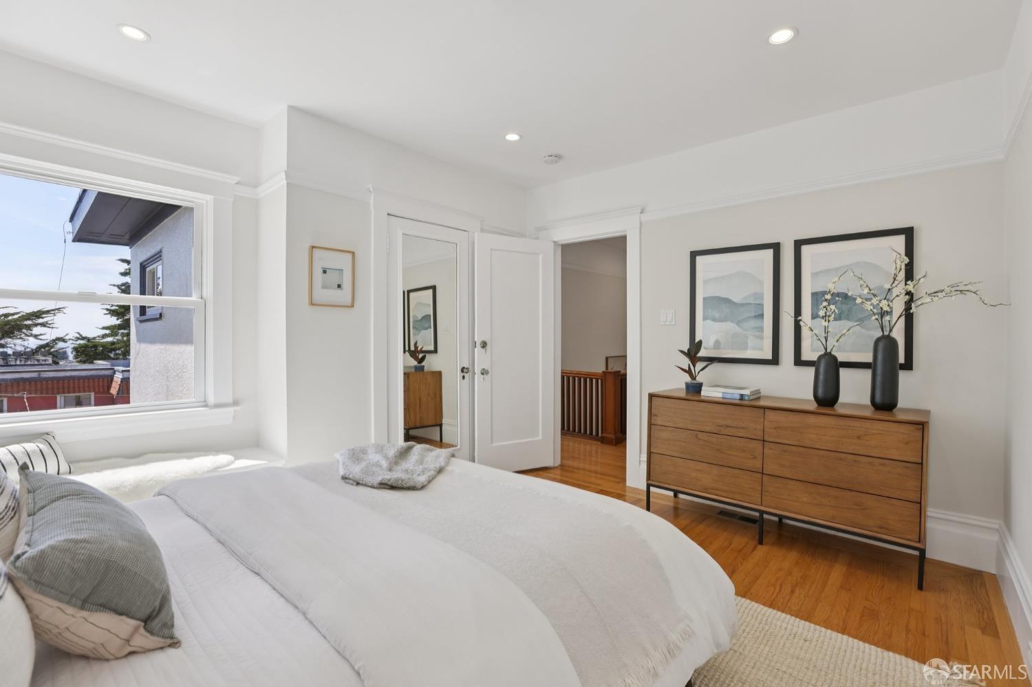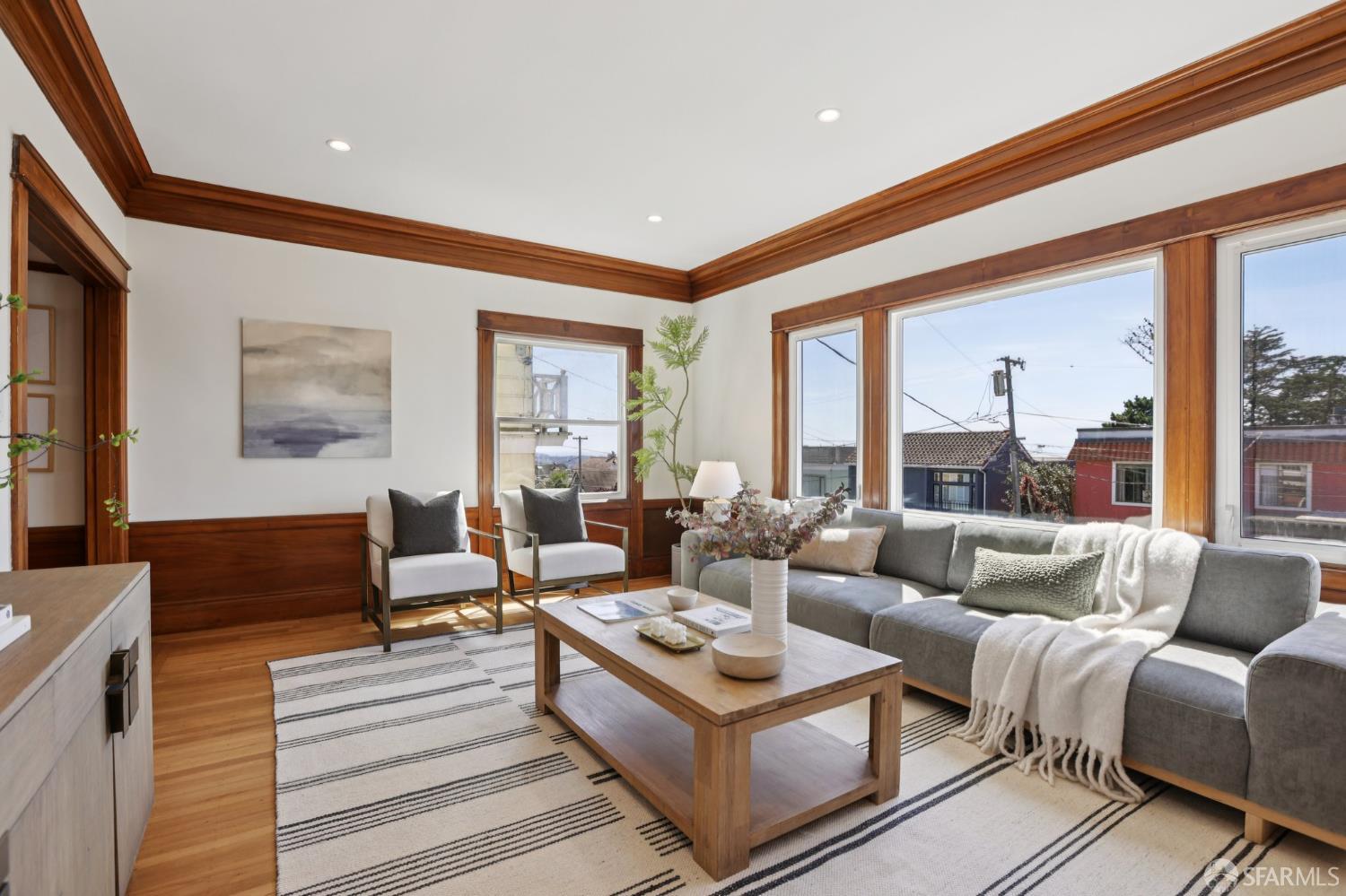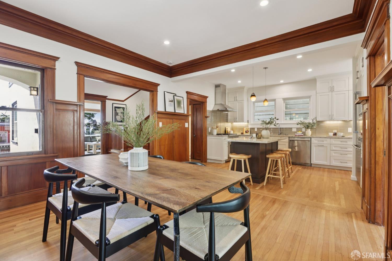 Stand alone single family home perched in Golden Gate Heights with detached two car garage, sweeping Pacific Ocean views, and three finished levels of flexible living space. This well maintained residence offers 4 bedrooms, 4.5 baths, plus 2 bonus rooms ideal for multigenerational living, guests, caretakers, or office use. Original gumwood finishes, handcrafted built ins, and period details are preserved throughout, paired with a remodeled kitchen, updated baths, and completed electrical and plumbing improvements. The top floor includes four bedrooms and two baths. The west facing front bedroom captures ocean views. The rear primary suite overlooks the garden and includes a renovated ensuite bath. The main level opens with a classic central staircase. The living room features a refinished fireplace mantel, water outlooks, and original built in cabinetry. A finished sunroom provides added space for an office, playroom, or den. The kitchen and dining areas were opened to create a modern open concept layout. This level also includes a half bath, a newly installed laundry room, and direct access to the rear deck, landscaped backyard, and firepit. The lower level, recently updated, offers a media room, wet bar, two baths, and two bonus rooms. Separate side and rear entrances, along with interior access, create strong flexibility for guests, extended family, or work from home needs. The detached rear garage faces a small alley and offers side by side parking for two cars. Additional laundry hookups are also located there. Located near West Portal, transit, shopping, and commuter routes.