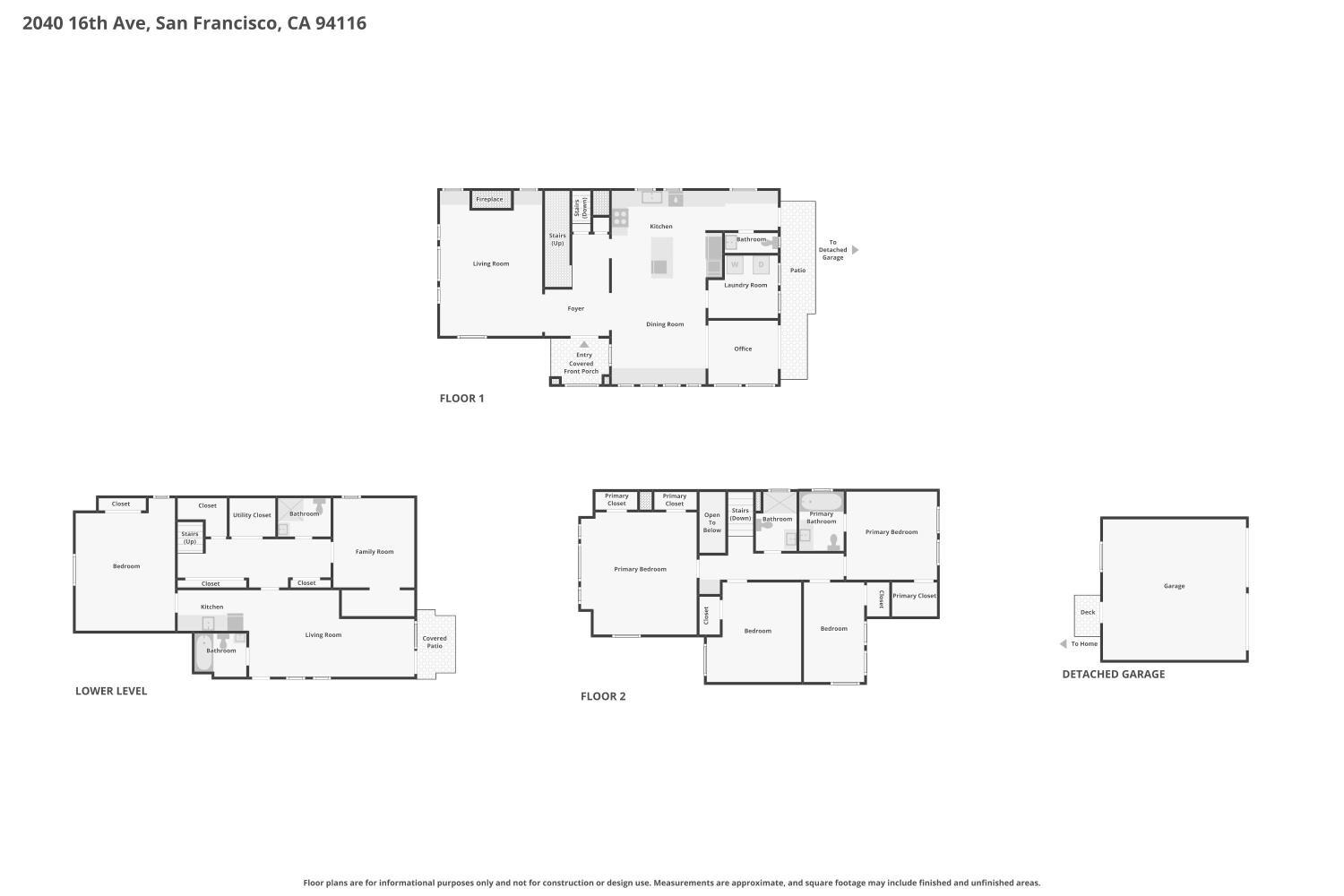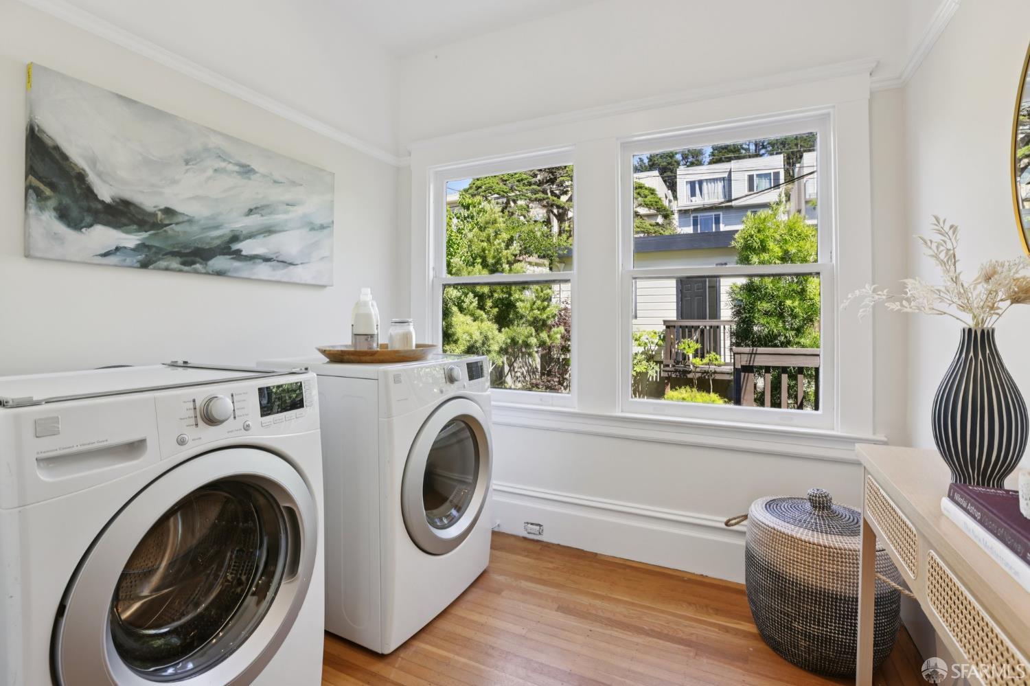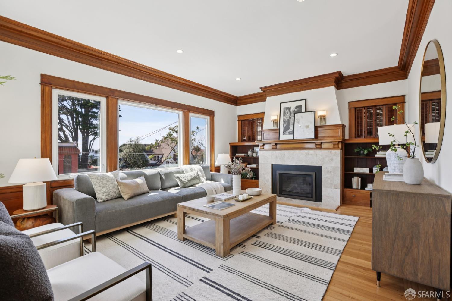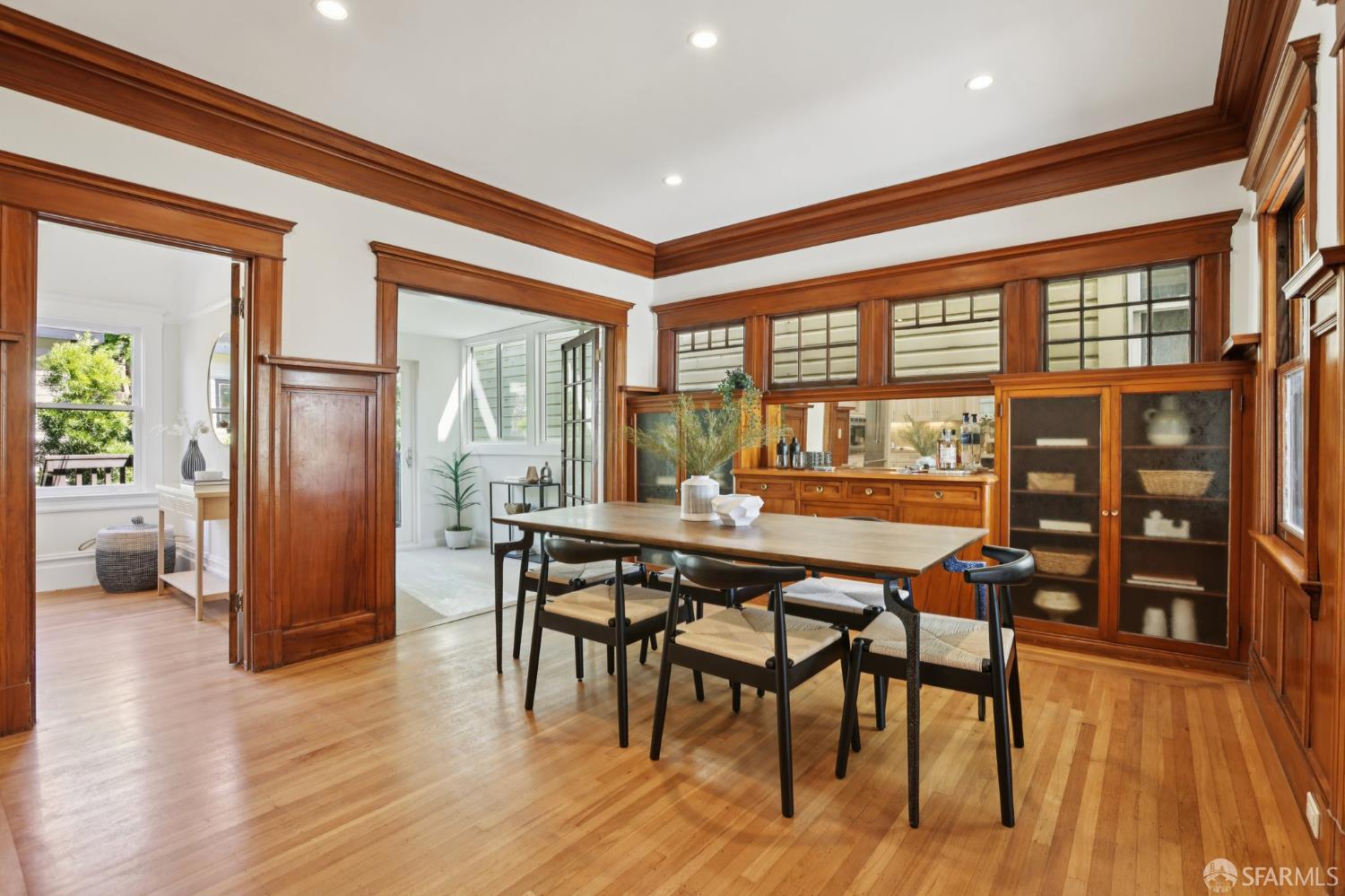 Stand alone single family home perched in Golden Gate Heights with detached two car garage, sweeping Pacific Ocean views, and three finished levels of flexible living space. This well maintained residence offers 4 bedrooms, 4.5 baths, plus 2 bonus rooms ideal for multigenerational living, guests, caretakers, or office use. Original gumwood finishes, handcrafted built ins, and period details are preserved throughout, paired with a remodeled kitchen, updated baths, and completed electrical and plumbing improvements. The top floor includes four bedrooms and two baths. The west facing front bedroom captures ocean views. The rear primary suite overlooks the garden and includes a renovated ensuite bath. The main level opens with a classic central staircase. The living room features a refinished fireplace mantel, water outlooks, and original built in cabinetry. A finished sunroom provides added space for an office, playroom, or den. The kitchen and dining areas were opened to create a modern open concept layout. This level also includes a half bath, a newly installed laundry room, and direct access to the rear deck, landscaped backyard, and firepit. The lower level, recently updated, offers a media room, wet bar, two baths, and two bonus rooms. Separate side and rear entrances, along with interior access, create strong flexibility for guests, extended family, or work from home needs. The detached rear garage faces a small alley and offers side by side parking for two cars. Additional laundry hookups are also located there. Located near West Portal, transit, shopping, and commuter routes.