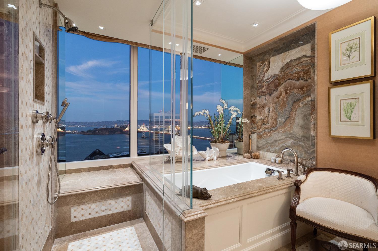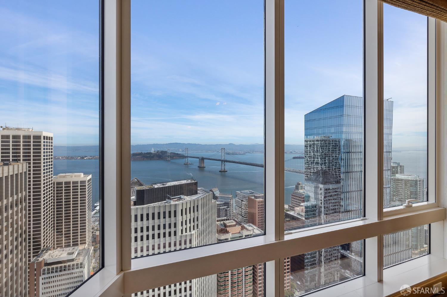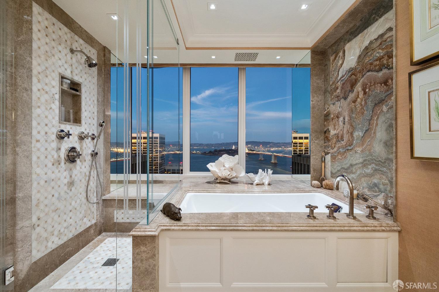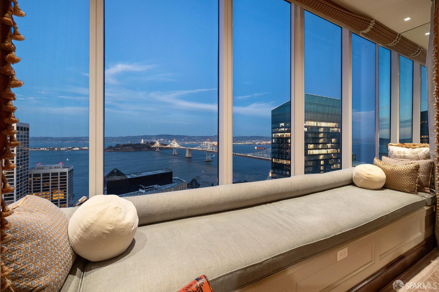 Glamorous high floor Grand Residence on coveted northeast corner, largest floor plan except penthouse. Enjoy stunning, sweeping City, Bridge and Bay views! Down to the studs 2 year renovation by globally renowned team of designers, architects, contractors. Hand laid floors, top-grade mill work, custom wall treatment, artful stonework. Two bedroom suites + rich walnut paneled library. Spacious foyer and living room with surround windows, elegant formal dining room enjoys exciting Bay Bridge lights close-up. Elegant primary bedroom suite with 2nd bath, steam shower, double walk-in closets. Guest bedroom suite with full bath. Spacious eat-in gourmet kitchen with bay and bridge views. Bejeweled powder room, large laundry room. Custom integrated, app-controlled A/V, motorized shades, lighting & HVAC. New acoustic insulation throughout. Updated systems. 2-car dedicated garage parking- self park OR valet. Reserved wine locker & extra storage. Separate Grand Residences lobby. Unmatched services with luxury amenities: club lounges, private dining room, screening room, concierge, catering kitchen, saline swimming pool, fitness center, children’s center, pilates, massage & yoga studios, outdoor patios. 24-7-365 attended lobby + security. Luxe living at its best, ideal and convenient location near the waterfront Embarcadero.