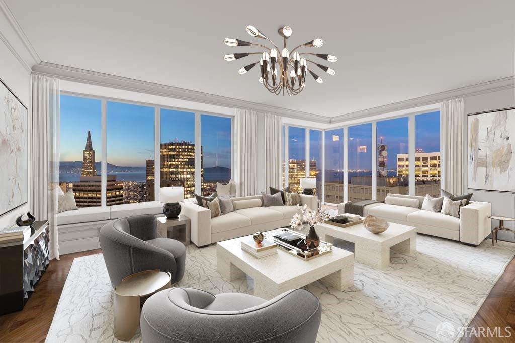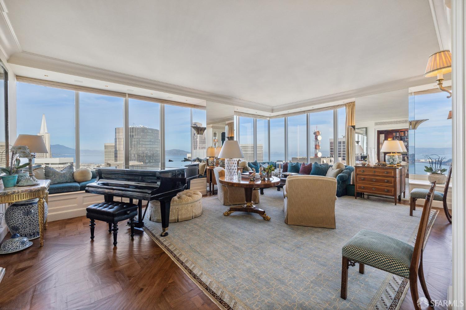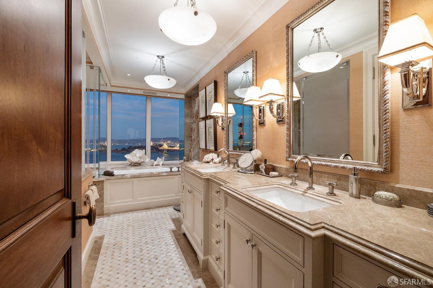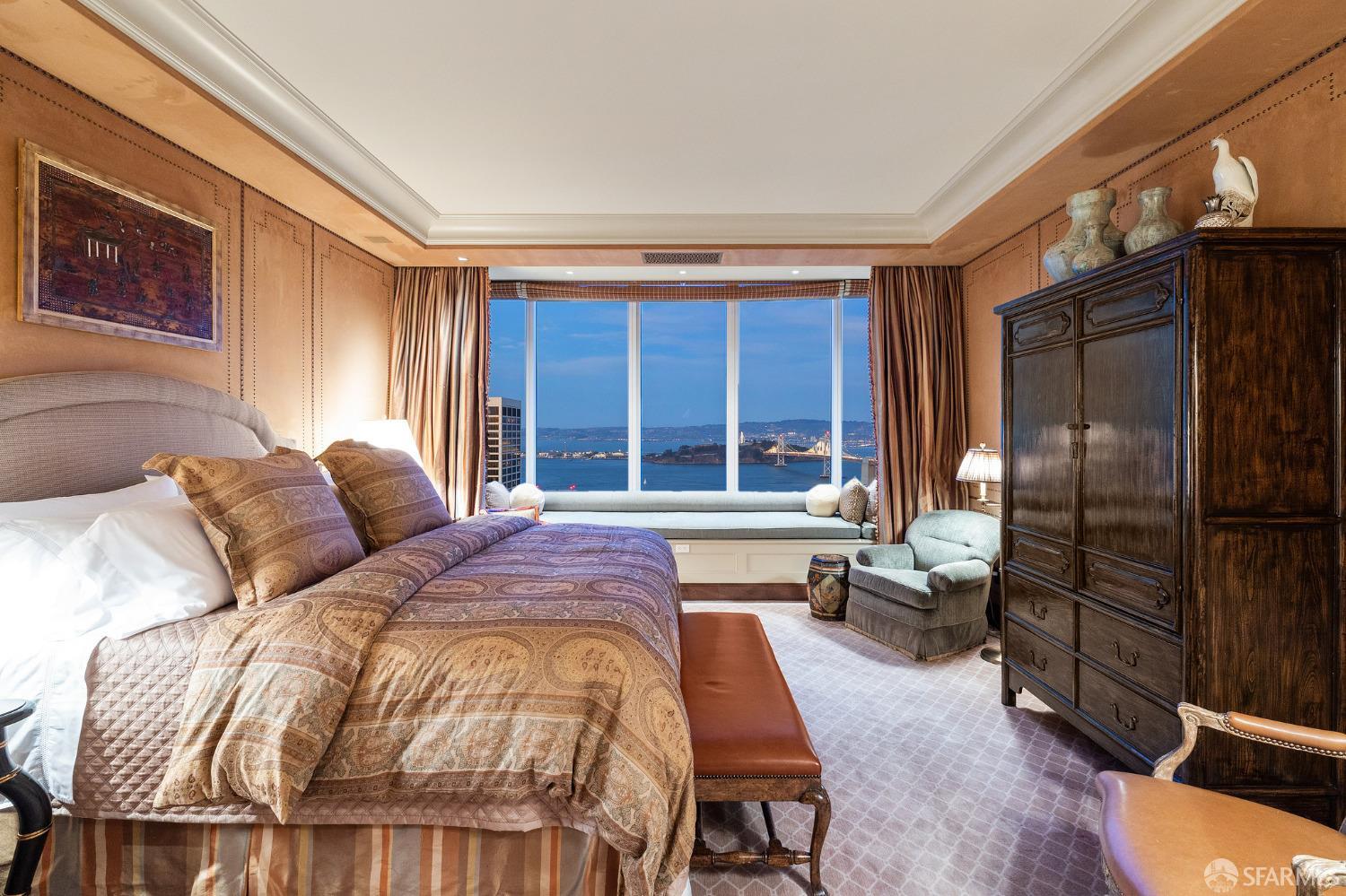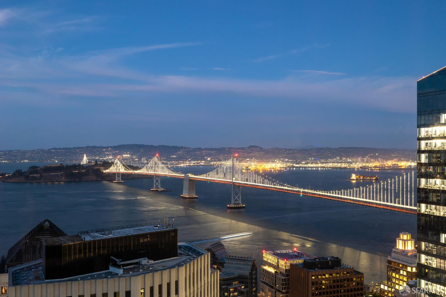 Glamorous high floor Grand Residence on coveted northeast corner, largest floor plan except penthouse. Enjoy stunning, sweeping City, Bridge and Bay views! Down to the studs 2 year renovation by globally renowned team of designers, architects, contractors. Hand laid floors, top-grade mill work, custom wall treatment, artful stonework. Two bedroom suites + rich walnut paneled library. Spacious foyer and living room with surround windows, elegant formal dining room enjoys exciting Bay Bridge lights close-up. Elegant primary bedroom suite with 2nd bath, steam shower, double walk-in closets. Guest bedroom suite with full bath. Spacious eat-in gourmet kitchen with bay and bridge views. Bejeweled powder room, large laundry room. Custom integrated, app-controlled A/V, motorized shades, lighting & HVAC. New acoustic insulation throughout. Updated systems. 2-car dedicated garage parking- self park OR valet. Reserved wine locker & extra storage. Separate Grand Residences lobby. Unmatched services with luxury amenities: club lounges, private dining room, screening room, concierge, catering kitchen, saline swimming pool, fitness center, children’s center, pilates, massage & yoga studios, outdoor patios. 24-7-365 attended lobby + security. Luxe living at its best, ideal and convenient location near the waterfront Embarcadero.