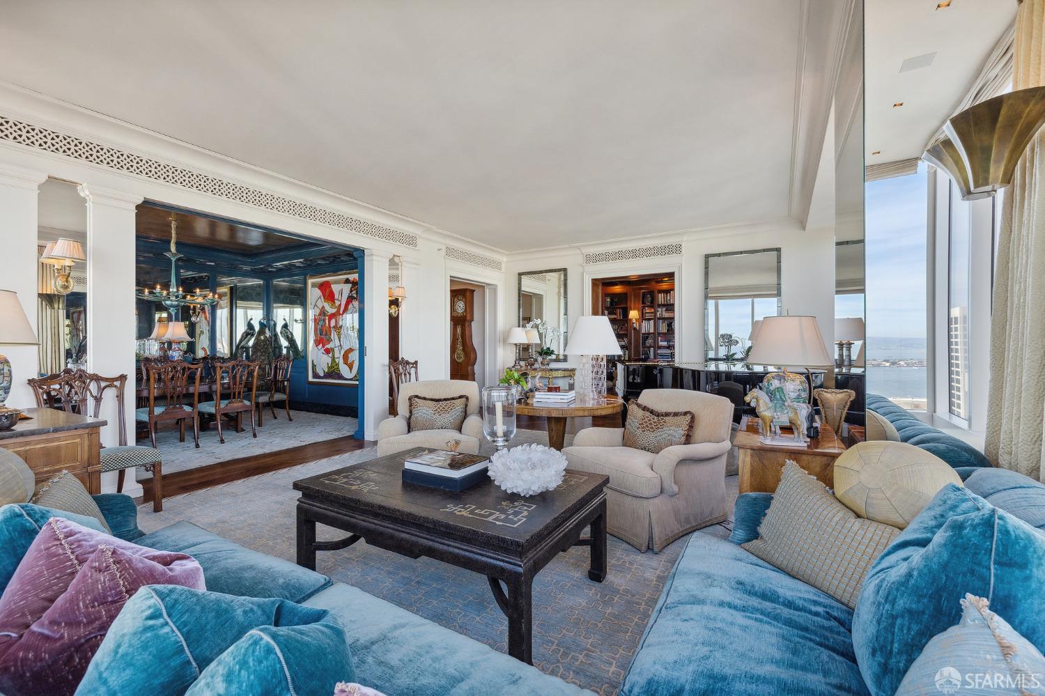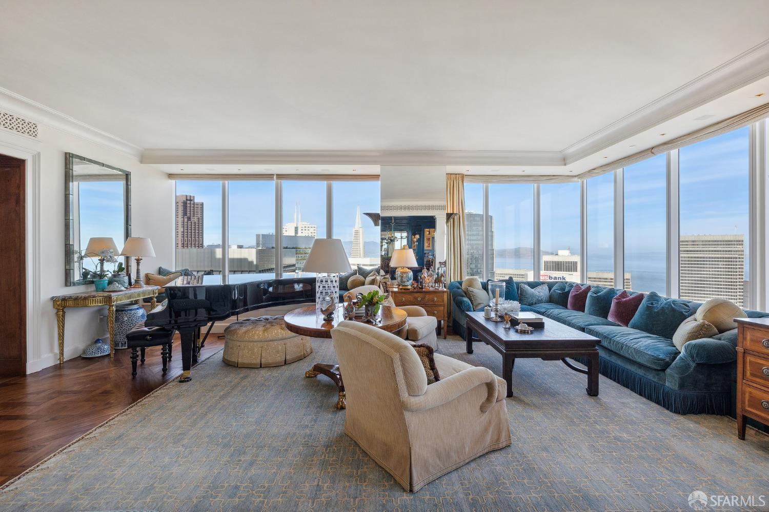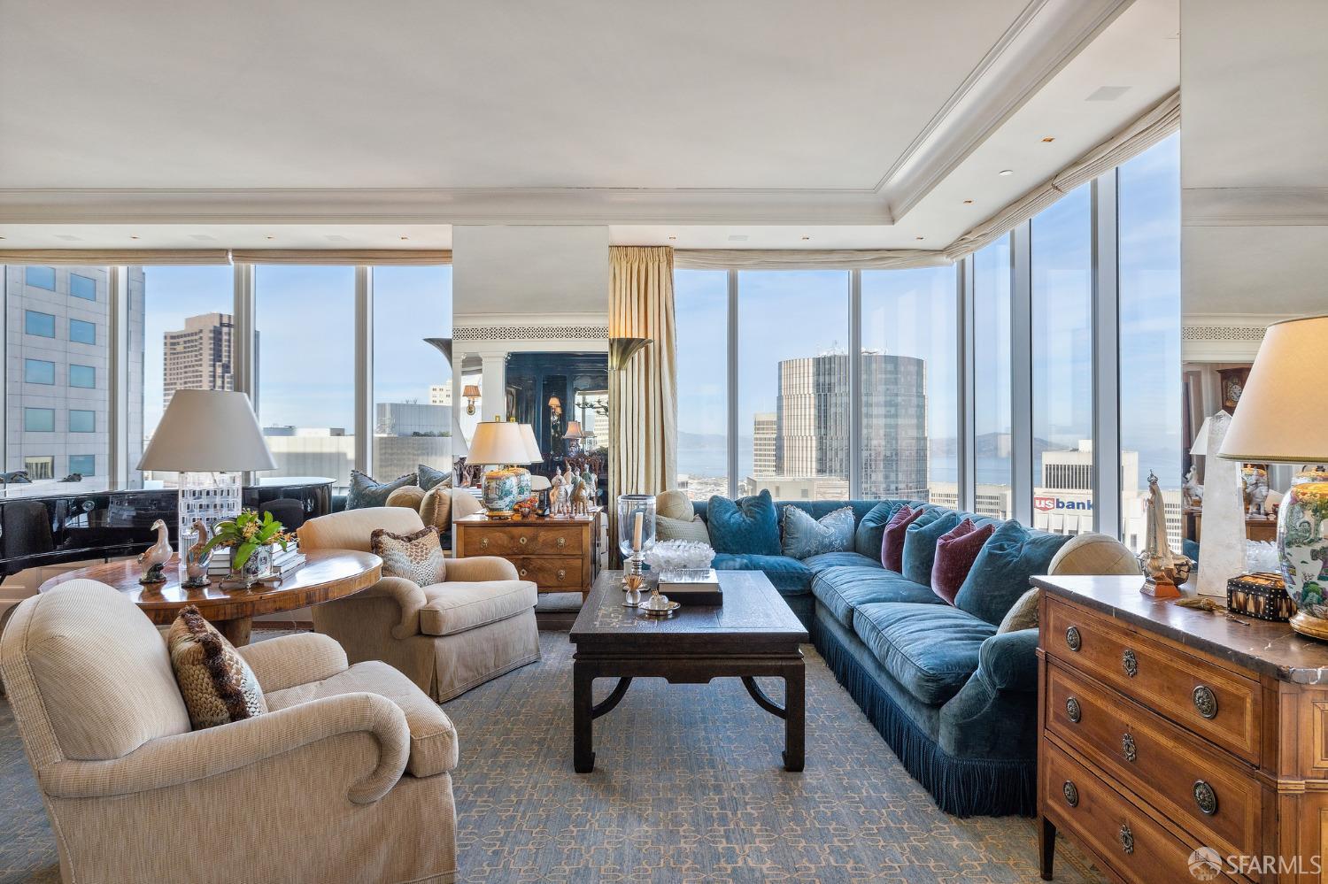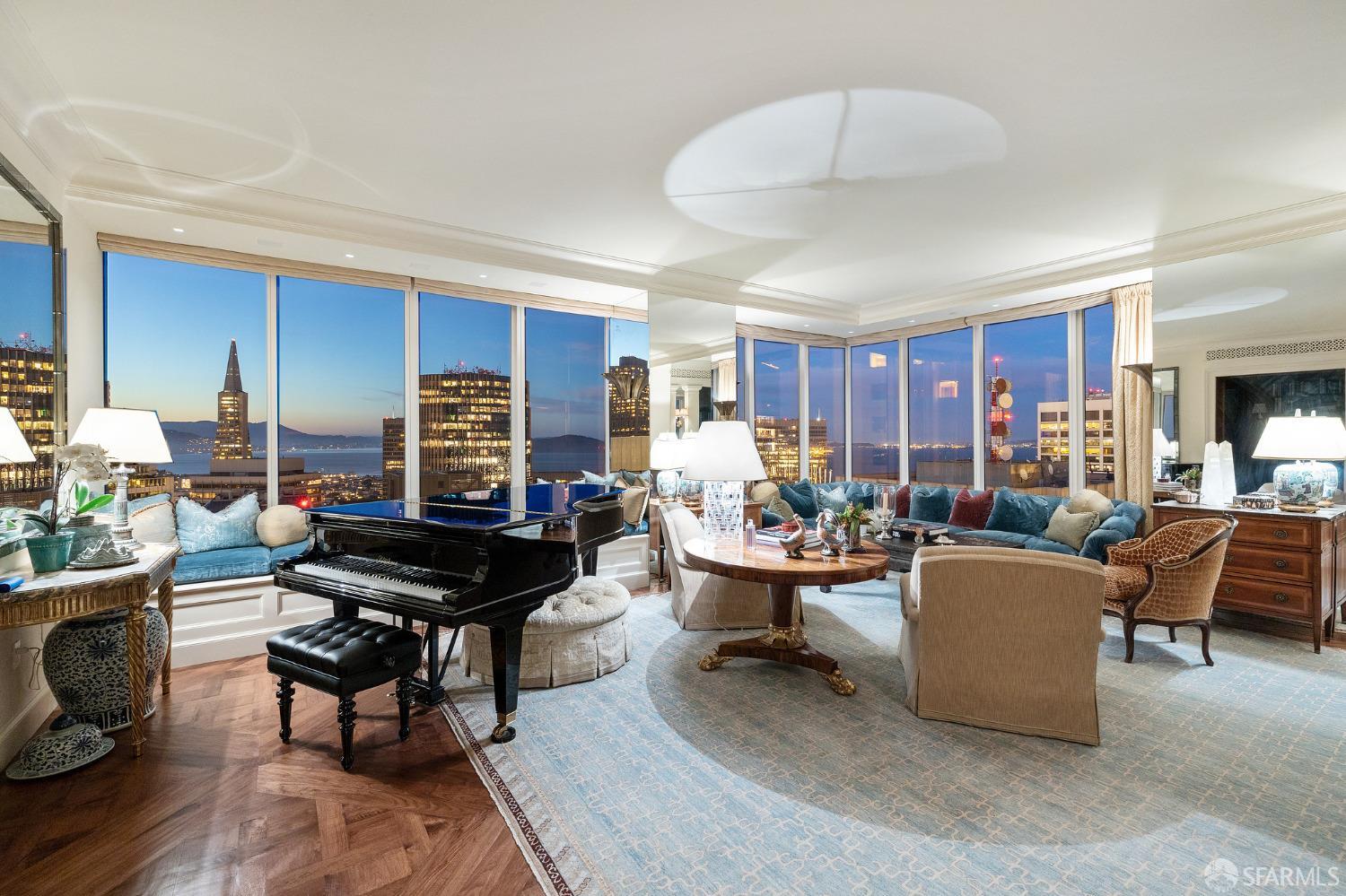 Glamorous high floor Grand Residence on coveted northeast corner, largest floor plan except penthouse. Enjoy stunning, sweeping City, Bridge and Bay views! Down to the studs 2 year renovation by globally renowned team of designers, architects, contractors. Hand laid floors, top-grade mill work, custom wall treatment, artful stonework. Two bedroom suites + rich walnut paneled library. Spacious foyer and living room with surround windows, elegant formal dining room enjoys exciting Bay Bridge lights close-up. Elegant primary bedroom suite with 2nd bath, steam shower, double walk-in closets. Guest bedroom suite with full bath. Spacious eat-in gourmet kitchen with bay and bridge views. Bejeweled powder room, large laundry room. Custom integrated, app-controlled A/V, motorized shades, lighting & HVAC. New acoustic insulation throughout. Updated systems. 2-car dedicated garage parking- self park OR valet. Reserved wine locker & extra storage. Separate Grand Residences lobby. Unmatched services with luxury amenities: club lounges, private dining room, screening room, concierge, catering kitchen, saline swimming pool, fitness center, children’s center, pilates, massage & yoga studios, outdoor patios. 24-7-365 attended lobby + security. Luxe living at its best, ideal and convenient location near the waterfront Embarcadero.