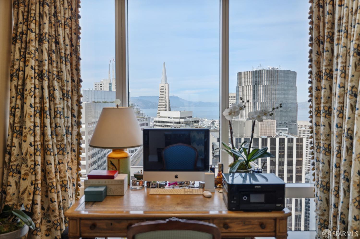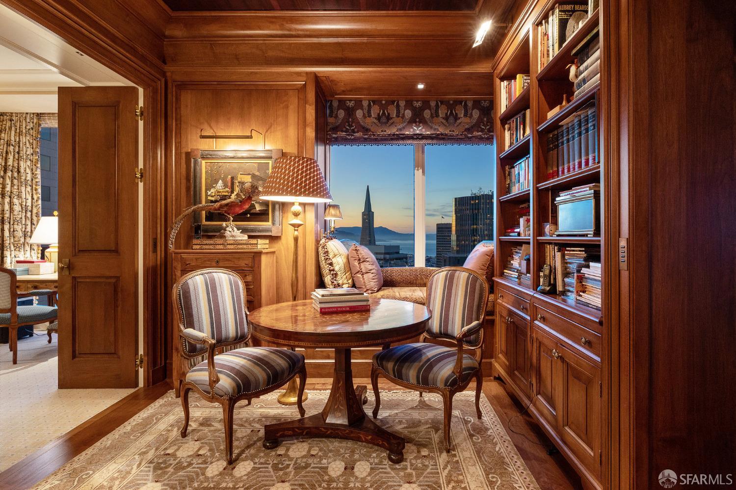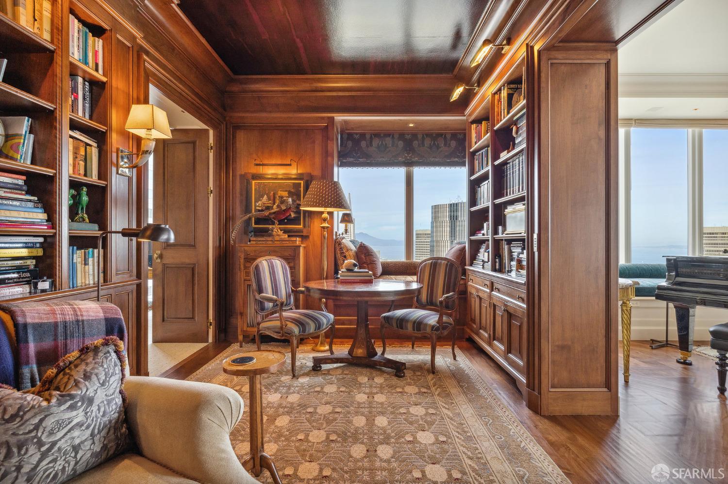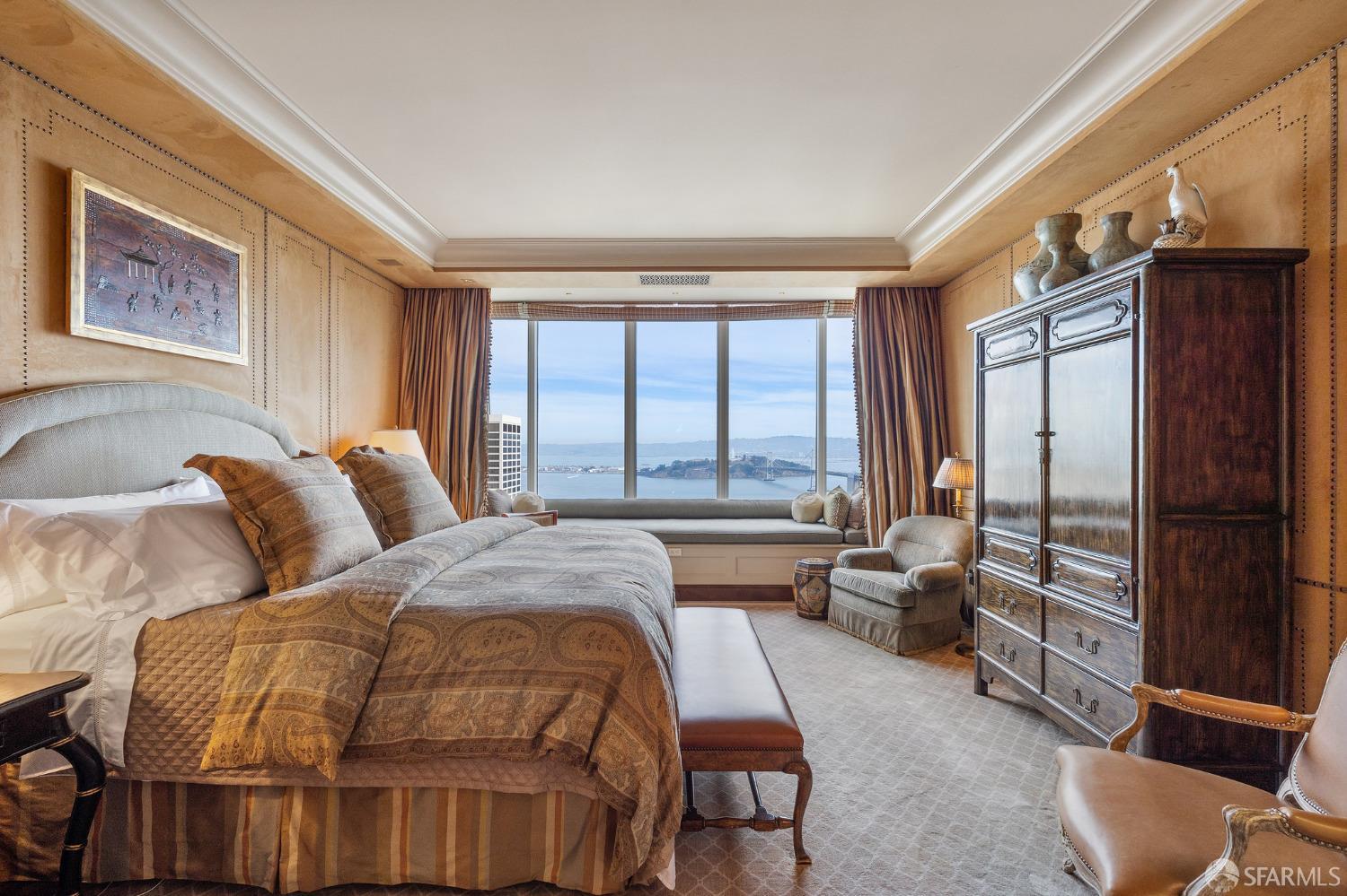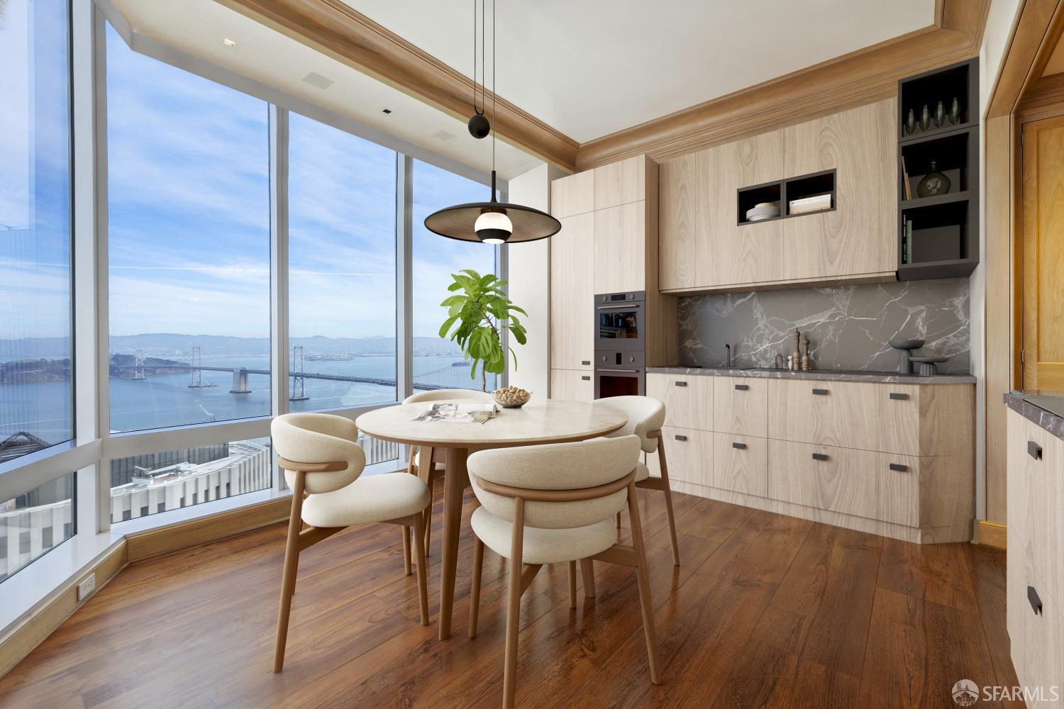 Glamorous high floor Grand Residence on coveted northeast corner, largest floor plan except penthouse. Enjoy stunning, sweeping City, Bridge and Bay views! Down to the studs 2 year renovation by globally renowned team of designers, architects, contractors. Hand laid floors, top-grade mill work, custom wall treatment, artful stonework. Two bedroom suites + rich walnut paneled library. Spacious foyer and living room with surround windows, elegant formal dining room enjoys exciting Bay Bridge lights close-up. Elegant primary bedroom suite with 2nd bath, steam shower, double walk-in closets. Guest bedroom suite with full bath. Spacious eat-in gourmet kitchen with bay and bridge views. Bejeweled powder room, large laundry room. Custom integrated, app-controlled A/V, motorized shades, lighting & HVAC. New acoustic insulation throughout. Updated systems. 2-car dedicated garage parking- self park OR valet. Reserved wine locker & extra storage. Separate Grand Residences lobby. Unmatched services with luxury amenities: club lounges, private dining room, screening room, concierge, catering kitchen, saline swimming pool, fitness center, children’s center, pilates, massage & yoga studios, outdoor patios. 24-7-365 attended lobby + security. Luxe living at its best, ideal and convenient location near the waterfront Embarcadero.