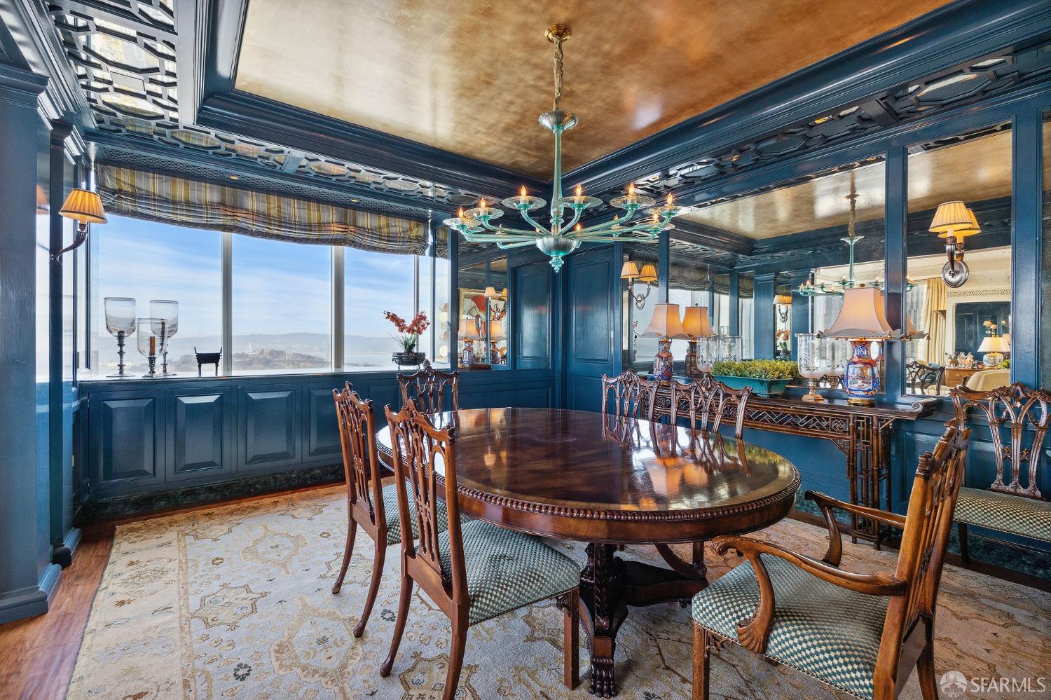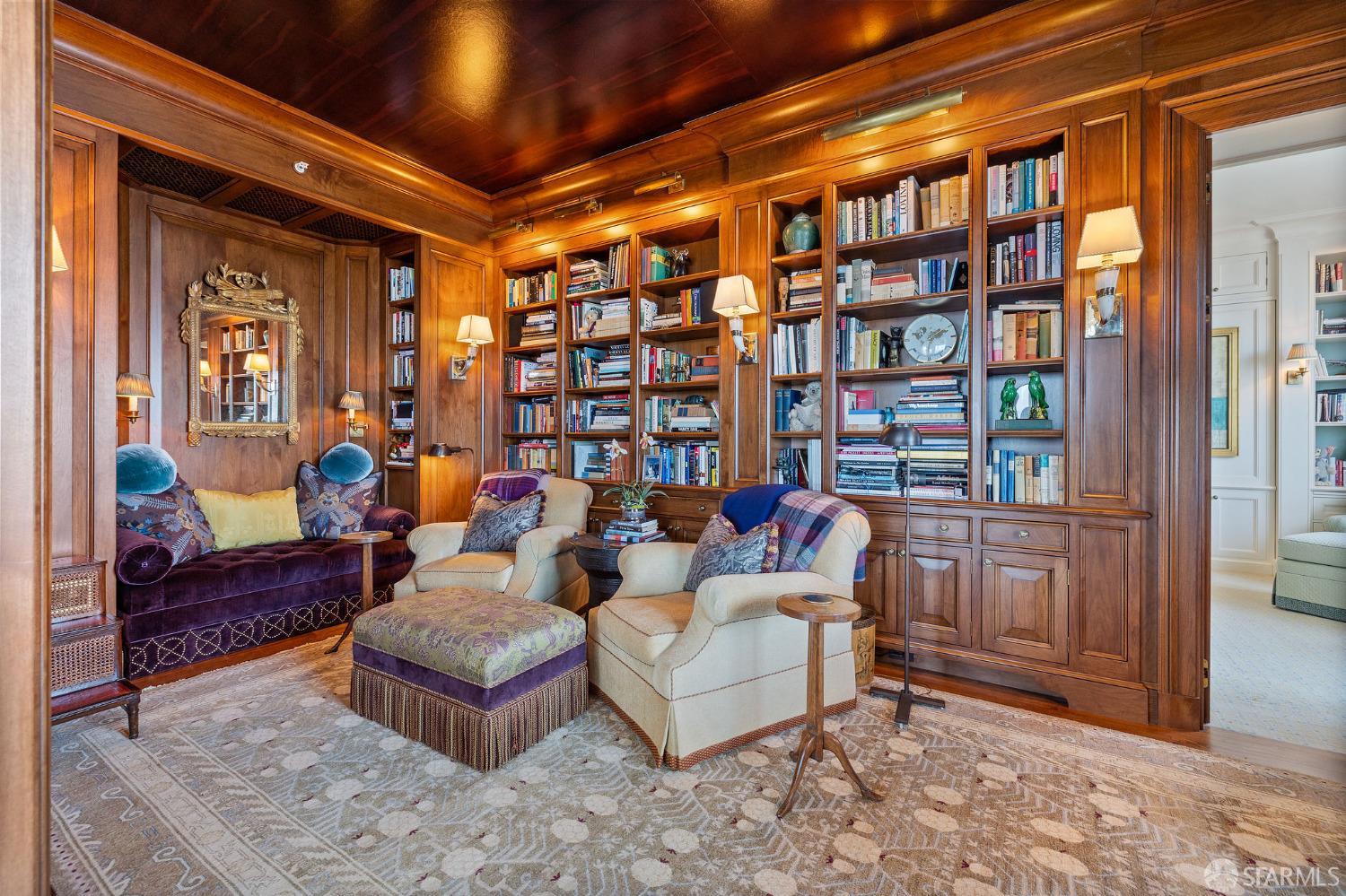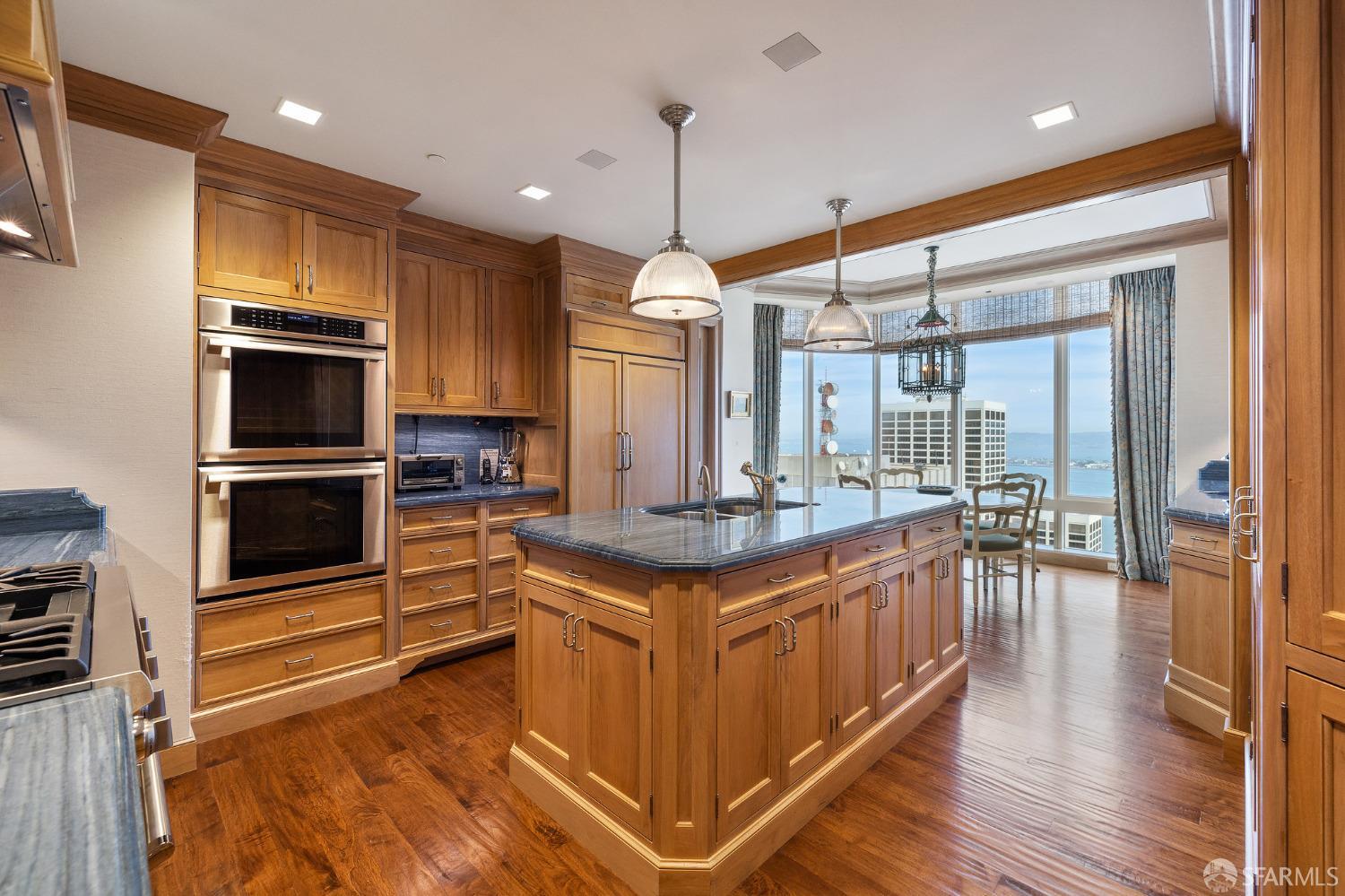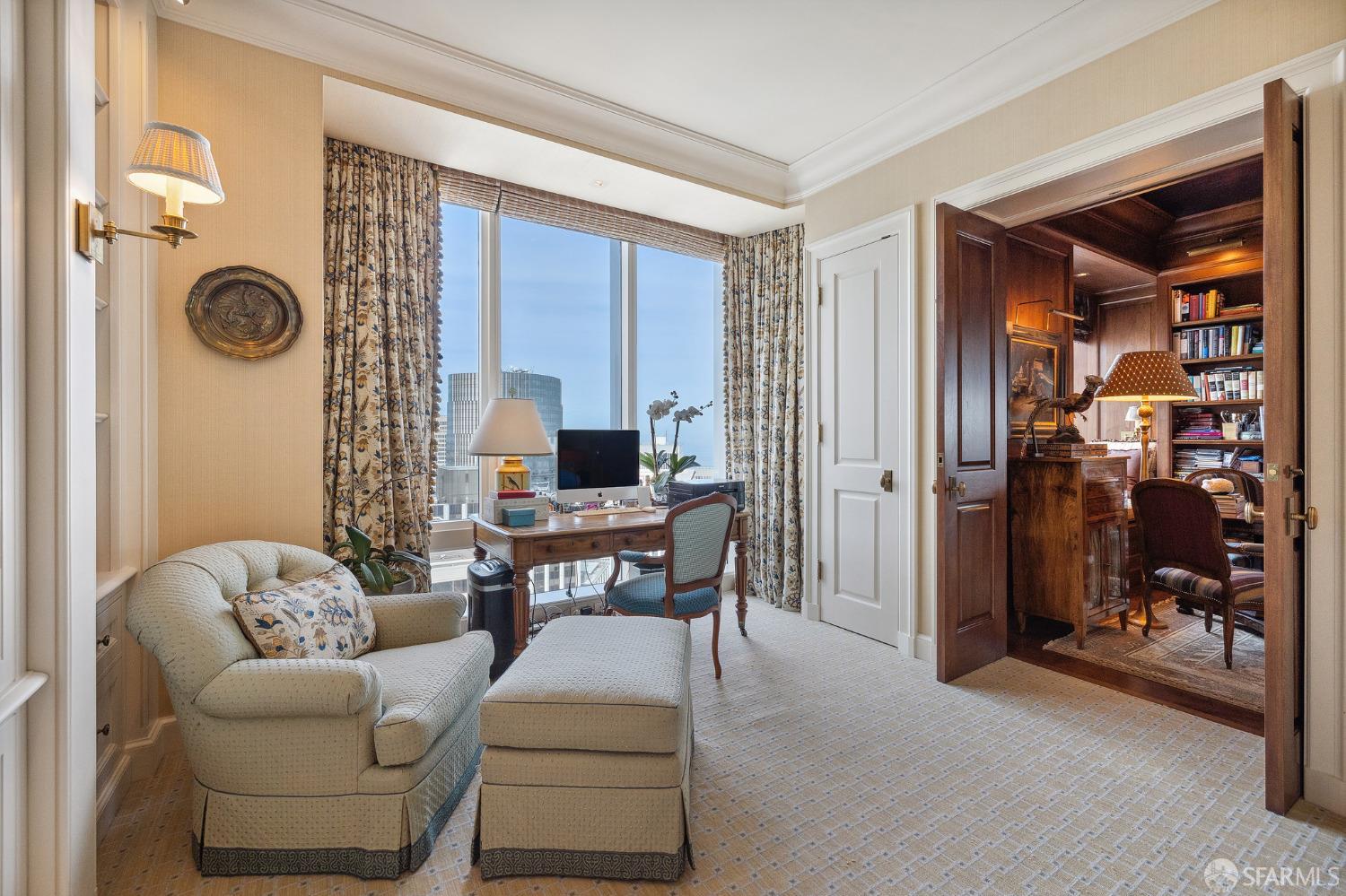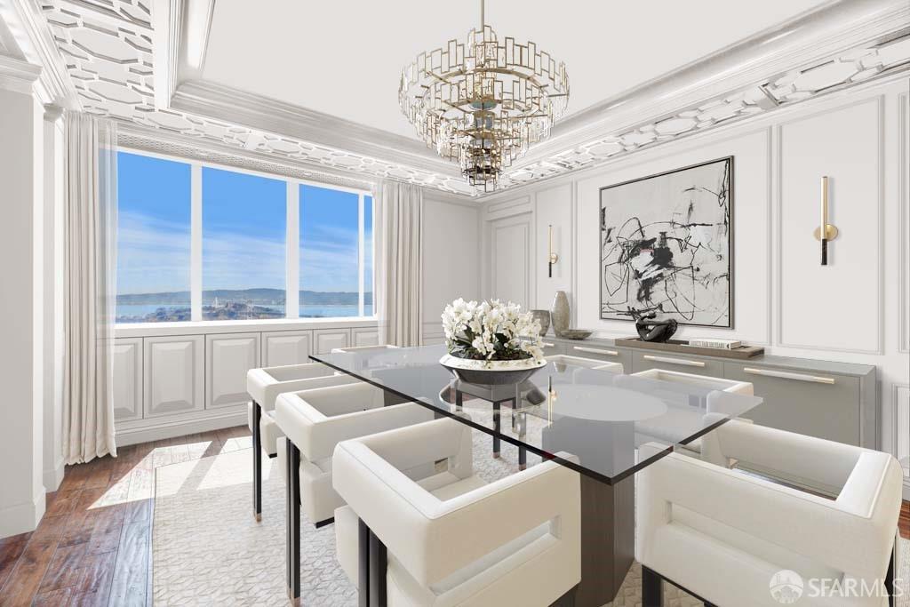 Glamorous high floor Grand Residence on coveted northeast corner, largest floor plan except penthouse. Enjoy stunning, sweeping City, Bridge and Bay views! Down to the studs 2 year renovation by globally renowned team of designers, architects, contractors. Hand laid floors, top-grade mill work, custom wall treatment, artful stonework. Two bedroom suites + rich walnut paneled library. Spacious foyer and living room with surround windows, elegant formal dining room enjoys exciting Bay Bridge lights close-up. Elegant primary bedroom suite with 2nd bath, steam shower, double walk-in closets. Guest bedroom suite with full bath. Spacious eat-in gourmet kitchen with bay and bridge views. Bejeweled powder room, large laundry room. Custom integrated, app-controlled A/V, motorized shades, lighting & HVAC. New acoustic insulation throughout. Updated systems. 2-car dedicated garage parking- self park OR valet. Reserved wine locker & extra storage. Separate Grand Residences lobby. Unmatched services with luxury amenities: club lounges, private dining room, screening room, concierge, catering kitchen, saline swimming pool, fitness center, children’s center, pilates, massage & yoga studios, outdoor patios. 24-7-365 attended lobby + security. Luxe living at its best, ideal and convenient location near the waterfront Embarcadero.
