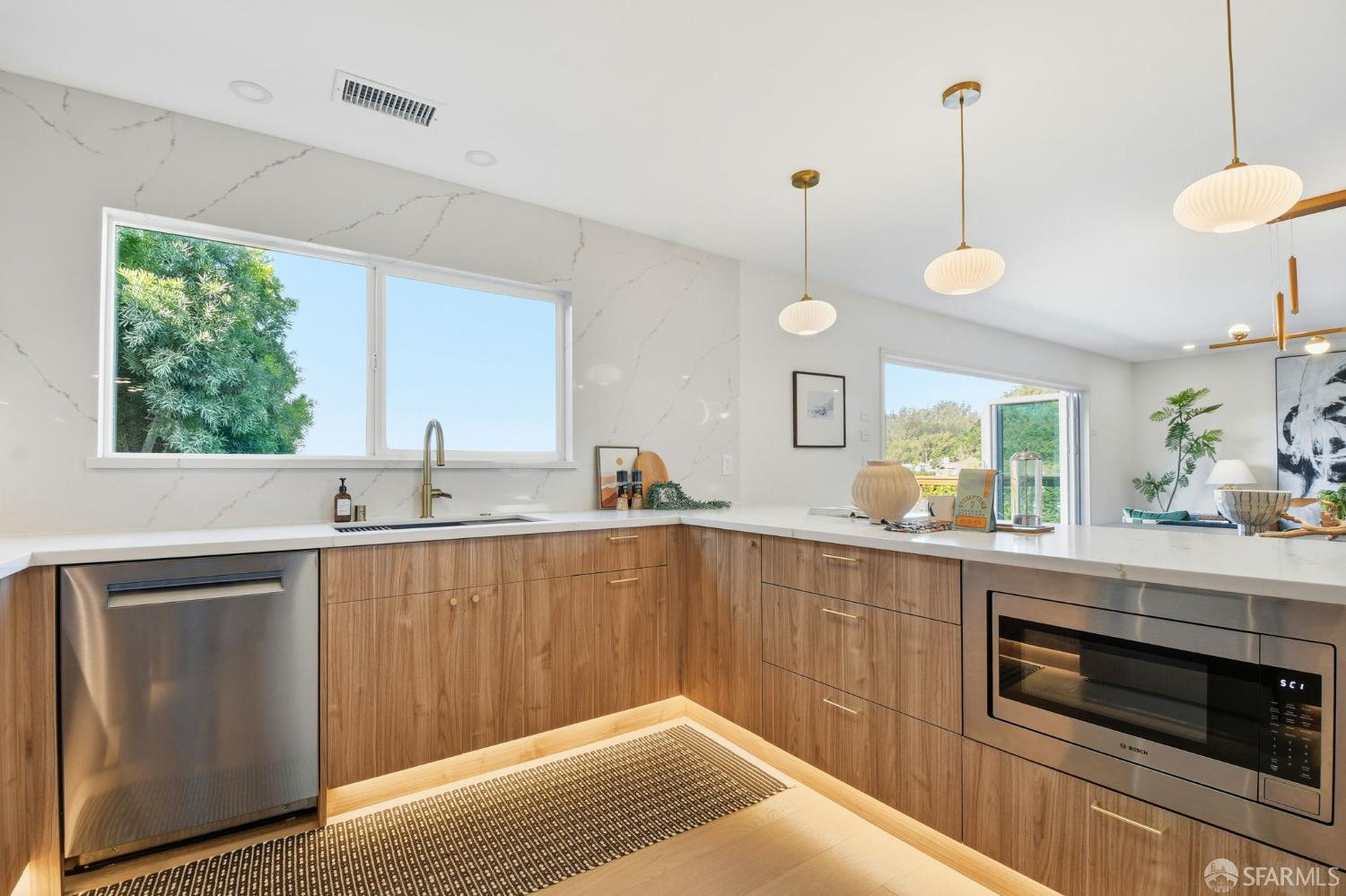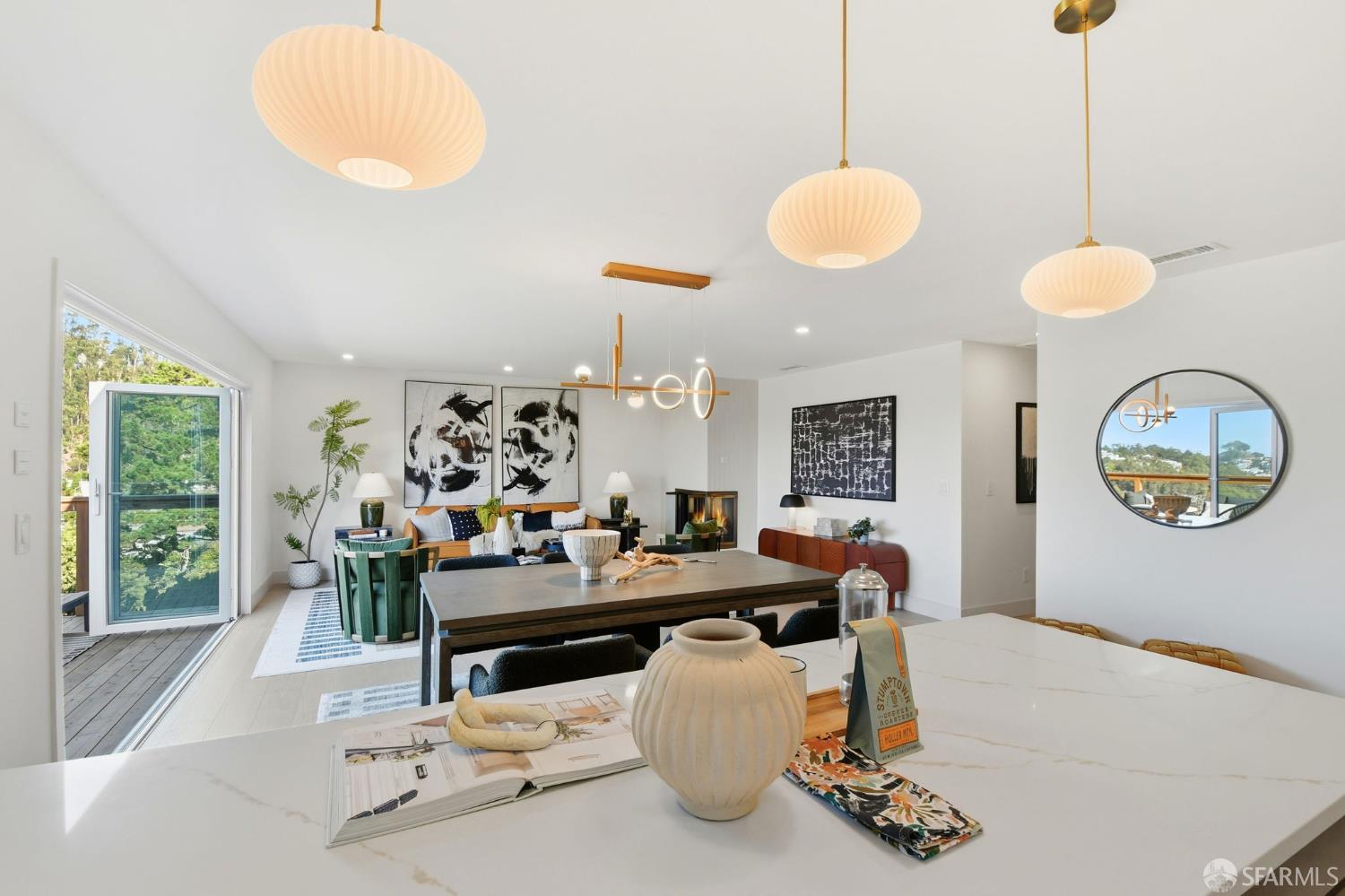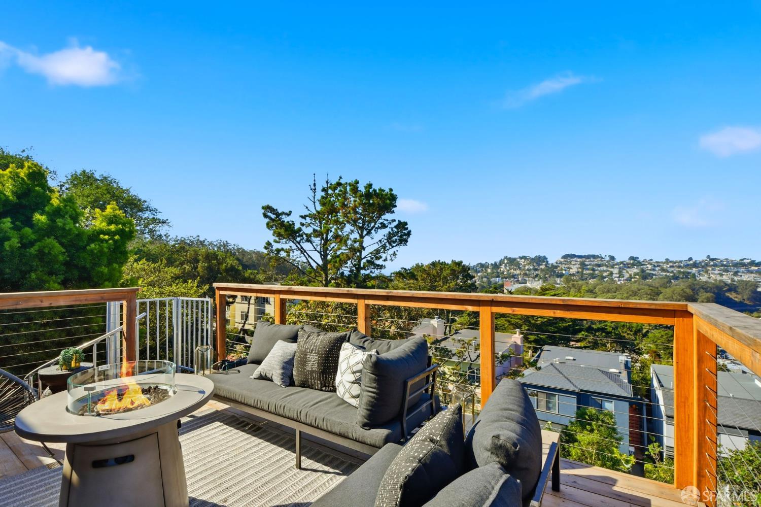 Fresh off a fully permitted, top-of-the-line renovation this fantastic, fully detached home has been brilliantly renovated to align with market demands. A great deal of craft went into designing the home’s structural plan to achieve a phenomenal open floor plan that creates an ideal communal space, anchored on one end by a cozy, tile-clad fireplace and framed by a dramatic 10-foot foldable glass wall that opens onto a walk-out deck with views of the Pacific Ocean. The stunning kitchen includes a beautiful stone waterfall island and full slab wall, custom cabinets with corner and waste bin drawers, designer lighting, and Bosch appliances. 3 full-sized bedrooms, including a large ensuite primary complement the main level of the home while downstairs hosts 2 additional bedrooms and a luxuriously-sized full bathroom. Wide plank white oak flooring runs throughout the home which has been completely rewired, and features a brand-new furnace and laundry area. Every detail has been carefully considered, from the designer tiles to the curated lighting. Set on one of the nicest blocks in Midtown Terrace this home has five bedrooms and two versatile flex rooms – perfect for in-laws, au pairs, an office, gym, hobby space, or playroom.