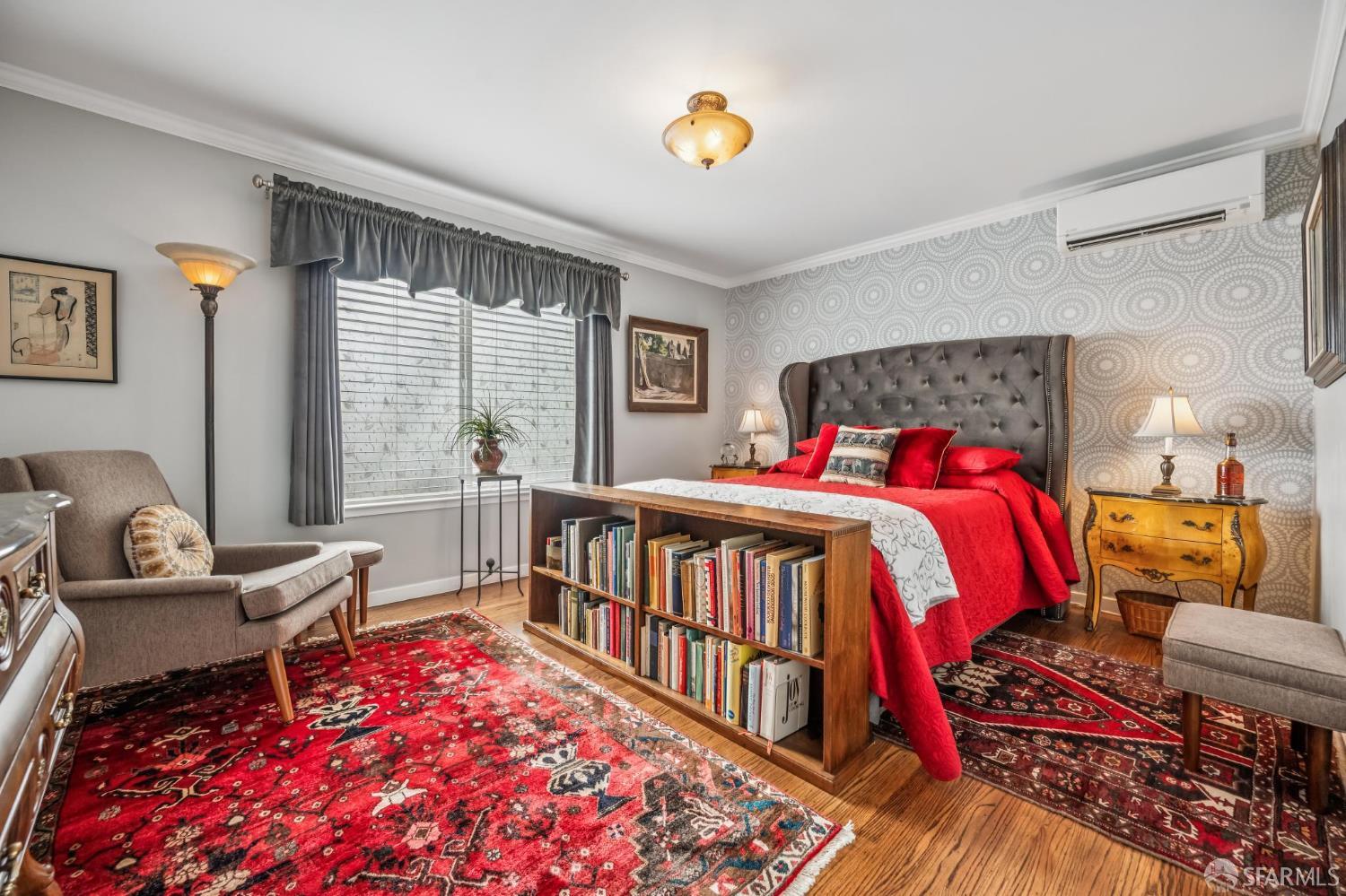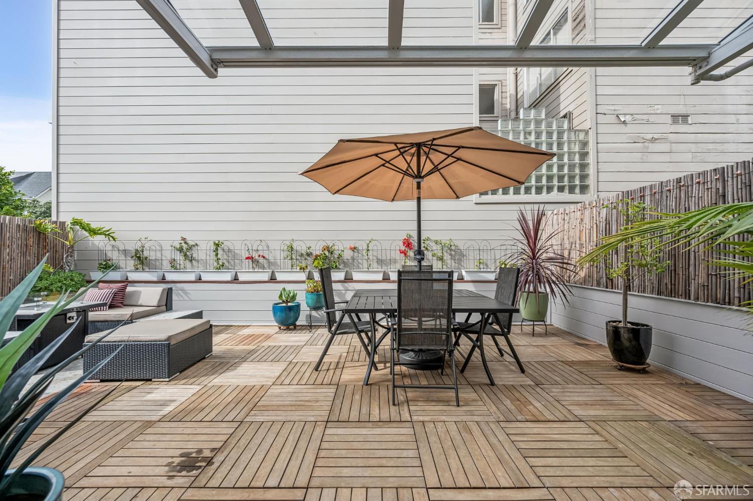 At the nexus of three of San Francisco’s most beloved neighborhoods: Noe Valley, Castro and Dolores Heights, and walking/biking distance to the center of each – or take Muni line 24 (which runs one block away, 24/7), or drive to & from your dedicated side-by-side garage space. Unit #1 is the only apartment in this mid-century building that includes a PRIVATE outdoor space, which consists of almost 500 square feet of perfectly level hardwood & porcelain tiles. Being immediately adjacent to the living area, the patio adds 70% more usable space for barbecuing, entertaining, dining al fresco, or warming up around the fire pit. Note that 220v wiring has been installed outside for your electric heaters, barbecue, etc. The interior layout has been enhanced by an added doorway between the kitchen & living room, allowing 360 circulation. Every room has original hardwood or beautiful new tile flooring. The bedroom, which is adjacent to a quiet block of Noe Street between 21st & Hill Streets, has Venetian blinds & room-darkening draperies. A mini-split (heat-pump”) HVAC system with two air handlers, installed in 2023, maintain the unit at exactly the temperature you like – virtually silently. Similarly, on-demand water heaters mean there’s no waiting to shower. In a bathroom alcove, you’ll also find the 2022-model LG washer & dryer. The remodeled kitchen offers ample counter space, drawers and cabinets, and a full suite of nearly new Bertazzoni appliances (including gas range & oven). Luxurious and fully dimmable lighting emanates from the ceiling, two double sconces, and from under the cabinets. A well-considered and carefully updated home designed for optimal indoor-outdoor California living. Professionally managed 6-unit HOA with low monthly dues.