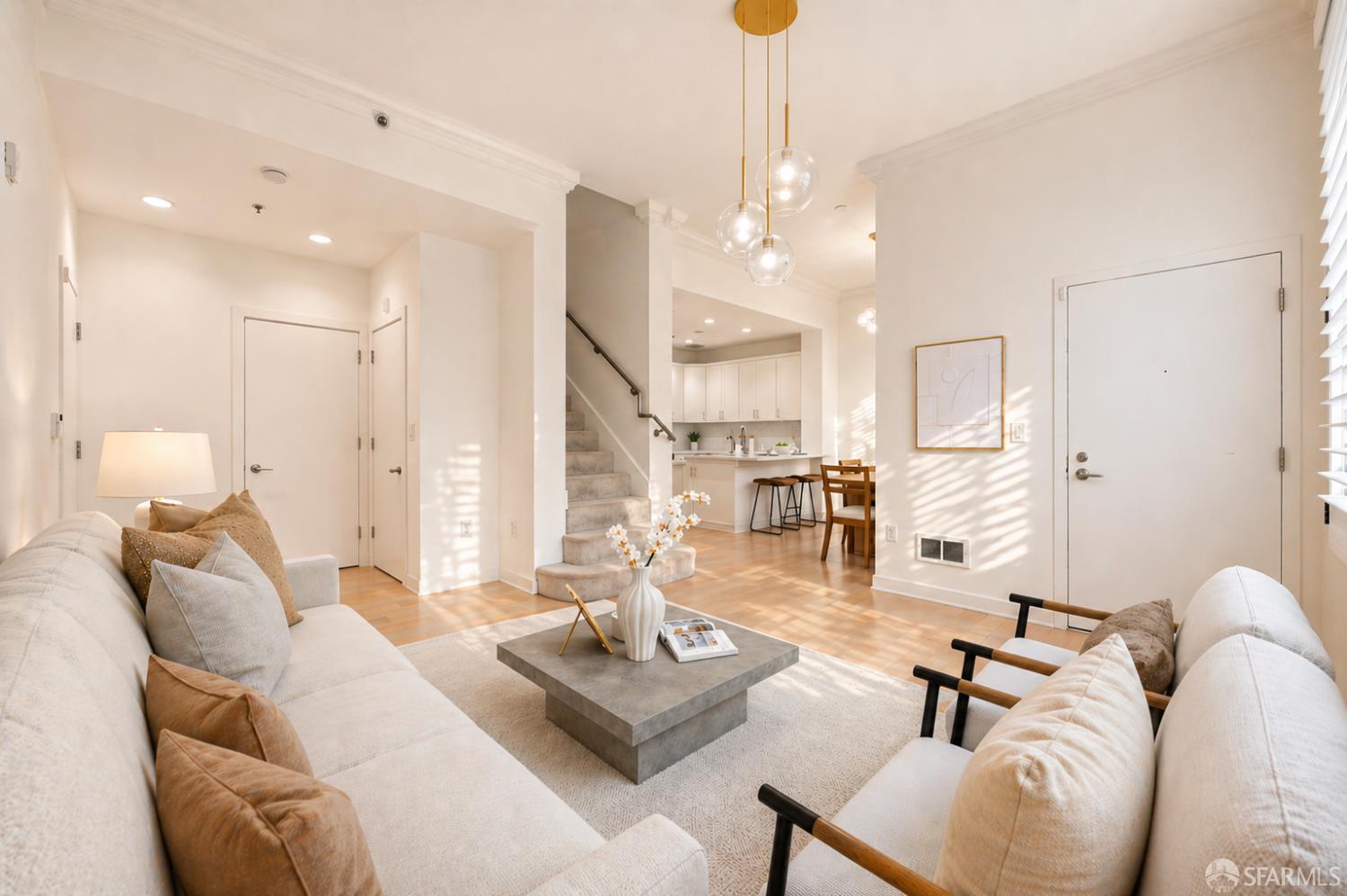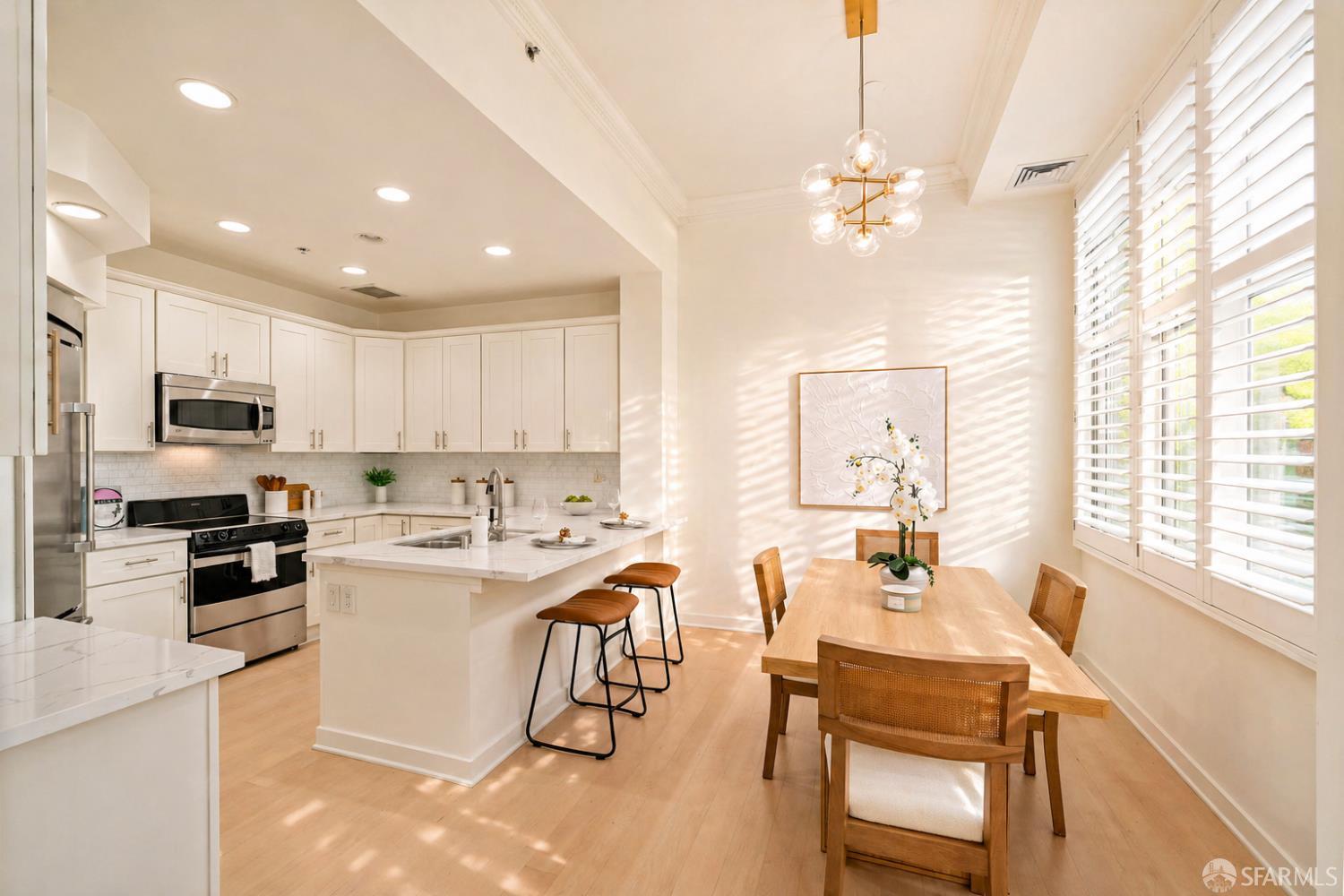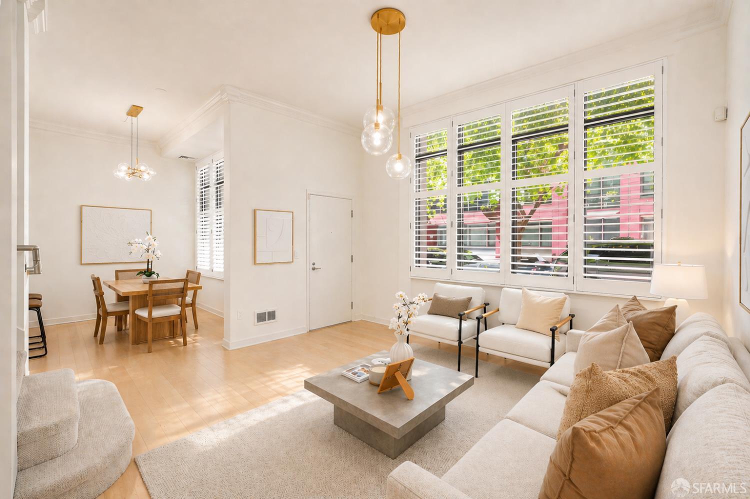 Rarely available, this sophisticated two story townhouse residence at 255 Berry Street offers the privacy and comfort of a single family home with the ease of full service city living, ideally set along the peaceful Mission Creek. Featuring its own gated street level entrance, the home delivers effortless daily living with a true sense of privacy and independence. Inside, soaring ceilings create a dramatic sense of volume and natural light, elevating the open living and dining spaces designed for both relaxed living and refined entertaining. The beautifully renovated kitchen showcases sleek quartz countertops, premium Thermador appliances, and modern cabinetry, reflecting approximately $70K in thoughtfully executed upgrades, including a comprehensive remodel completed in 2020. Upstairs, two spacious ensuite bedrooms are thoughtfully arranged for privacy, each offering tranquil, tree lined outlooks that create a calm retreat from the city. Refined details such as plantation shutters and custom finishes add warmth and sophistication throughout, while in unit Bosch laundry and additional storage enhance everyday comfort. A secure, private garage vestibule leads directly to your dedicated EV parking space, just steps from the home for added convenience. Residents enjoy the benefits of a secure, concierge building just moments from Mission Creek, Oracle Park, Chase Center, and neighborhood favorites including Philz Coffee. With easy access to Caltrain, Muni, and I 280, this residence offers a rare blend of privacy, design, and connectivity in one of San Francisco’s most dynamic waterfront neighborhoods