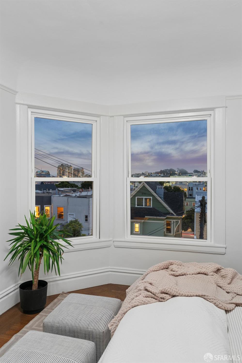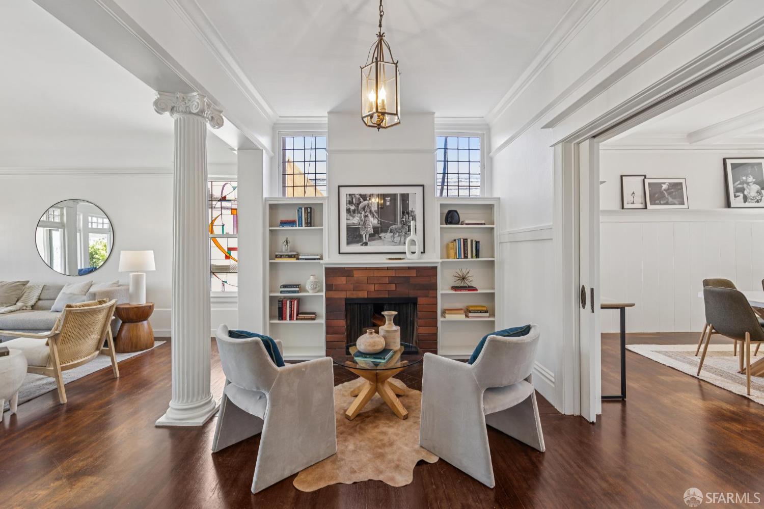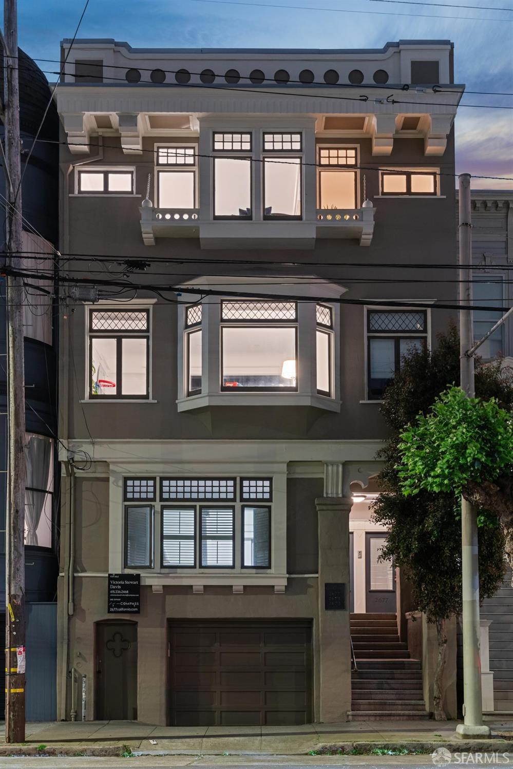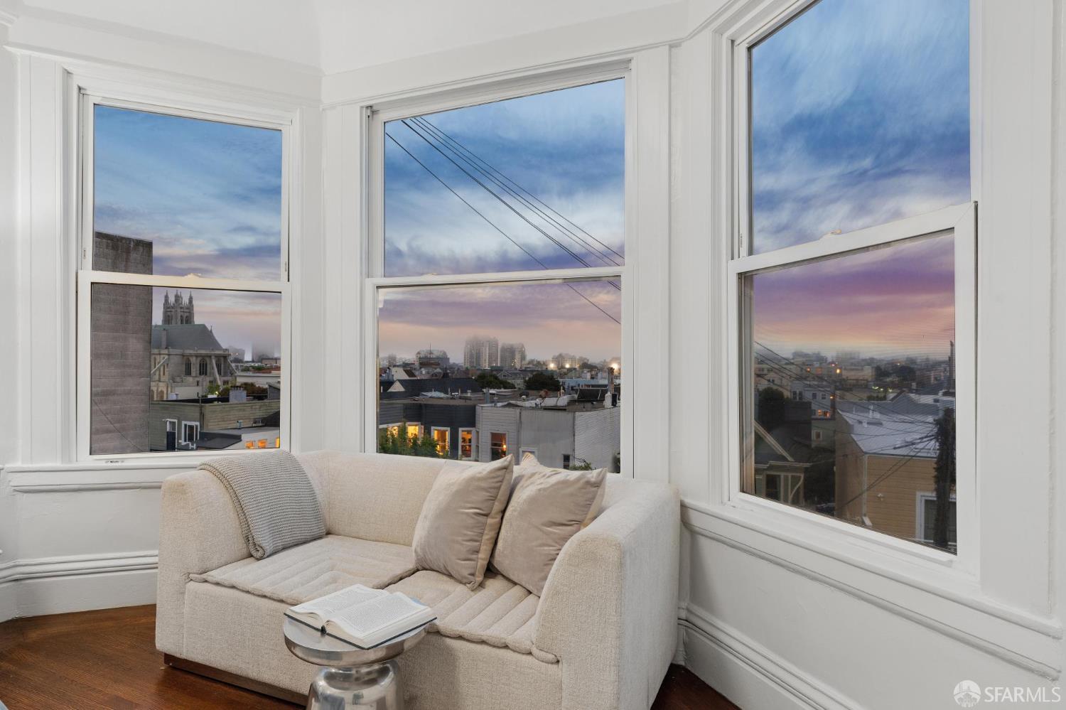 First time on the market since 1982! Unique opportunity to put your own stamp on this classic San Francisco home. Experience the quintessential San Francisco lifestyle in this grand top-floor residence situated in an elegant three-unit Edwardian building. Built in 1900, this full-floor condominium preserves the sophisticated scale and architectural integrity of the era while offering the expansive proportions of a modern home, accented by custom stained glass windows paying homage to the modern era of technology. Spanning 2,210 square feet, per tax records, the interior is defined by soaring ceilings and a versatile layout that includes three spacious Bedrooms, an Office with elegant skylight and closet, two Bathrooms (one split bath), Living Room with Bay window and built-in seating, formal Dining Room with period fireplace, wainscoting and built-ins, and Parlor perfect for gathering. Bathed in natural light, with hardwood flooring and beautiful period detail, the expansive formal living spaces are anchored by a classic fireplace in the parlor and framed by the beautiful craftsmanship expected of a turn-of-the-20th-century gem. A well-appointed Kitchen with eat-in area features a gas range, double oven, and dishwasher, all seamlessly blending period charm with functionality. Side-by-side washer and dryer are located in a generous laundry area that includes a pantry with additional in-unit storage. Two of the bedrooms feature gorgeous natural light and south-facing expansive City views that include Sutro Tower. This premier residence includes the convenience of a garage with two dedicated parking spots, additional large storage area, and a lovely shared garden, all accessible from the home through an interior back staircase. With a near-perfect Walk Score of 99/100, the property is conveniently positioned just steps from Alta Plaza Park and the world-class dining and boutiques of the Fillmore and Divisadero corridors, for the full Pacific Heights neighborhood experience.