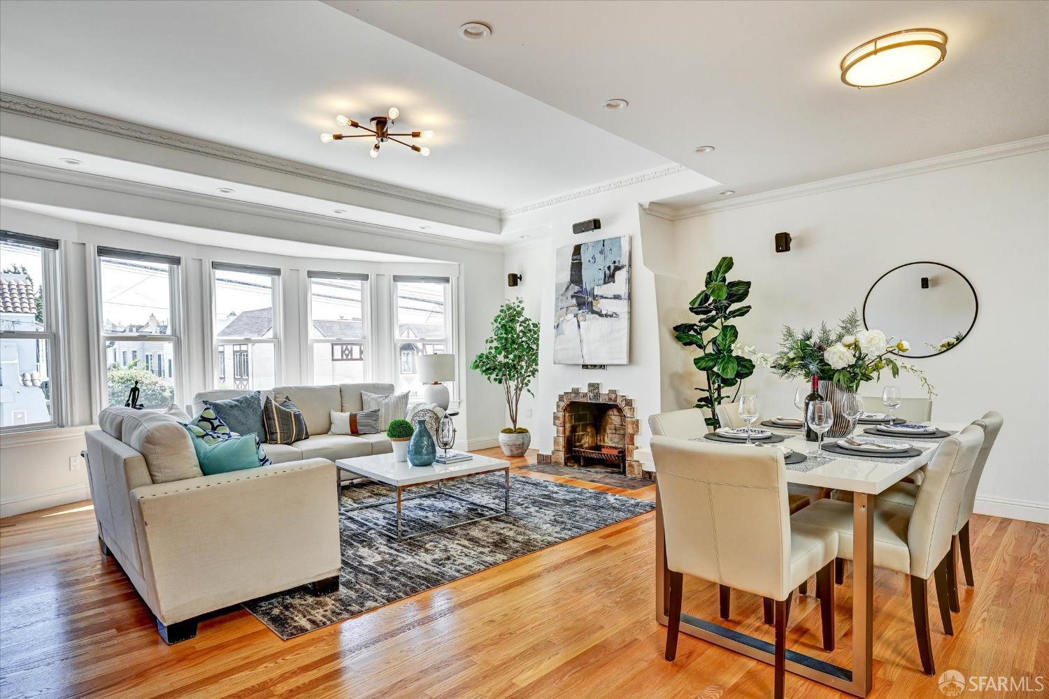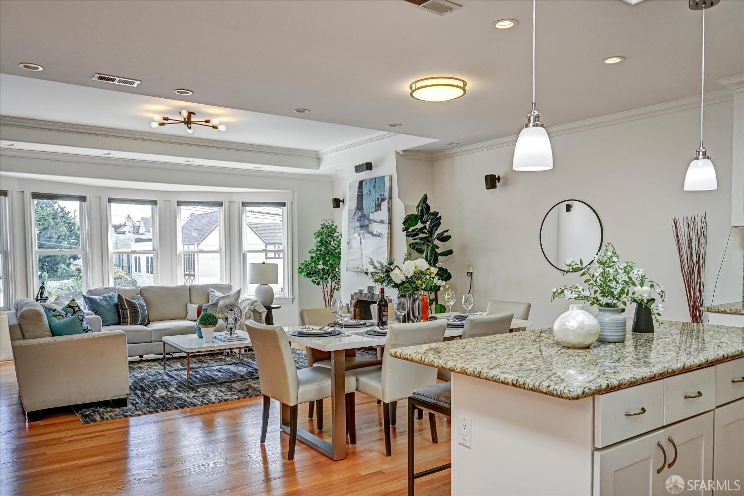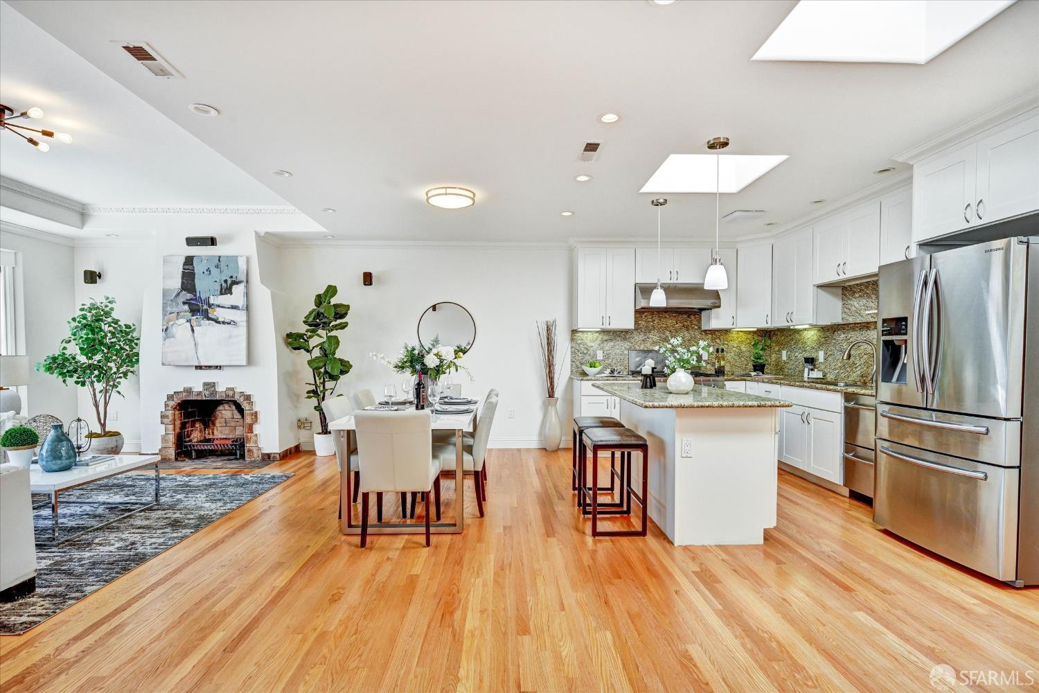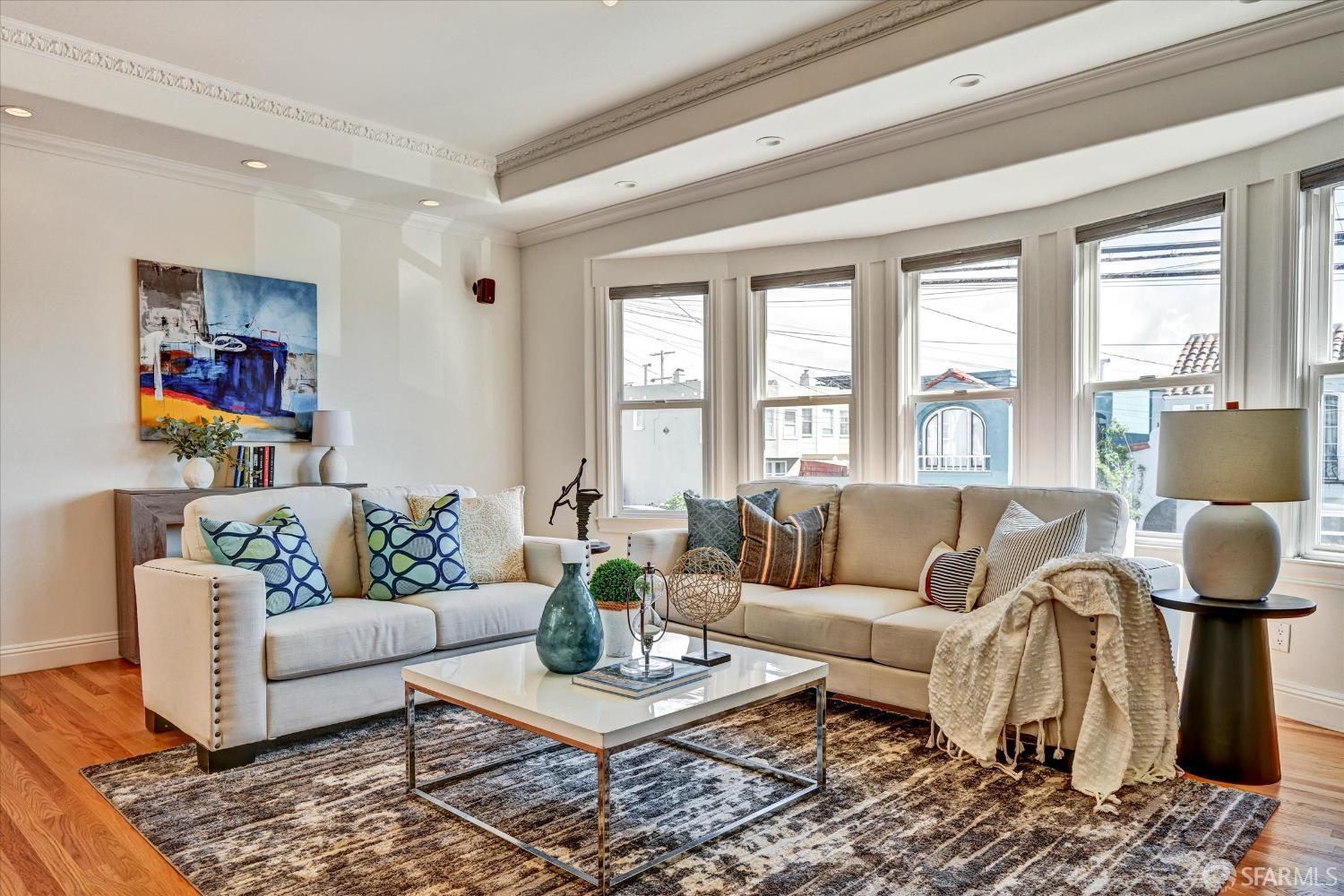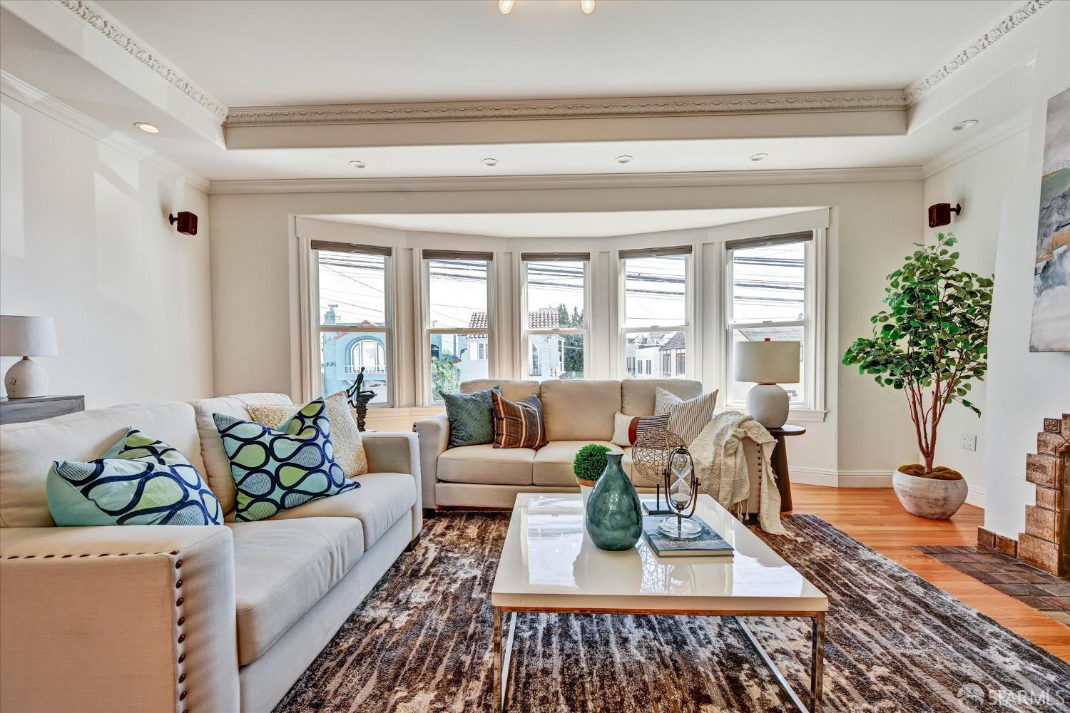Beautifully updated Central Sunset Marina-style home showcasing partial ocean and Golden Gate Bridge views. Fully gutted and rebuilt in 2007, the residence features refined finishes and a thoughtfully designed layout that blends classic charm with modern comfort. The main level offers an open-concept floor plan with a spacious, south-facing barrel-front living room filled with natural light, seamlessly flowing into the dining area and contemporary kitchen – perfect for everyday living and entertaining. Beyond the main living space are two well-appointed bedrooms, including a comfortable primary suite, along with a dedicated office (staged as a third bedroom), a total of 2.5 baths, and laundry closet. An interior staircase leads to the lower level, which expands the living space with a legal family room, two additional bedrooms, and two full baths, including a second primary suite. This level also features a convenient wet bar, a second laundry closet, and interior access to a generous one-car garage with ample storage. A separate side entrance from the street provides flexibility for guest accommodations, extended family living, or potential Airbnb use. Completing the home is a flat, landscaped backyard ideal for outdoor enjoyment, making this property a rare and versatile find in a prime Sunset location.