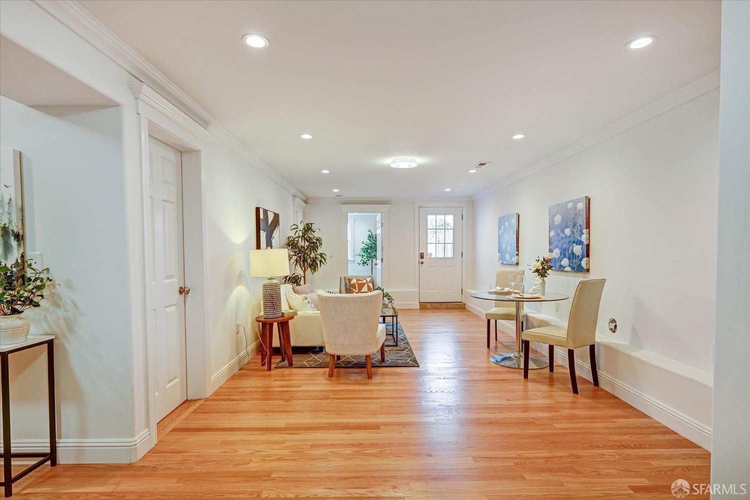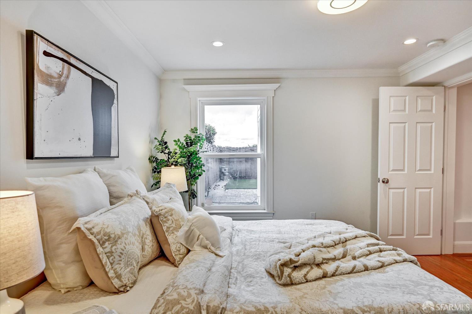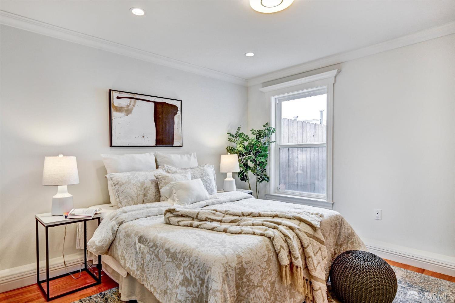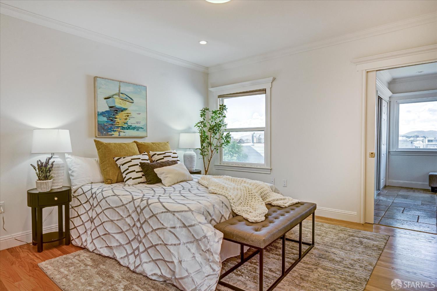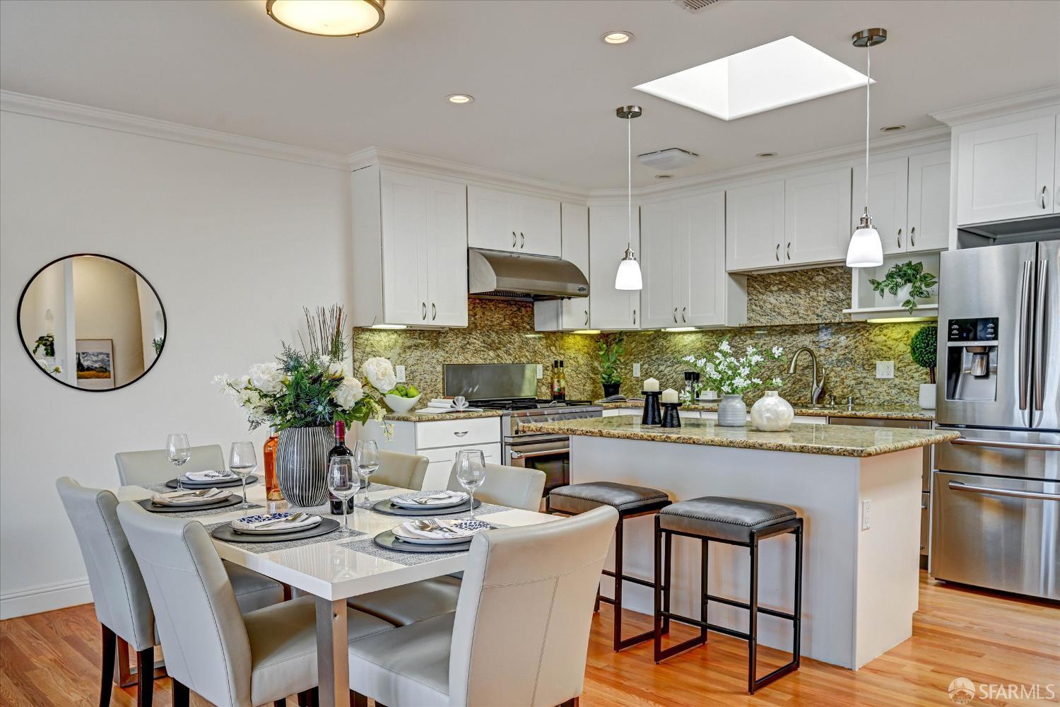 Beautifully updated Central Sunset Marina-style home showcasing partial ocean and Golden Gate Bridge views. Fully gutted and rebuilt in 2007, the residence features refined finishes and a thoughtfully designed layout that blends classic charm with modern comfort. The main level offers an open-concept floor plan with a spacious, south-facing barrel-front living room filled with natural light, seamlessly flowing into the dining area and contemporary kitchen – perfect for everyday living and entertaining. Beyond the main living space are two well-appointed bedrooms, including a comfortable primary suite, along with a dedicated office (staged as a third bedroom), a total of 2.5 baths, and laundry closet. An interior staircase leads to the lower level, which expands the living space with a legal family room, two additional bedrooms, and two full baths, including a second primary suite. This level also features a convenient wet bar, a second laundry closet, and interior access to a generous one-car garage with ample storage. A separate side entrance from the street provides flexibility for guest accommodations, extended family living, or potential Airbnb use. Completing the home is a flat, landscaped backyard ideal for outdoor enjoyment, making this property a rare and versatile find in a prime Sunset location.