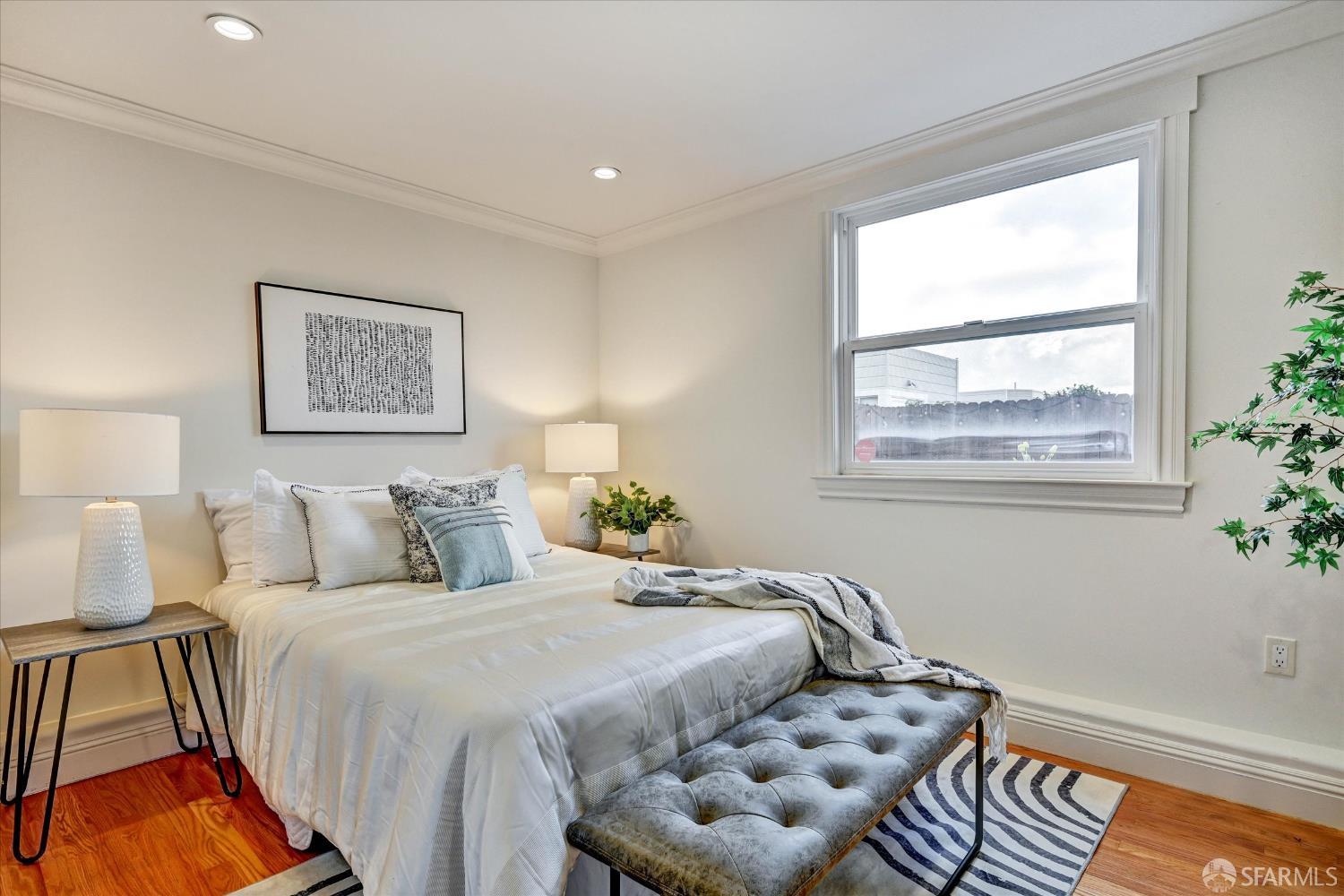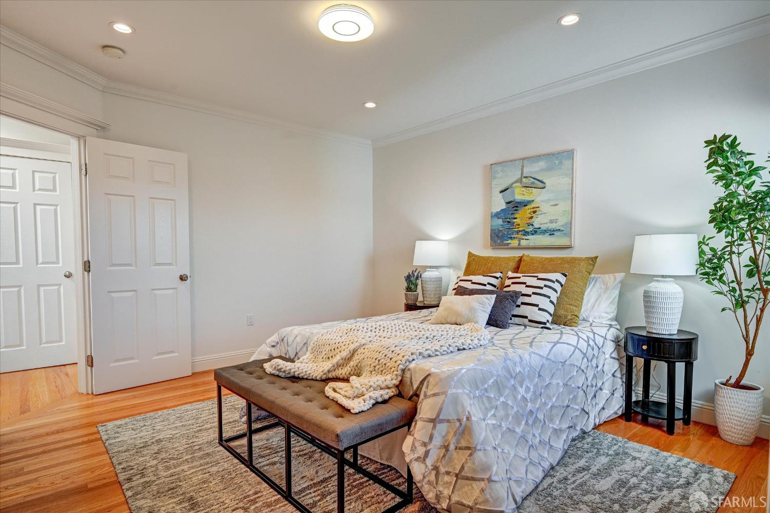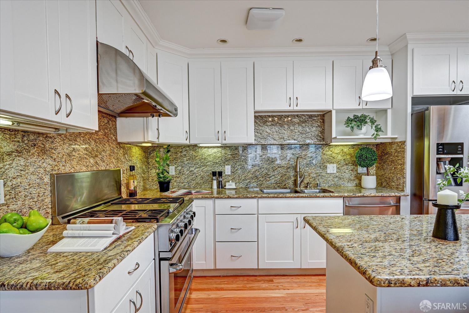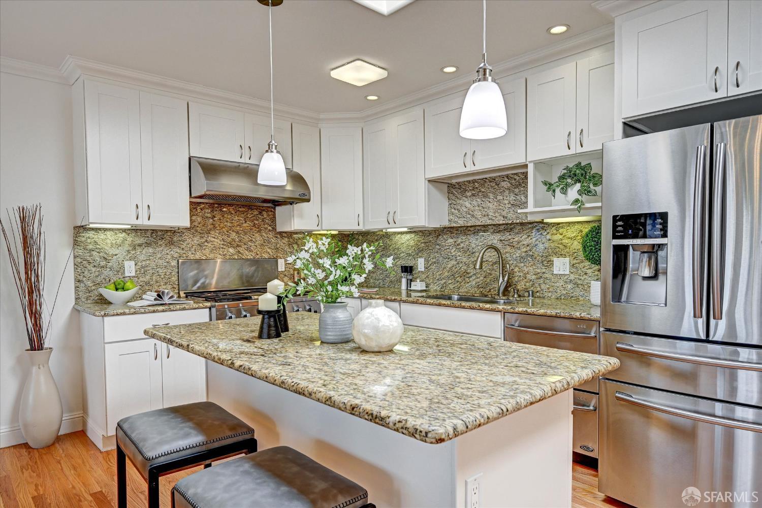 Beautifully updated Central Sunset Marina-style home showcasing partial ocean and Golden Gate Bridge views. Fully gutted and rebuilt in 2007, the residence features refined finishes and a thoughtfully designed layout that blends classic charm with modern comfort. The main level offers an open-concept floor plan with a spacious, south-facing barrel-front living room filled with natural light, seamlessly flowing into the dining area and contemporary kitchen – perfect for everyday living and entertaining. Beyond the main living space are two well-appointed bedrooms, including a comfortable primary suite, along with a dedicated office (staged as a third bedroom), a total of 2.5 baths, and laundry closet. An interior staircase leads to the lower level, which expands the living space with a legal family room, two additional bedrooms, and two full baths, including a second primary suite. This level also features a convenient wet bar, a second laundry closet, and interior access to a generous one-car garage with ample storage. A separate side entrance from the street provides flexibility for guest accommodations, extended family living, or potential Airbnb use. Completing the home is a flat, landscaped backyard ideal for outdoor enjoyment, making this property a rare and versatile find in a prime Sunset location.