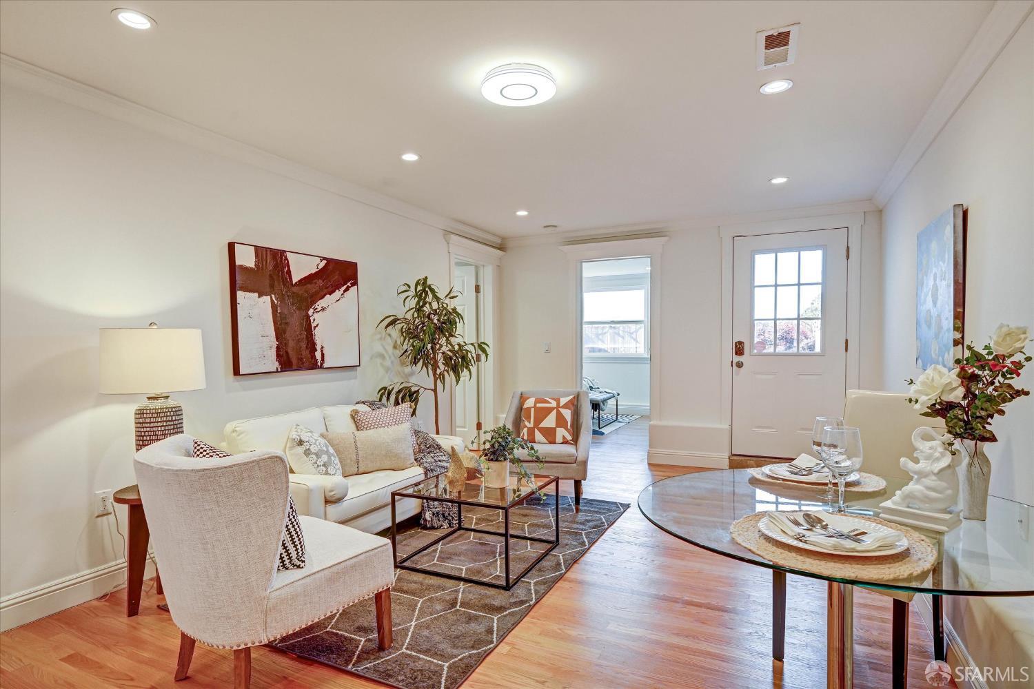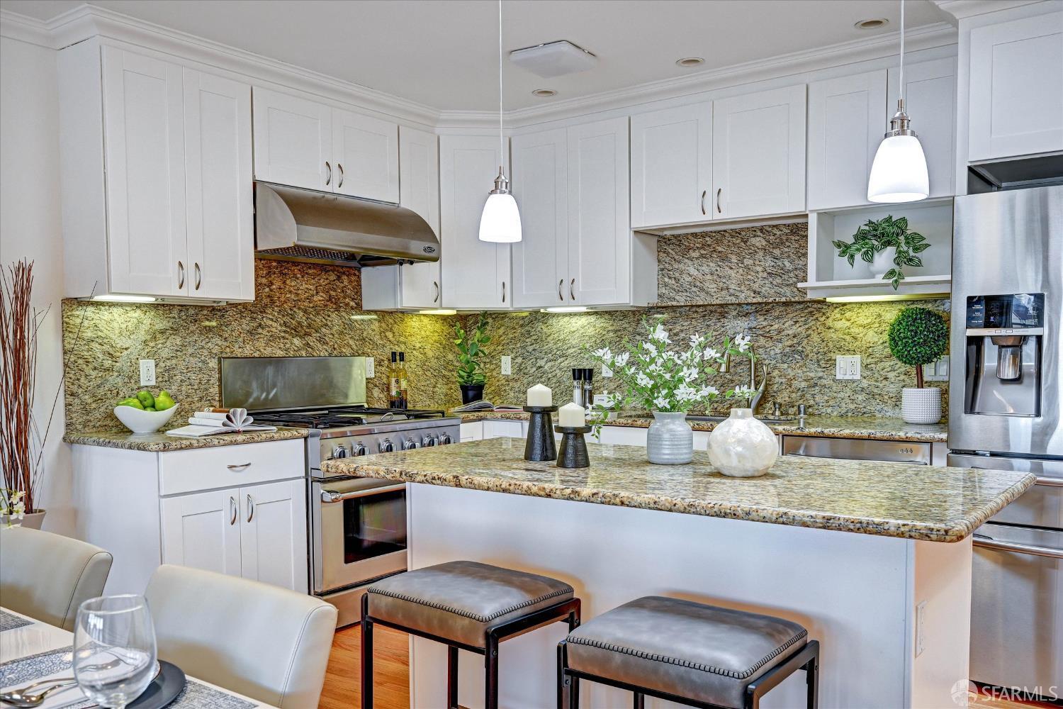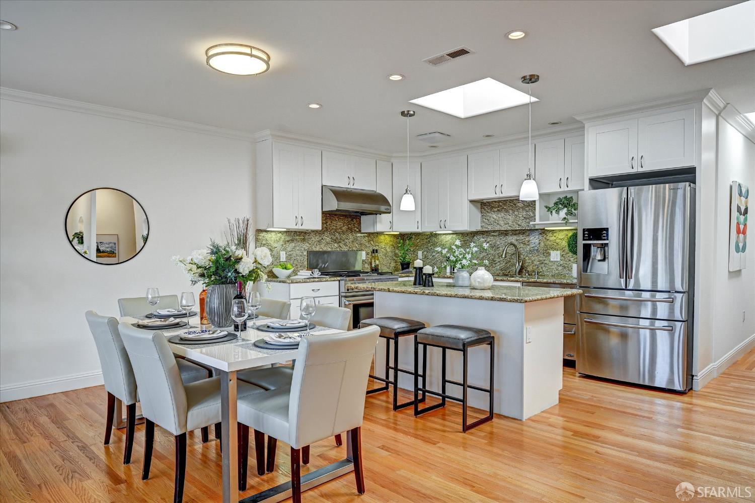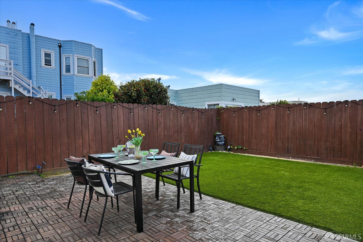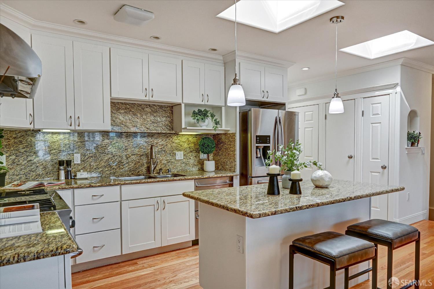 Beautifully updated Central Sunset Marina-style home showcasing partial ocean and Golden Gate Bridge views. Fully gutted and rebuilt in 2007, the residence features refined finishes and a thoughtfully designed layout that blends classic charm with modern comfort. The main level offers an open-concept floor plan with a spacious, south-facing barrel-front living room filled with natural light, seamlessly flowing into the dining area and contemporary kitchen – perfect for everyday living and entertaining. Beyond the main living space are two well-appointed bedrooms, including a comfortable primary suite, along with a dedicated office (staged as a third bedroom), a total of 2.5 baths, and laundry closet. An interior staircase leads to the lower level, which expands the living space with a legal family room, two additional bedrooms, and two full baths, including a second primary suite. This level also features a convenient wet bar, a second laundry closet, and interior access to a generous one-car garage with ample storage. A separate side entrance from the street provides flexibility for guest accommodations, extended family living, or potential Airbnb use. Completing the home is a flat, landscaped backyard ideal for outdoor enjoyment, making this property a rare and versatile find in a prime Sunset location.
