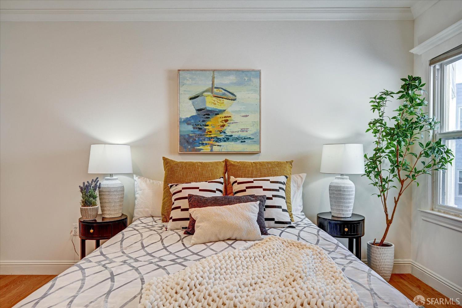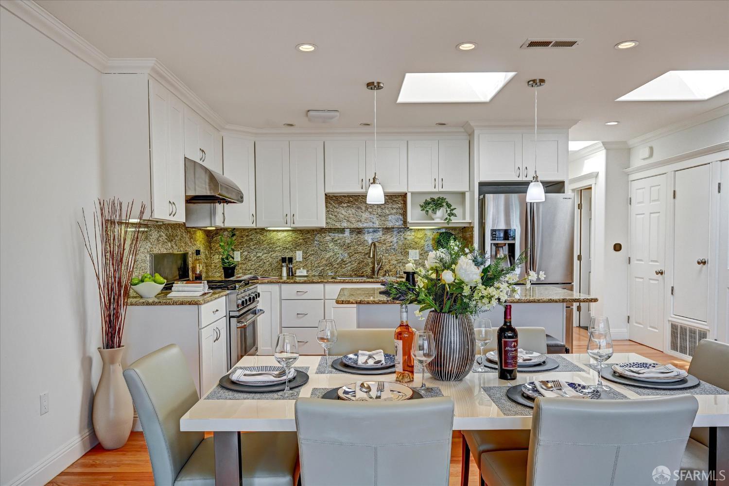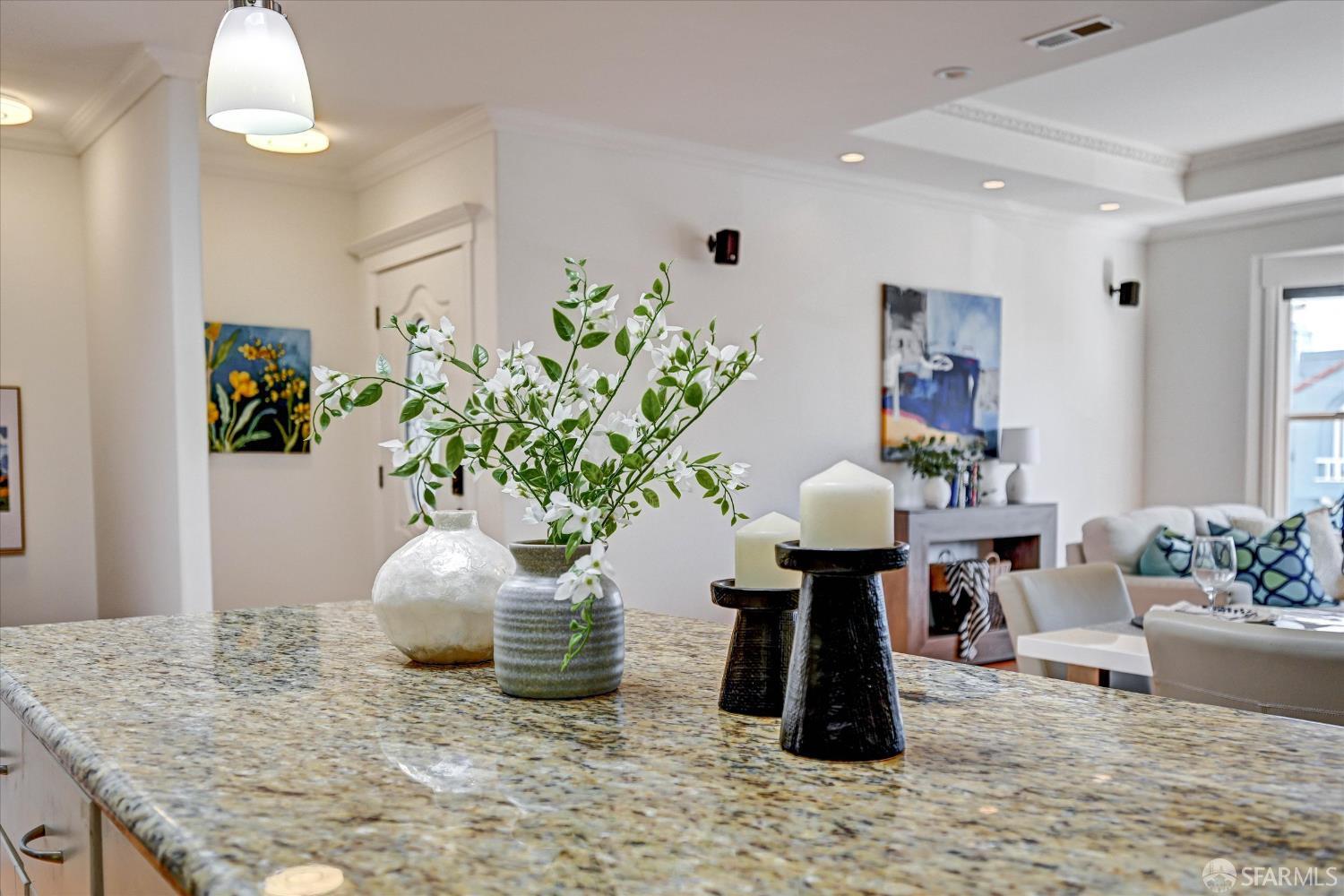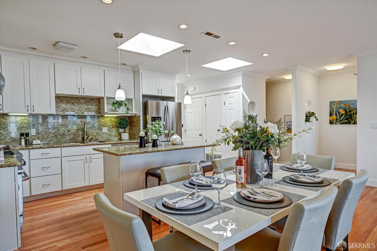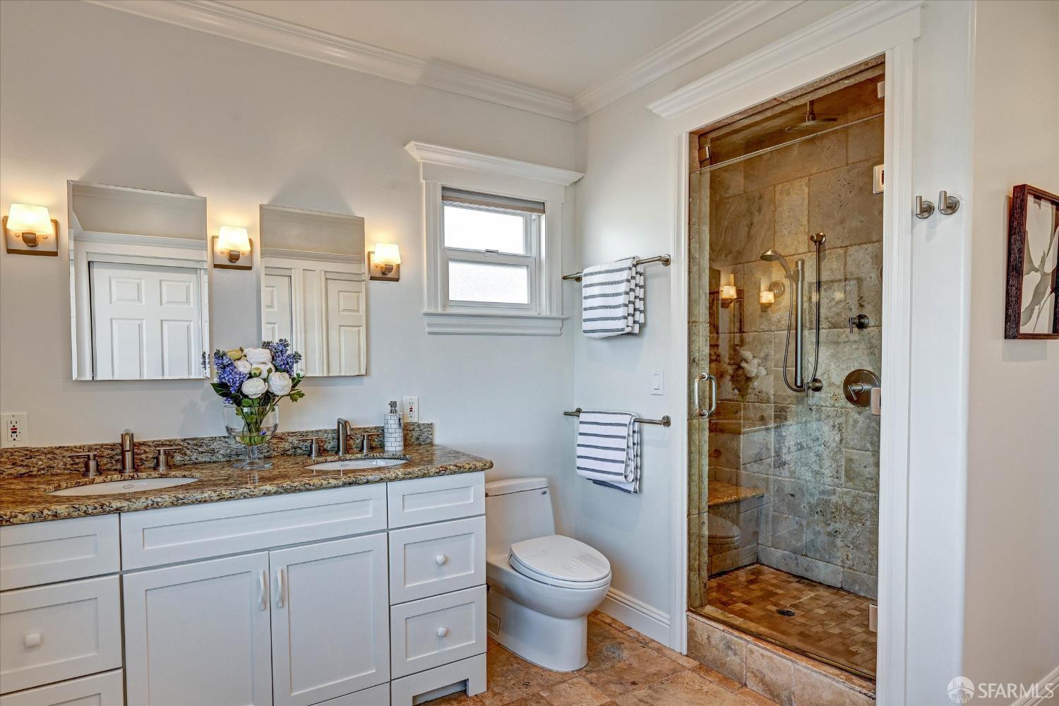 Beautifully updated Central Sunset Marina-style home showcasing partial ocean and Golden Gate Bridge views. Fully gutted and rebuilt in 2007, the residence features refined finishes and a thoughtfully designed layout that blends classic charm with modern comfort. The main level offers an open-concept floor plan with a spacious, south-facing barrel-front living room filled with natural light, seamlessly flowing into the dining area and contemporary kitchen – perfect for everyday living and entertaining. Beyond the main living space are two well-appointed bedrooms, including a comfortable primary suite, along with a dedicated office (staged as a third bedroom), a total of 2.5 baths, and laundry closet. An interior staircase leads to the lower level, which expands the living space with a legal family room, two additional bedrooms, and two full baths, including a second primary suite. This level also features a convenient wet bar, a second laundry closet, and interior access to a generous one-car garage with ample storage. A separate side entrance from the street provides flexibility for guest accommodations, extended family living, or potential Airbnb use. Completing the home is a flat, landscaped backyard ideal for outdoor enjoyment, making this property a rare and versatile find in a prime Sunset location.
