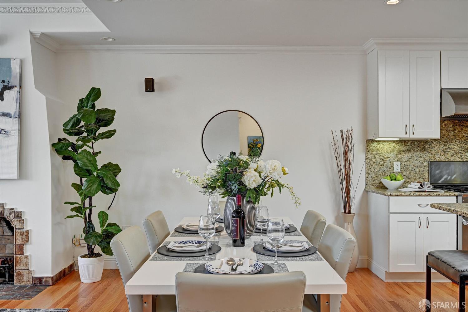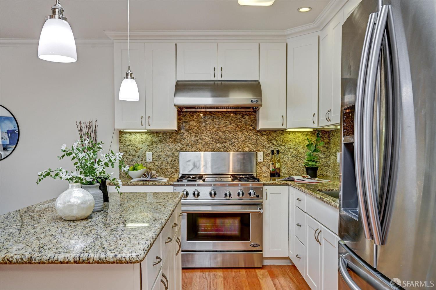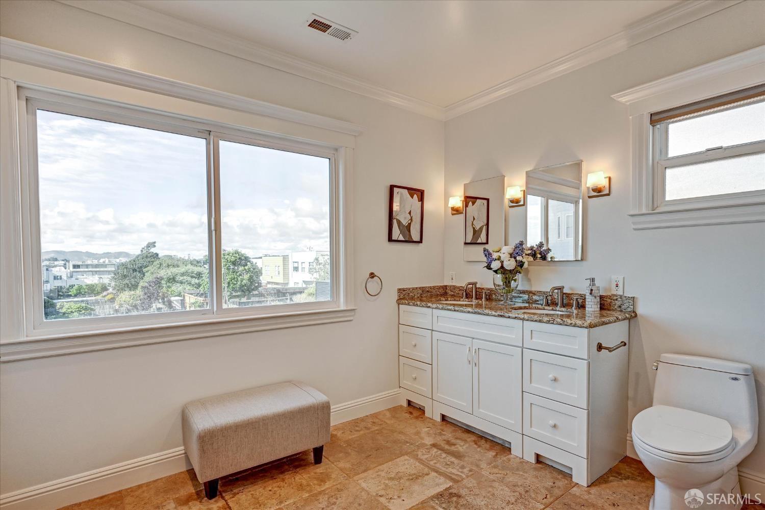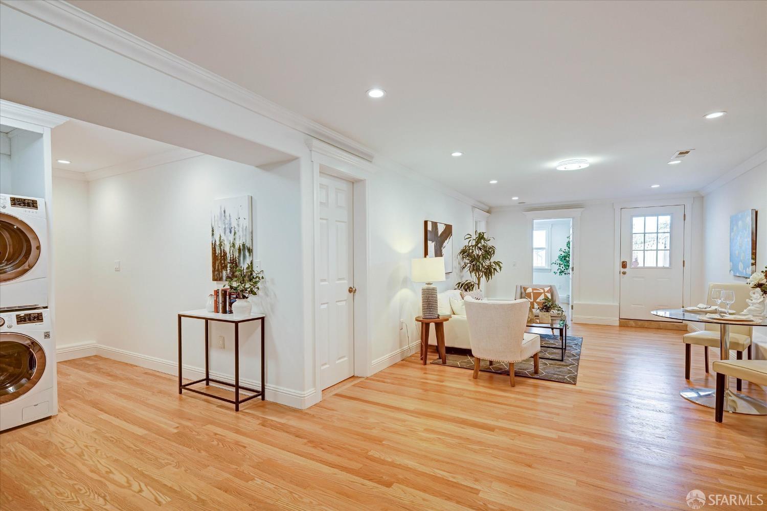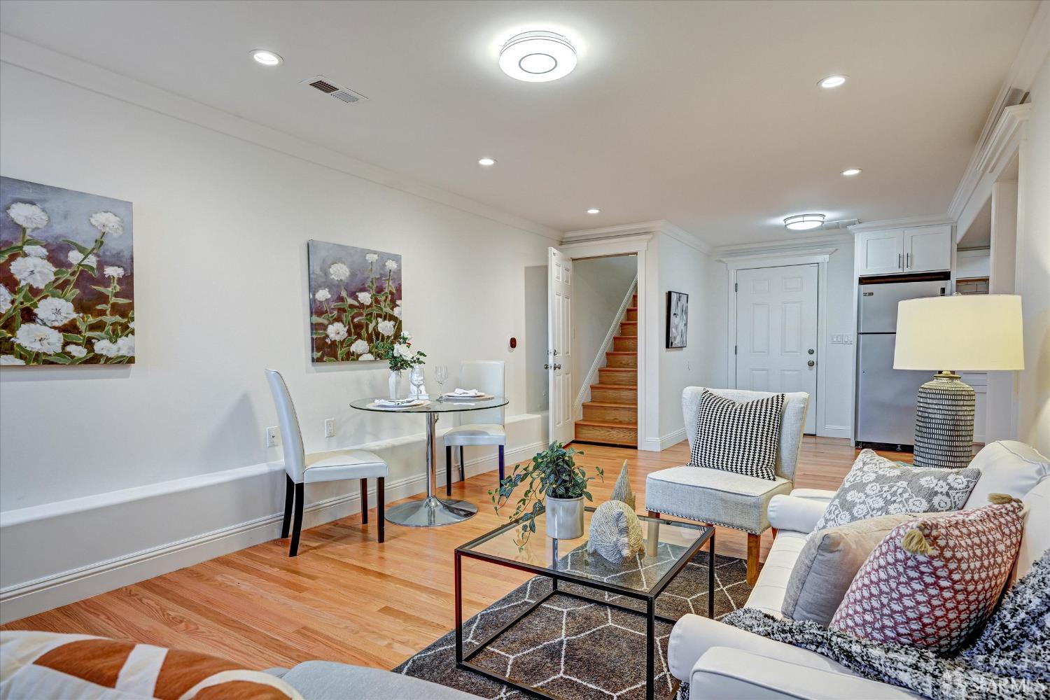 Beautifully updated Central Sunset Marina-style home showcasing partial ocean and Golden Gate Bridge views. Fully gutted and rebuilt in 2007, the residence features refined finishes and a thoughtfully designed layout that blends classic charm with modern comfort. The main level offers an open-concept floor plan with a spacious, south-facing barrel-front living room filled with natural light, seamlessly flowing into the dining area and contemporary kitchen – perfect for everyday living and entertaining. Beyond the main living space are two well-appointed bedrooms, including a comfortable primary suite, along with a dedicated office (staged as a third bedroom), a total of 2.5 baths, and laundry closet. An interior staircase leads to the lower level, which expands the living space with a legal family room, two additional bedrooms, and two full baths, including a second primary suite. This level also features a convenient wet bar, a second laundry closet, and interior access to a generous one-car garage with ample storage. A separate side entrance from the street provides flexibility for guest accommodations, extended family living, or potential Airbnb use. Completing the home is a flat, landscaped backyard ideal for outdoor enjoyment, making this property a rare and versatile find in a prime Sunset location.