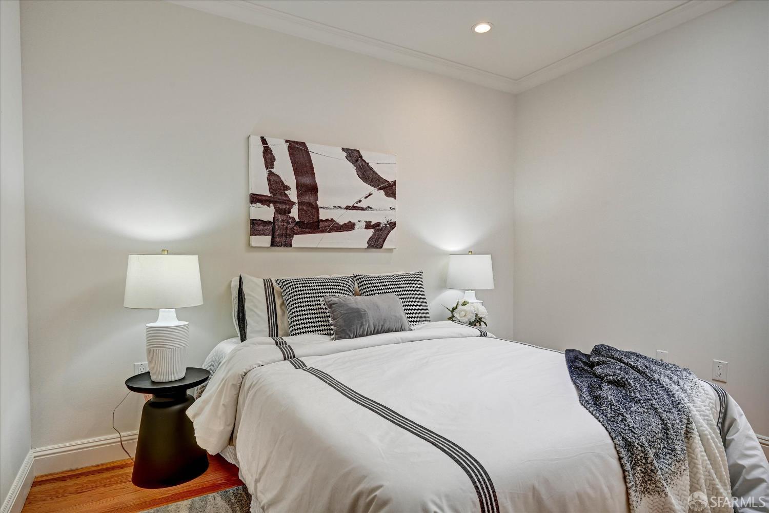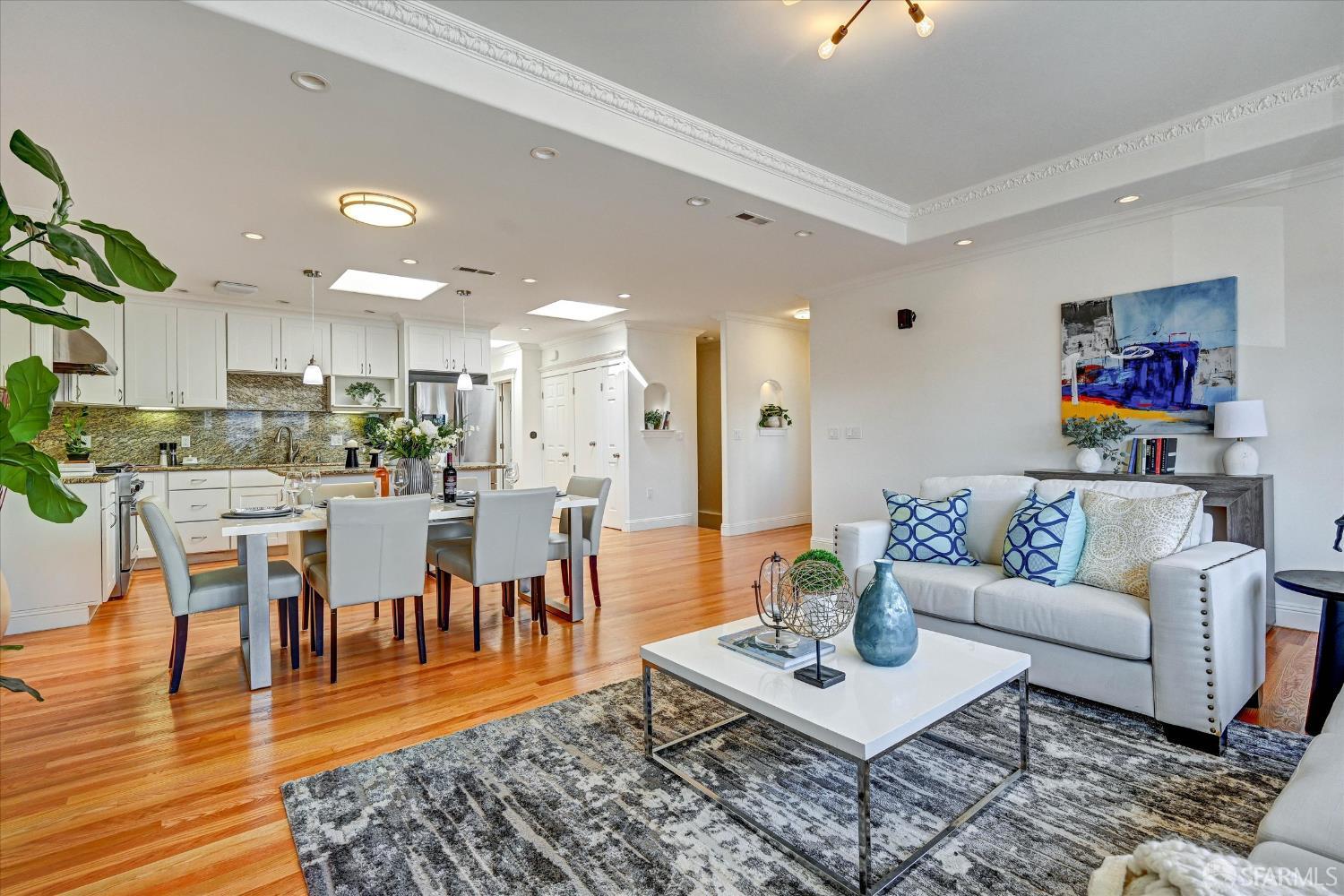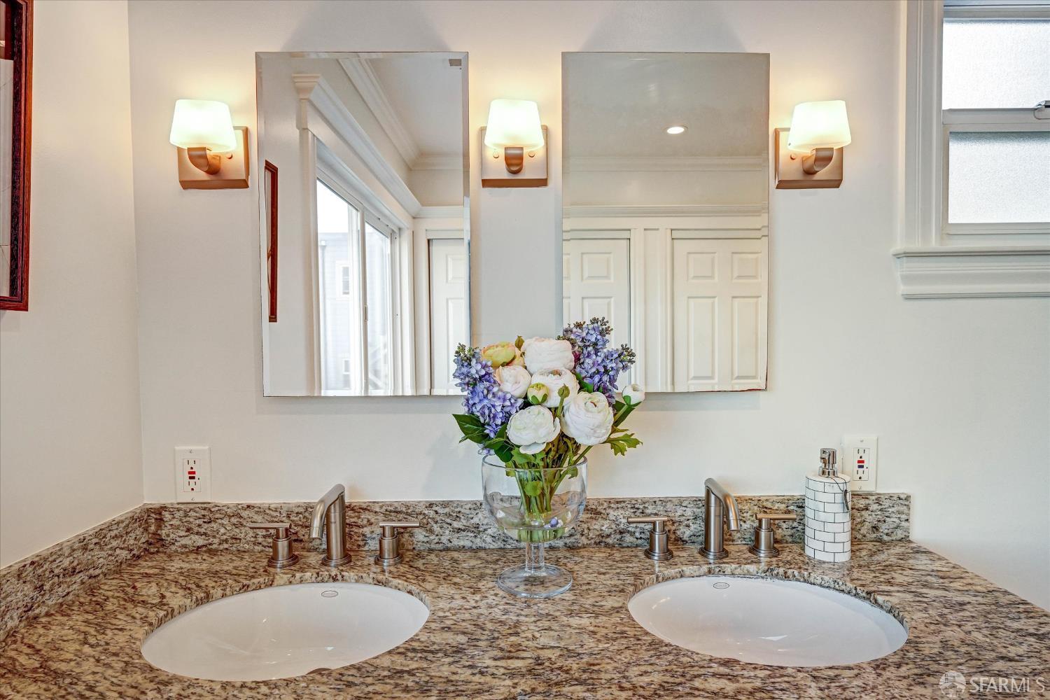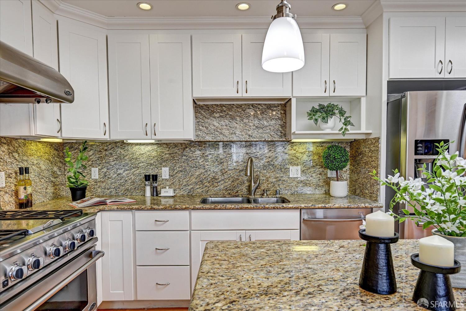 Beautifully updated Central Sunset Marina-style home showcasing partial ocean and Golden Gate Bridge views. Fully gutted and rebuilt in 2007, the residence features refined finishes and a thoughtfully designed layout that blends classic charm with modern comfort. The main level offers an open-concept floor plan with a spacious, south-facing barrel-front living room filled with natural light, seamlessly flowing into the dining area and contemporary kitchen – perfect for everyday living and entertaining. Beyond the main living space are two well-appointed bedrooms, including a comfortable primary suite, along with a dedicated office (staged as a third bedroom), a total of 2.5 baths, and laundry closet. An interior staircase leads to the lower level, which expands the living space with a legal family room, two additional bedrooms, and two full baths, including a second primary suite. This level also features a convenient wet bar, a second laundry closet, and interior access to a generous one-car garage with ample storage. A separate side entrance from the street provides flexibility for guest accommodations, extended family living, or potential Airbnb use. Completing the home is a flat, landscaped backyard ideal for outdoor enjoyment, making this property a rare and versatile find in a prime Sunset location.