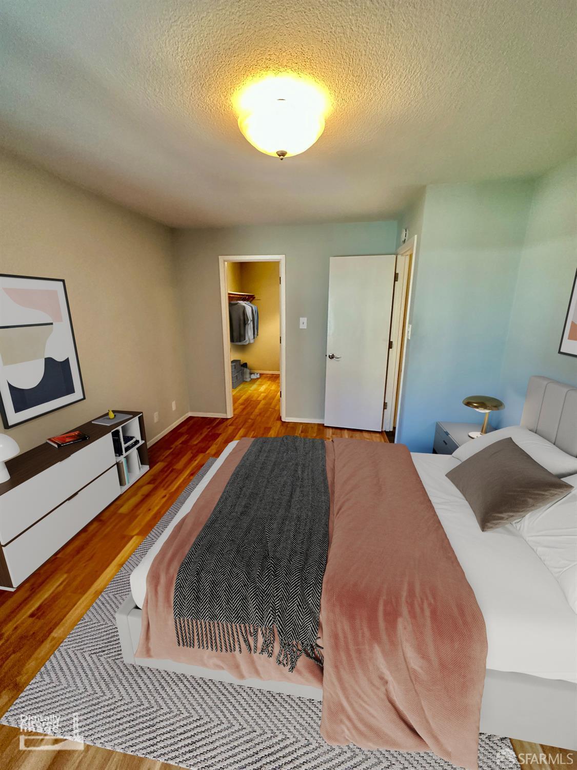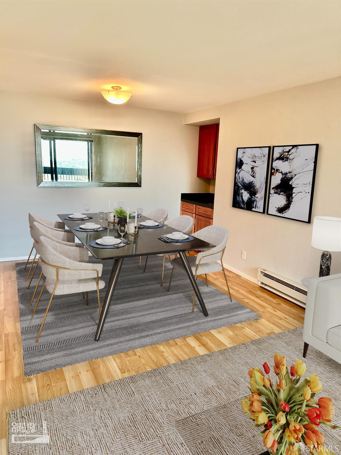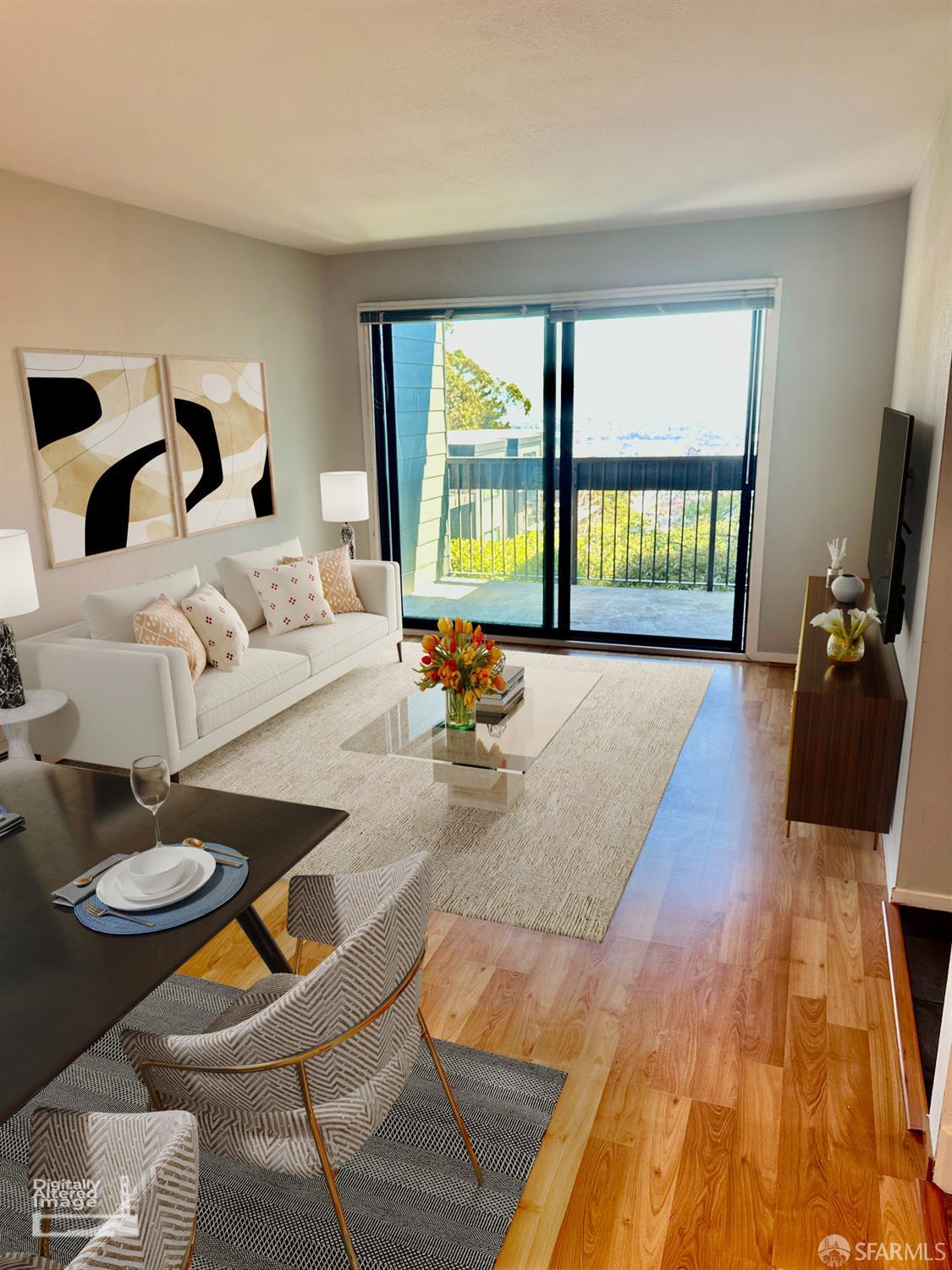 Pearched atop Diamond Heights, this 1-bedroom, 1-bath condominium features an attractive remodeled bathroom and an updated kitchen with stone countertops and shaker-style cabinets. The private balcony is perfect for morning coffee or relaxing evenings while taking in sweeping views of the San Francisco Bay and the city skyline. Inside, there is a generous entry hall with large storage closet. Warm wood flooring runs throughout the open-concept living/dining areas & bedroom. There are attractive tile floors in the entry and remodeled bathroom. The bath features a shower-over-tub, glass shower door, large storage vanity and dual flush toilet with decorative lighting. The spacious bedroom offers a peaceful retreat with ample room for a home/office space & has a large walk-in closet. Additional highlights include a community green-belt, convenient side-by-side parking, and shared laundry in the garage. Located a block from Diamond Heights Village shopping center with easy access to highways for commuting and public transit just outside your front door.